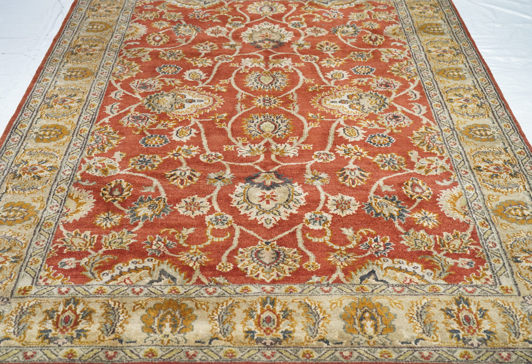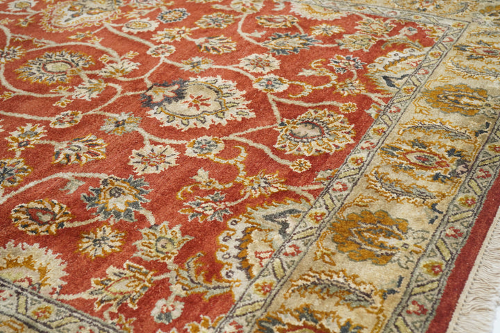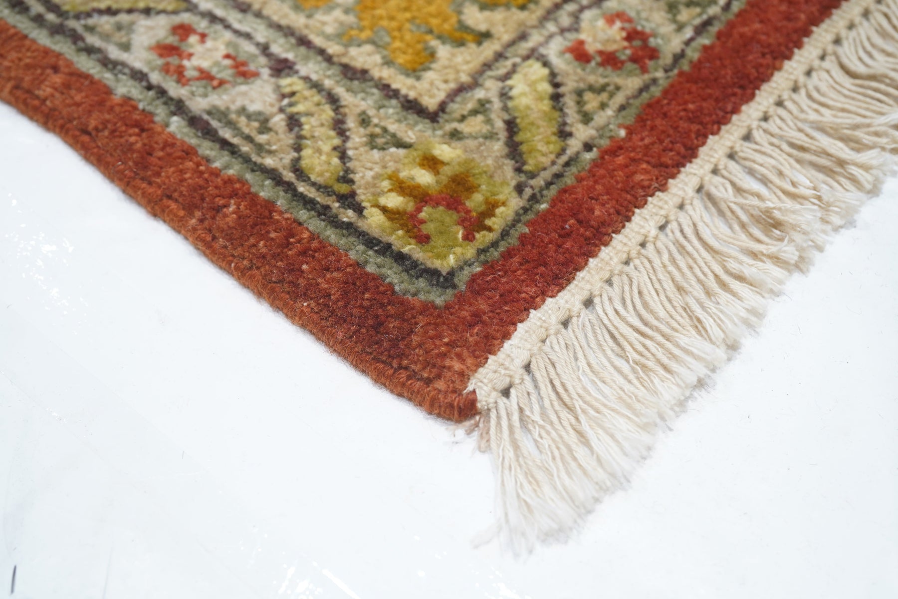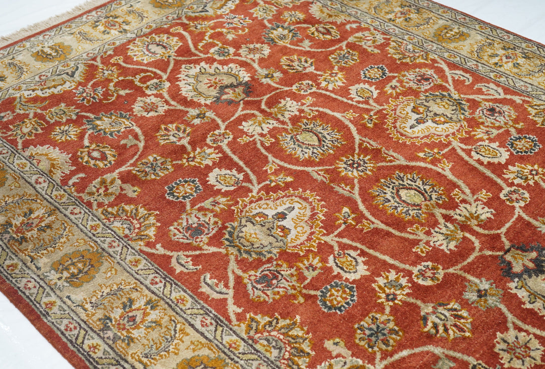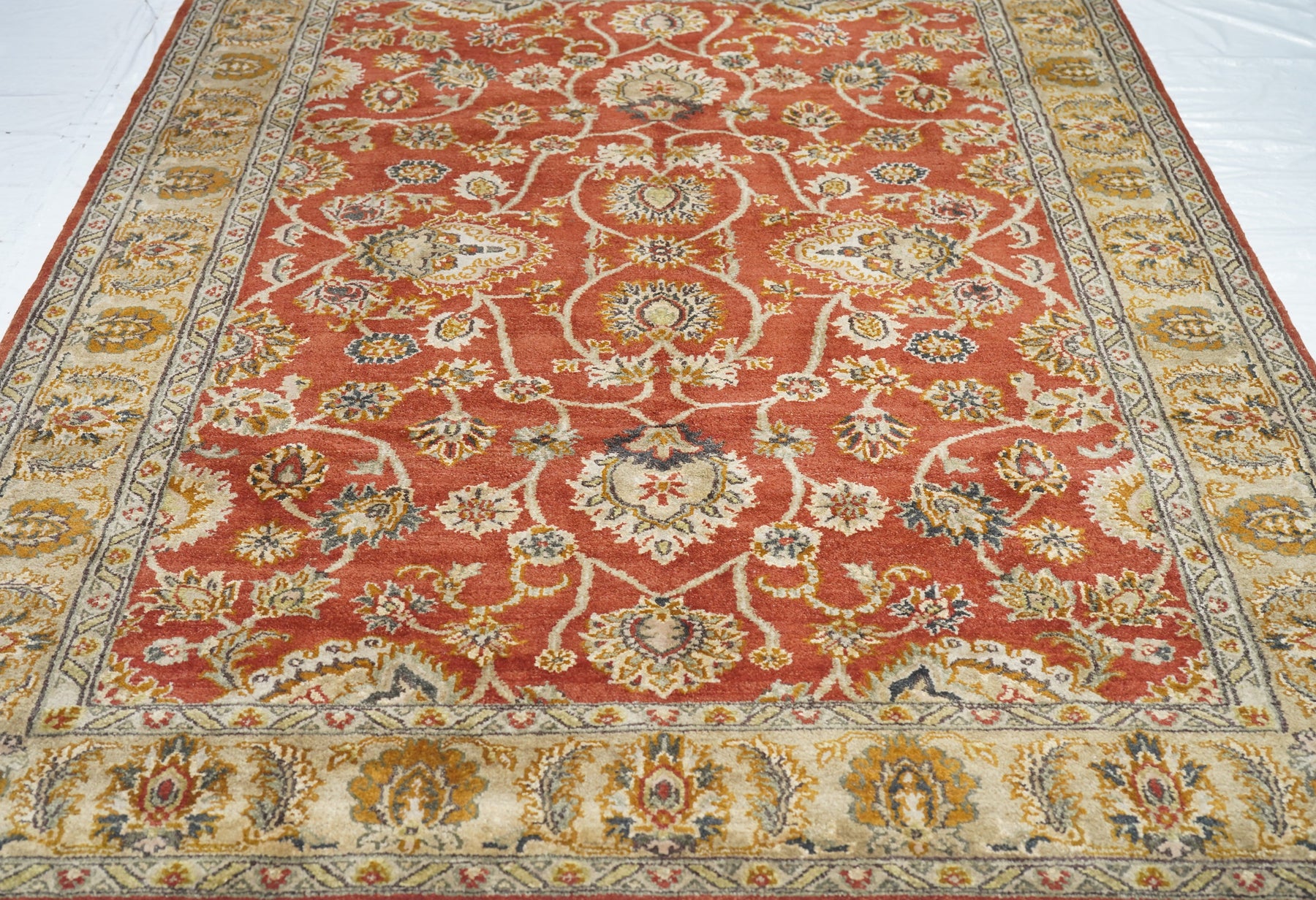 Palmettes point up. Palmettes point down. Palmettes flow all around on a vigorous vinery arabesque, on the brisk red field, accented in charcoal, light green, rust, ecru beige and dark red. Straw-camel border with complex ragged palmettes with equally ragged acanthus supporters, and simpler inward red palmettes. Cotton foundation, well-woven. Urban weave.