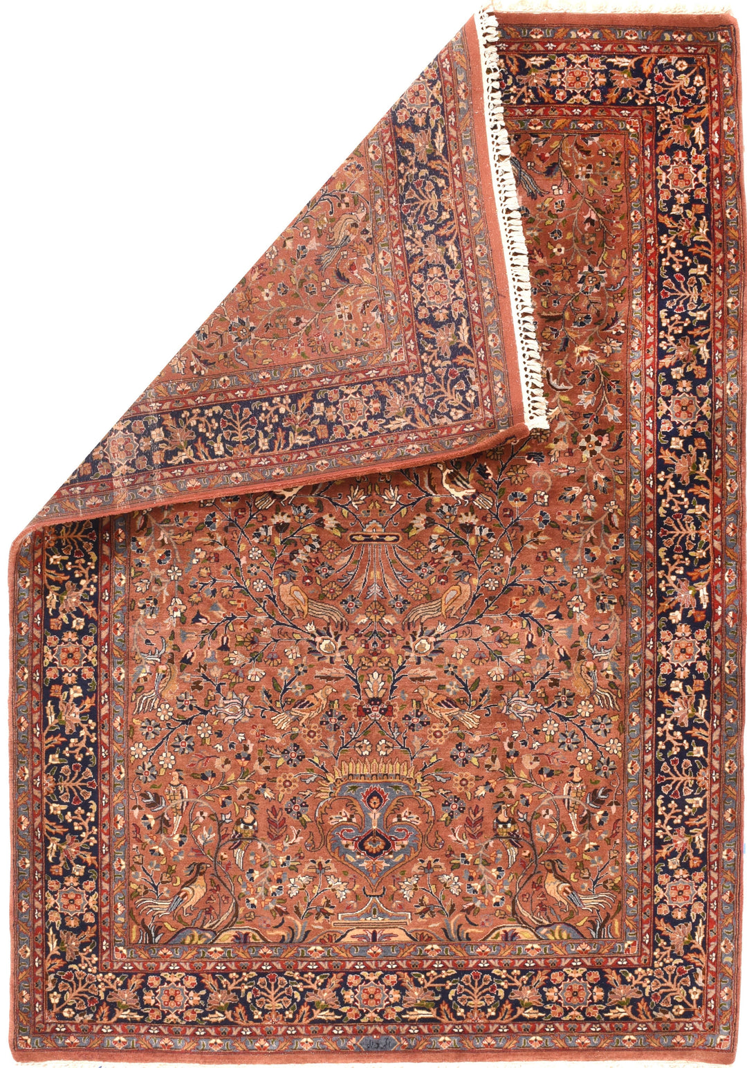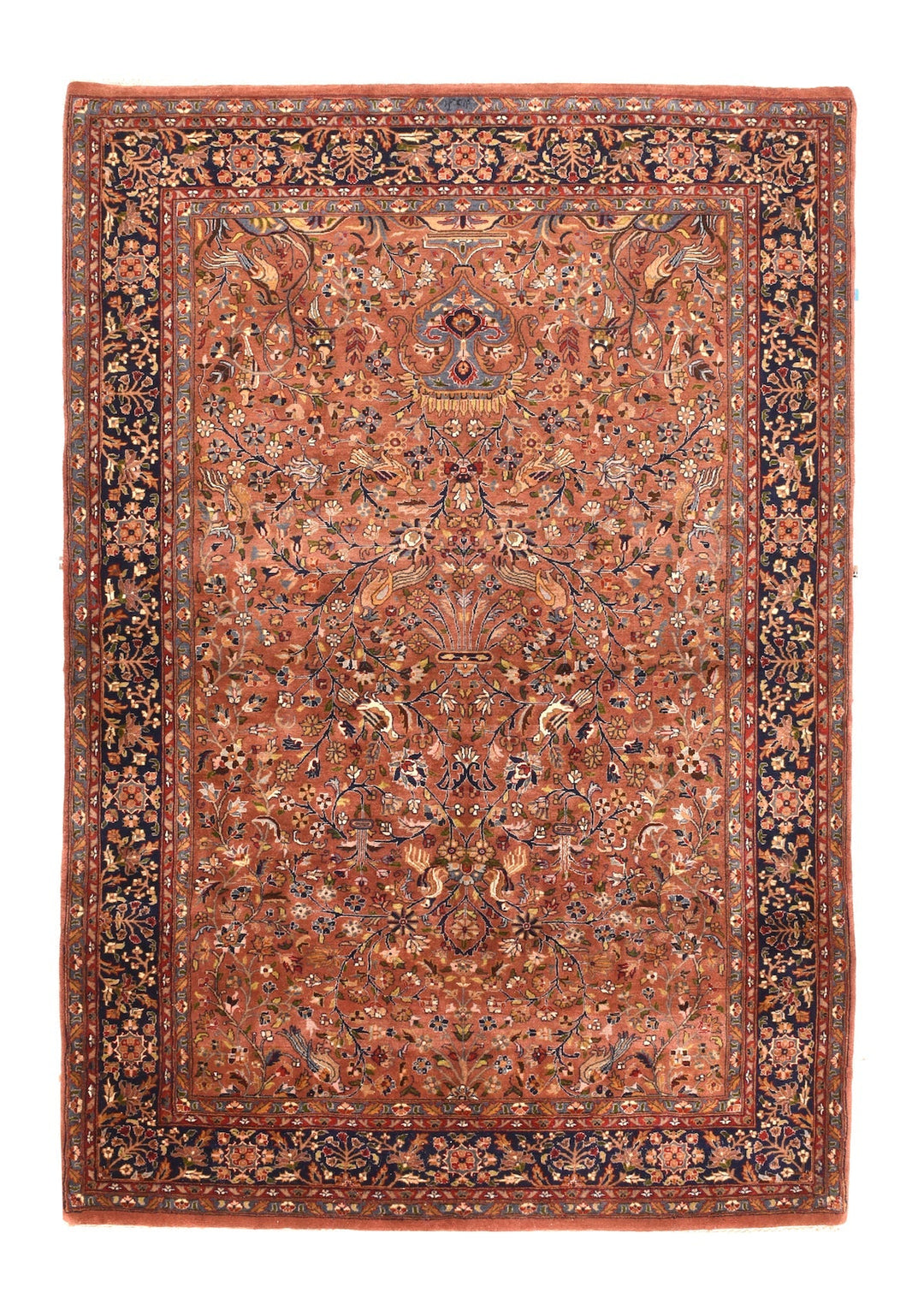 An Indo-Kashan or Indo-Sarouk with a red field supporting a directional design based in a flowering blue vase, and developing closely set vinery and florets, with pairs of accent birds. Yellow, lime and navy accents. Navy border with budding octogrammes, and complete, standing flowers which repeat in the corners as diagonals. Well-woven.
