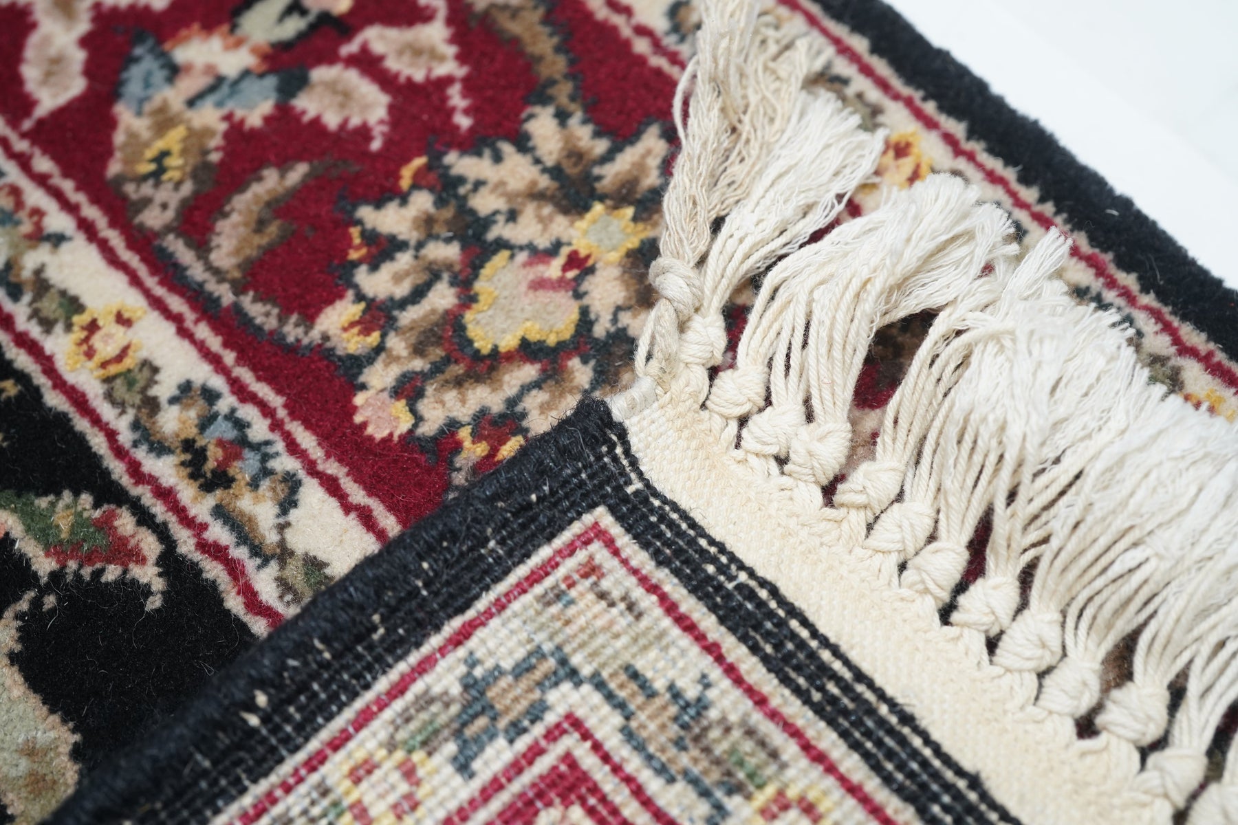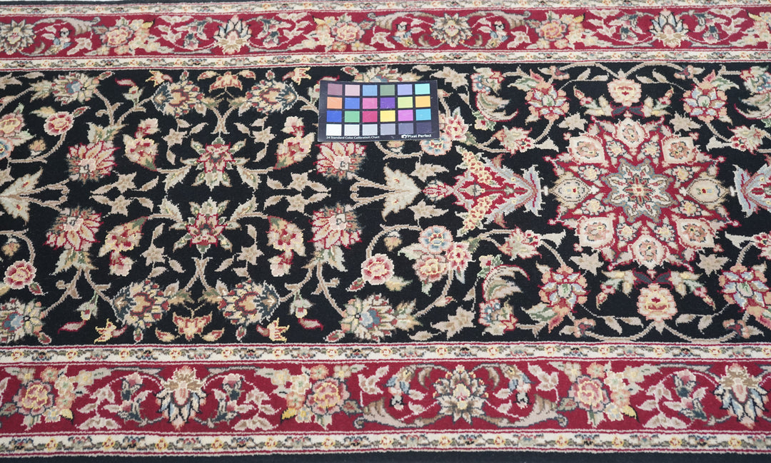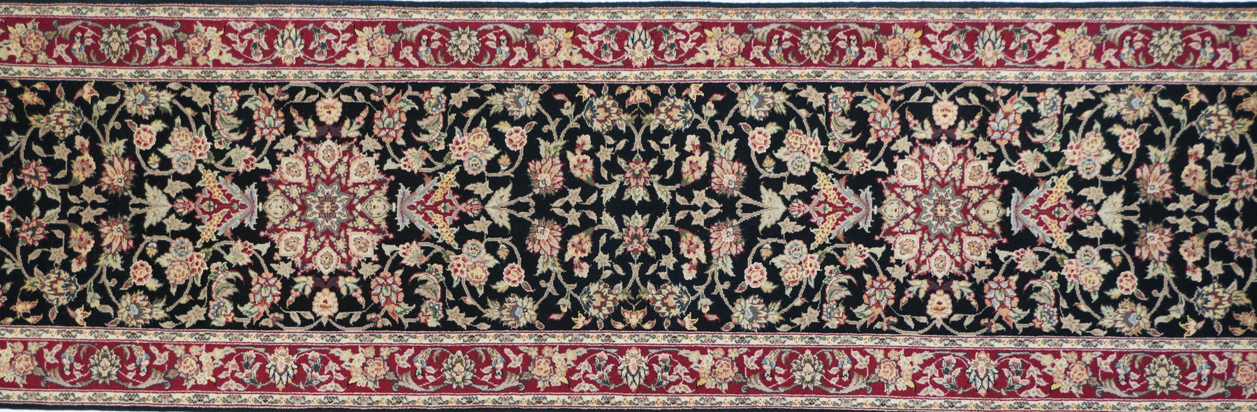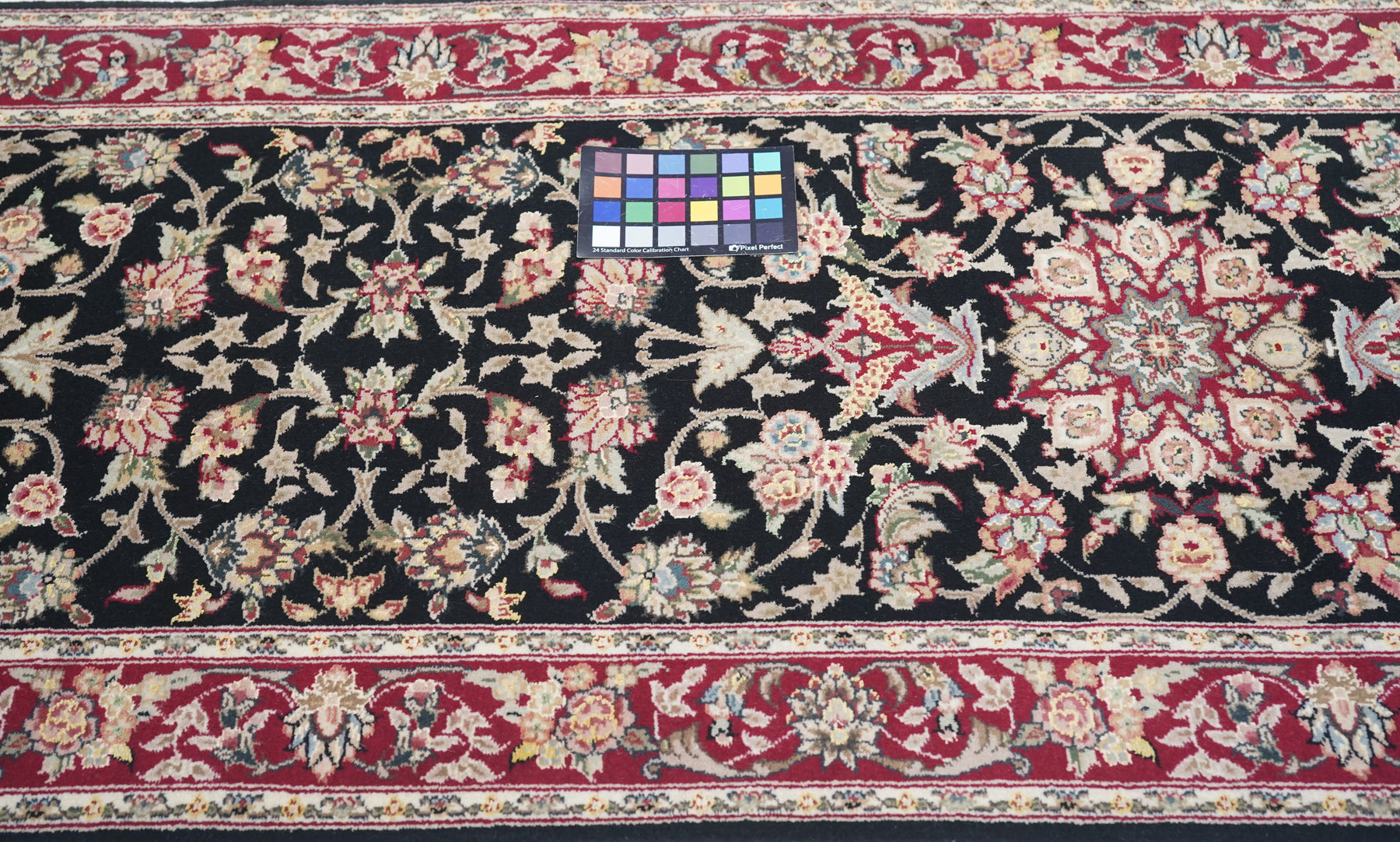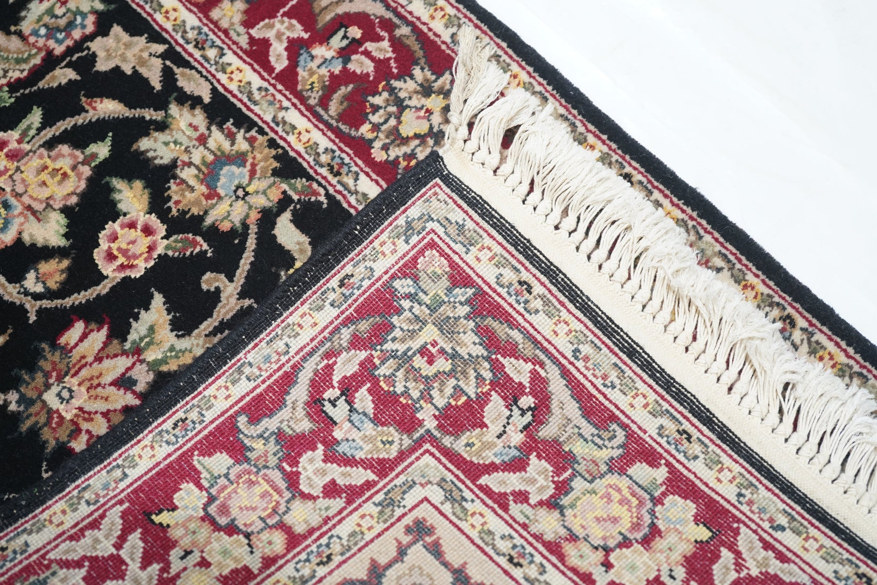 The straw corners with inward-projecting vases shape the near black field with its two round, inner red eight-point star medallions. The thick and vigorous arabesque volute vinery is anchored by single and double Tudor roses, petal palmettes and leaves. Unusual fanciful barbed leaf V-shaped constructions above and below central circles. Wine red border of petal palmettes, roses and mobile volute vinery. Moderately well woven on cotton.