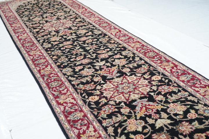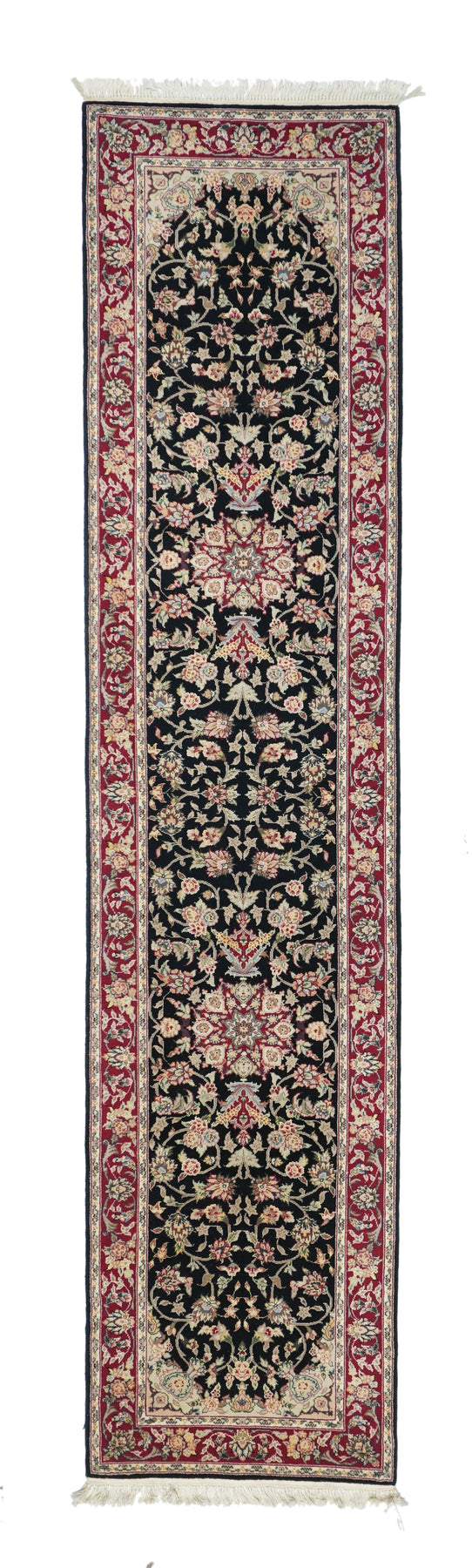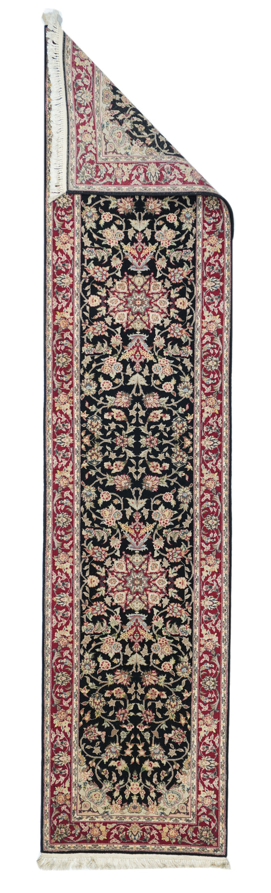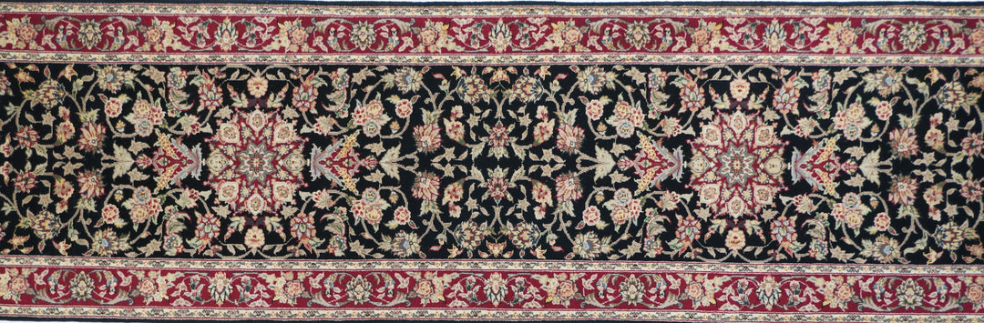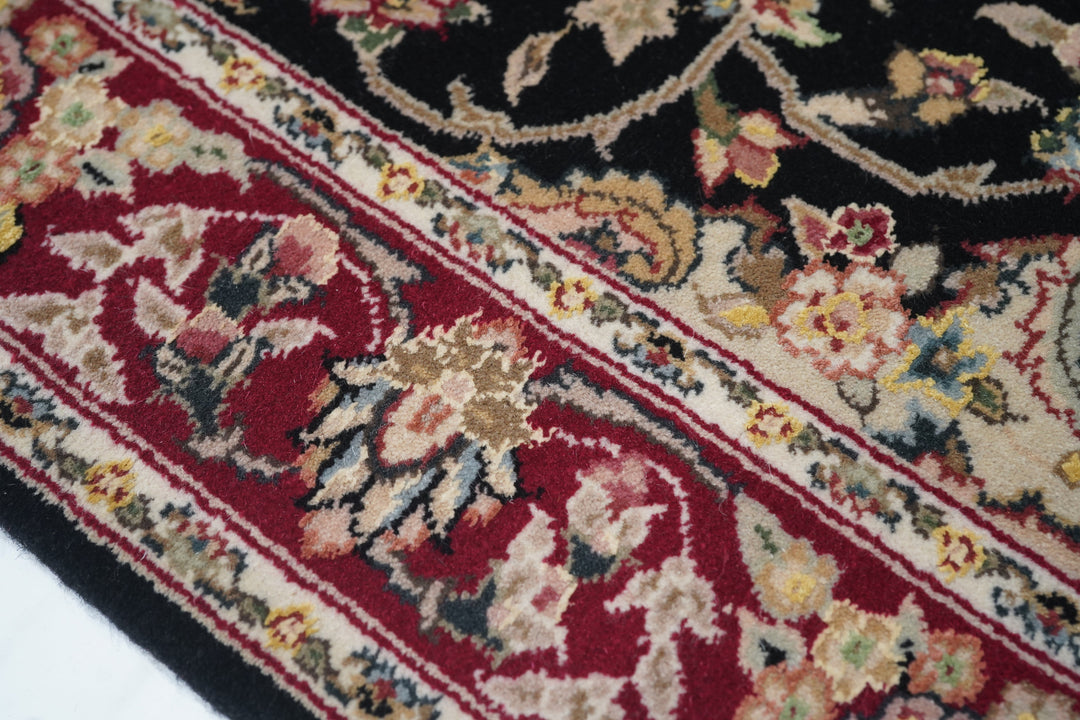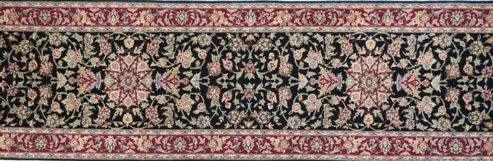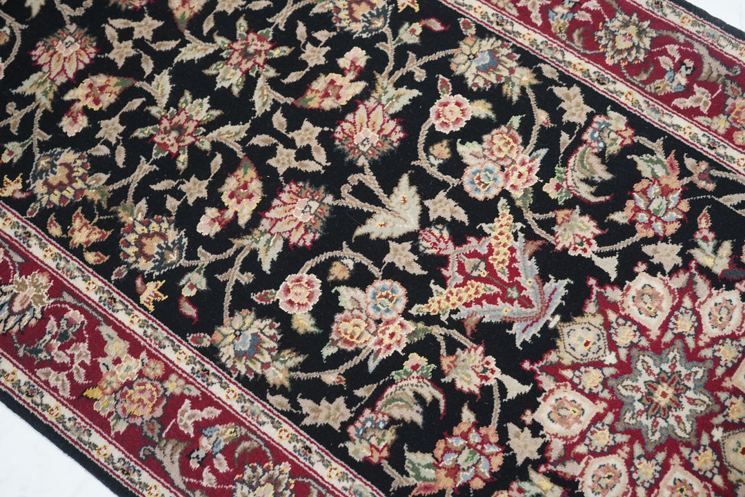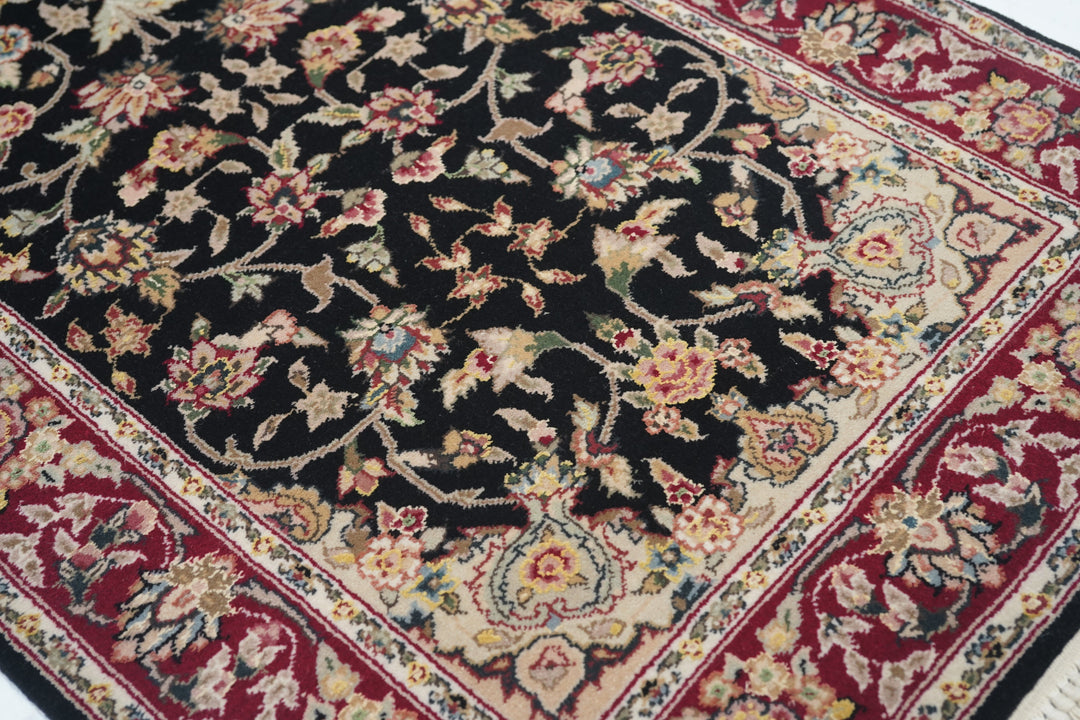 The straw corners with inward-projecting vases shape the near black field with its two round, inner red eight-point star medallions. The thick and vigorous arabesque volute vinery is anchored by single and double Tudor roses, petal palmettes and leaves. Unusual fanciful barbed leaf V-shaped constructions above and below central circles. Wine red border of petal palmettes, roses and mobile volute vinery. Moderately well woven on cotton.