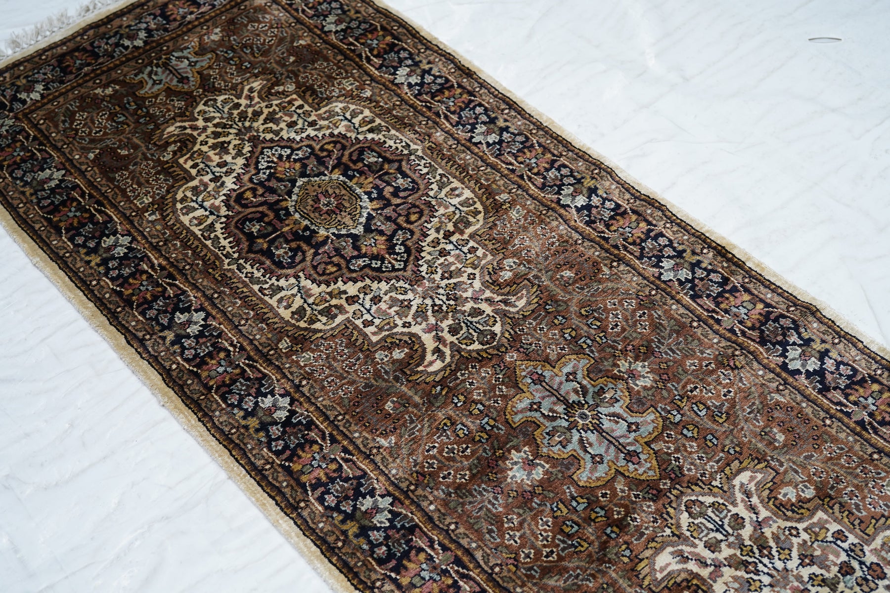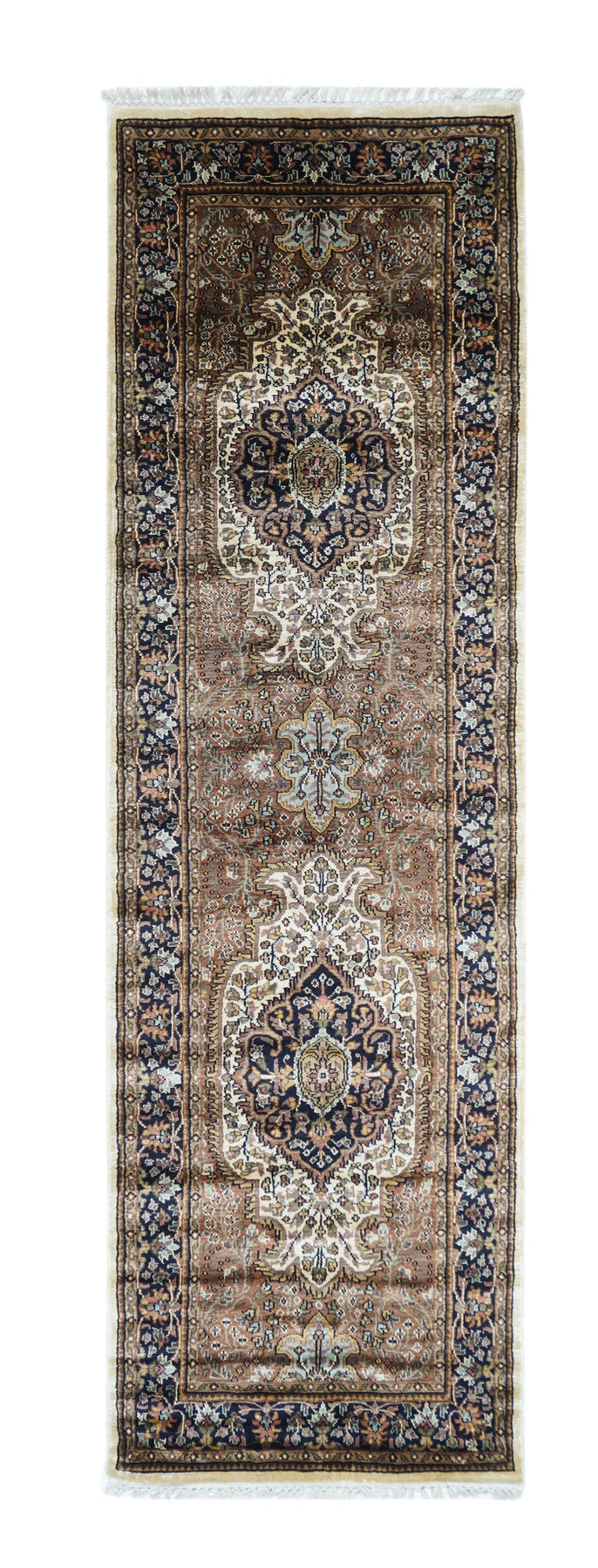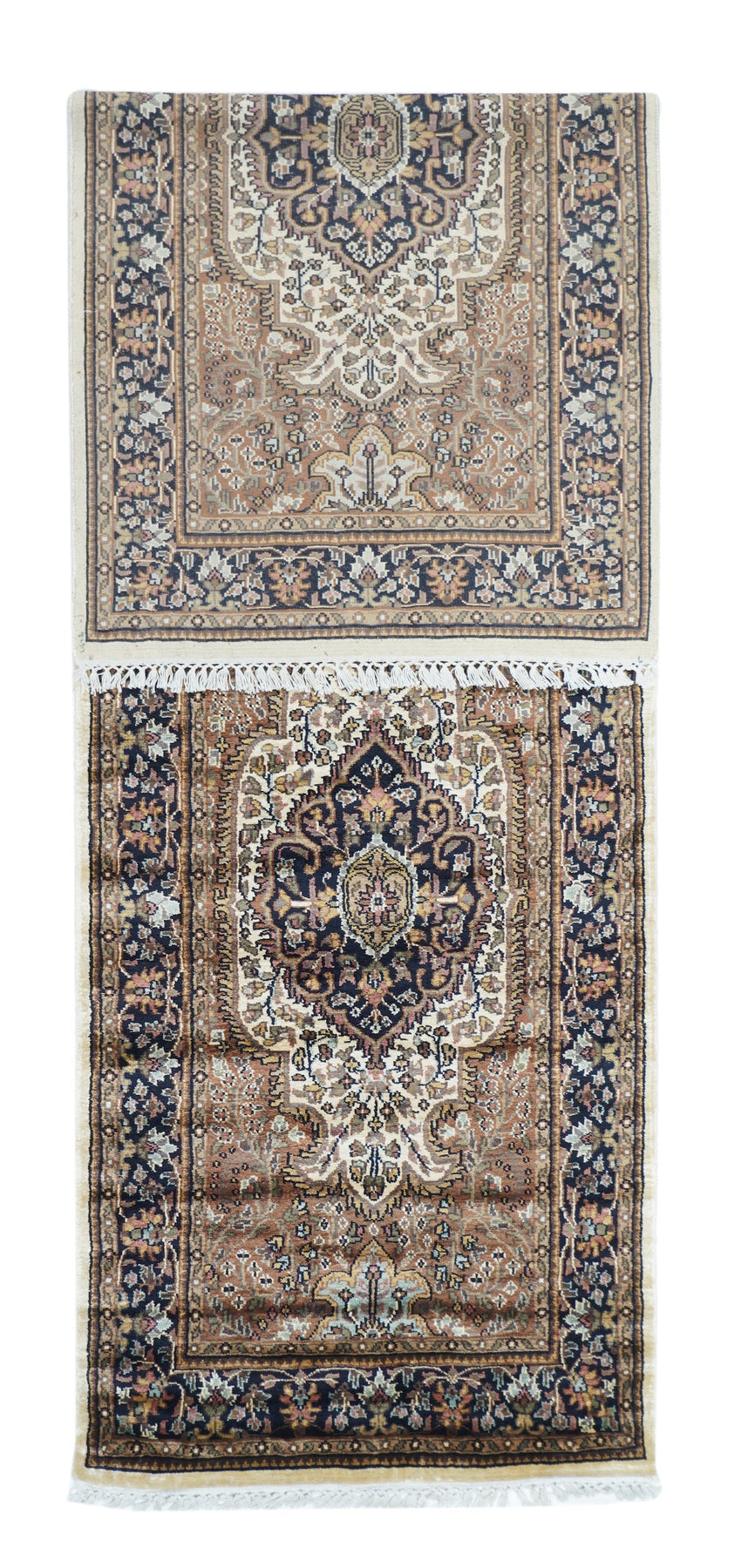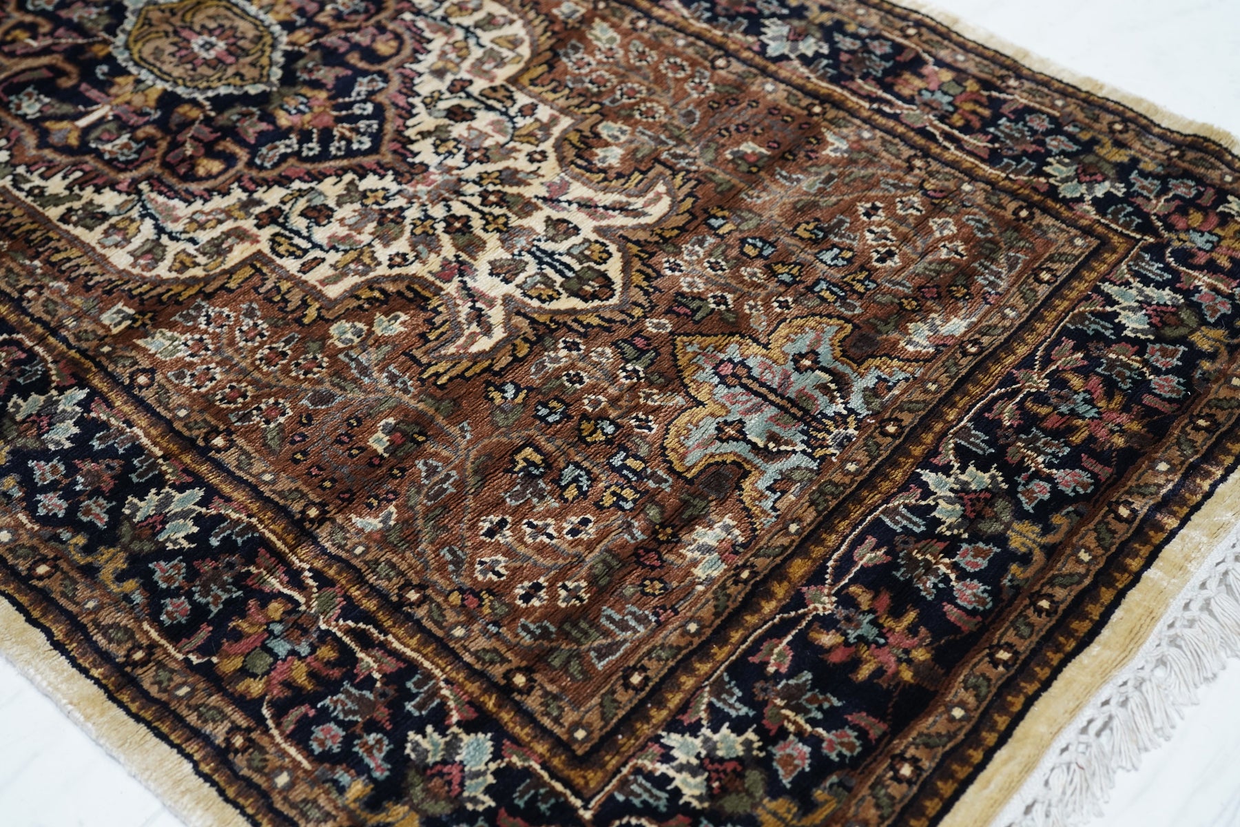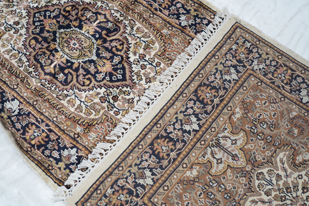 The area of northern India, responsible once (17th-early 19th centuries) for very finely knotted rugs with Kashmir goat wool pile, now weaving embroidered and pile carpets in a variety of Persianate allover and medallion formats, curvilinear andtraditional. Medium weaves. Moderate price.