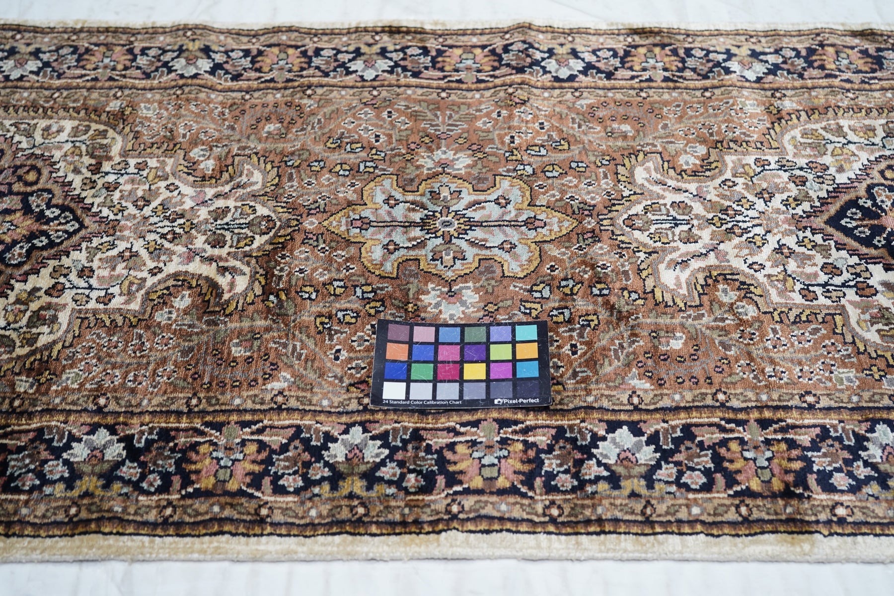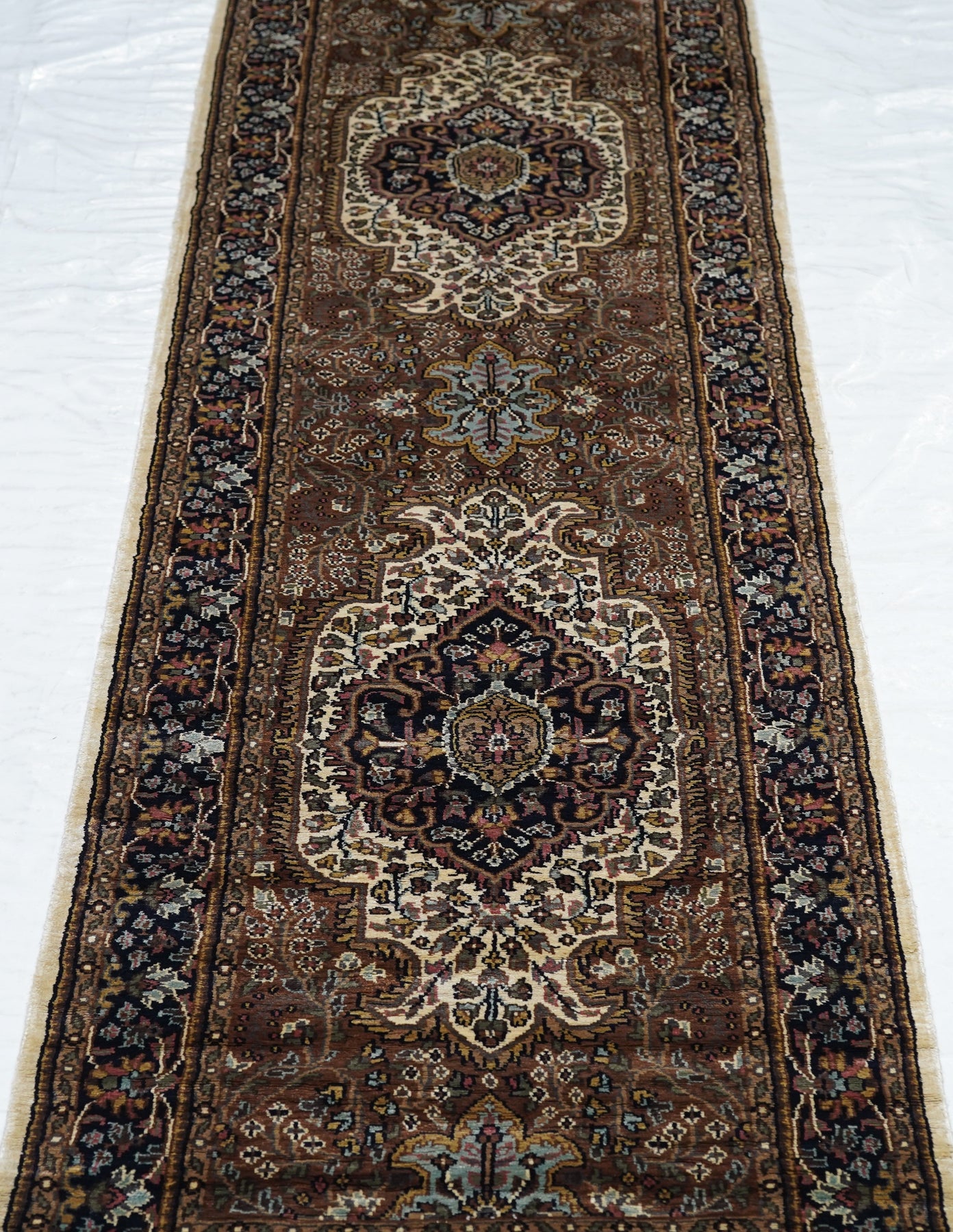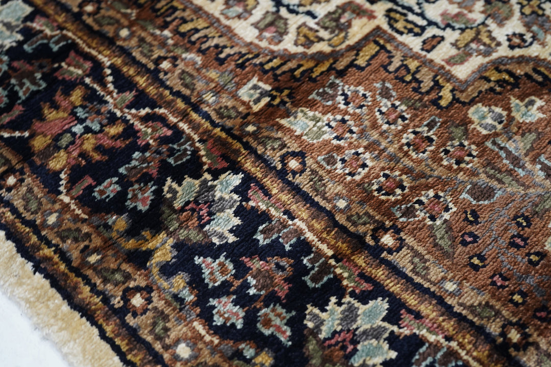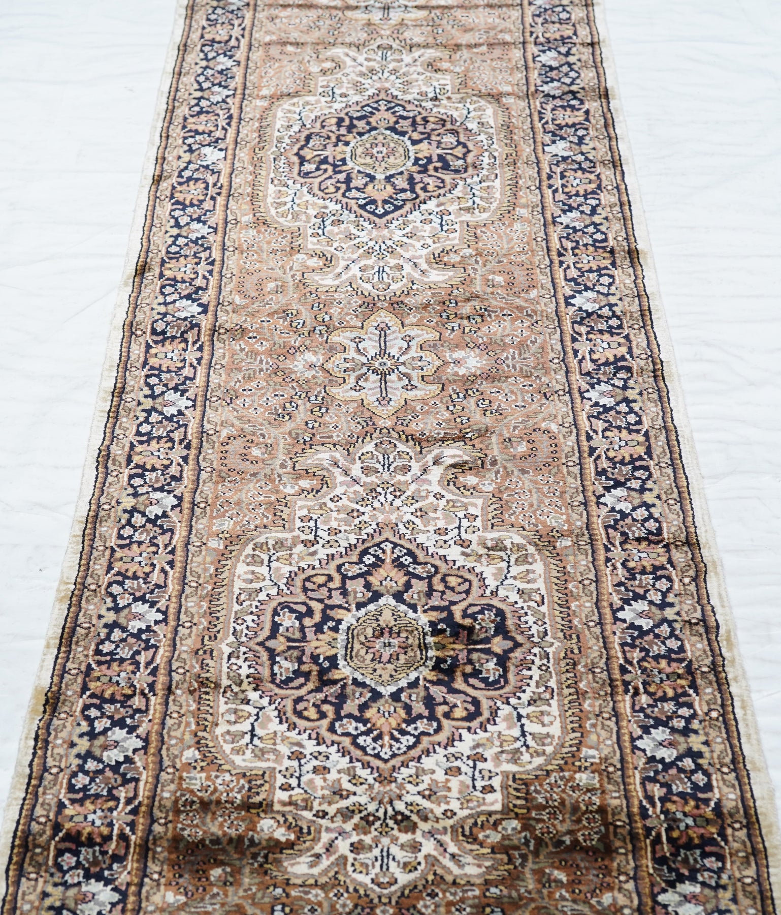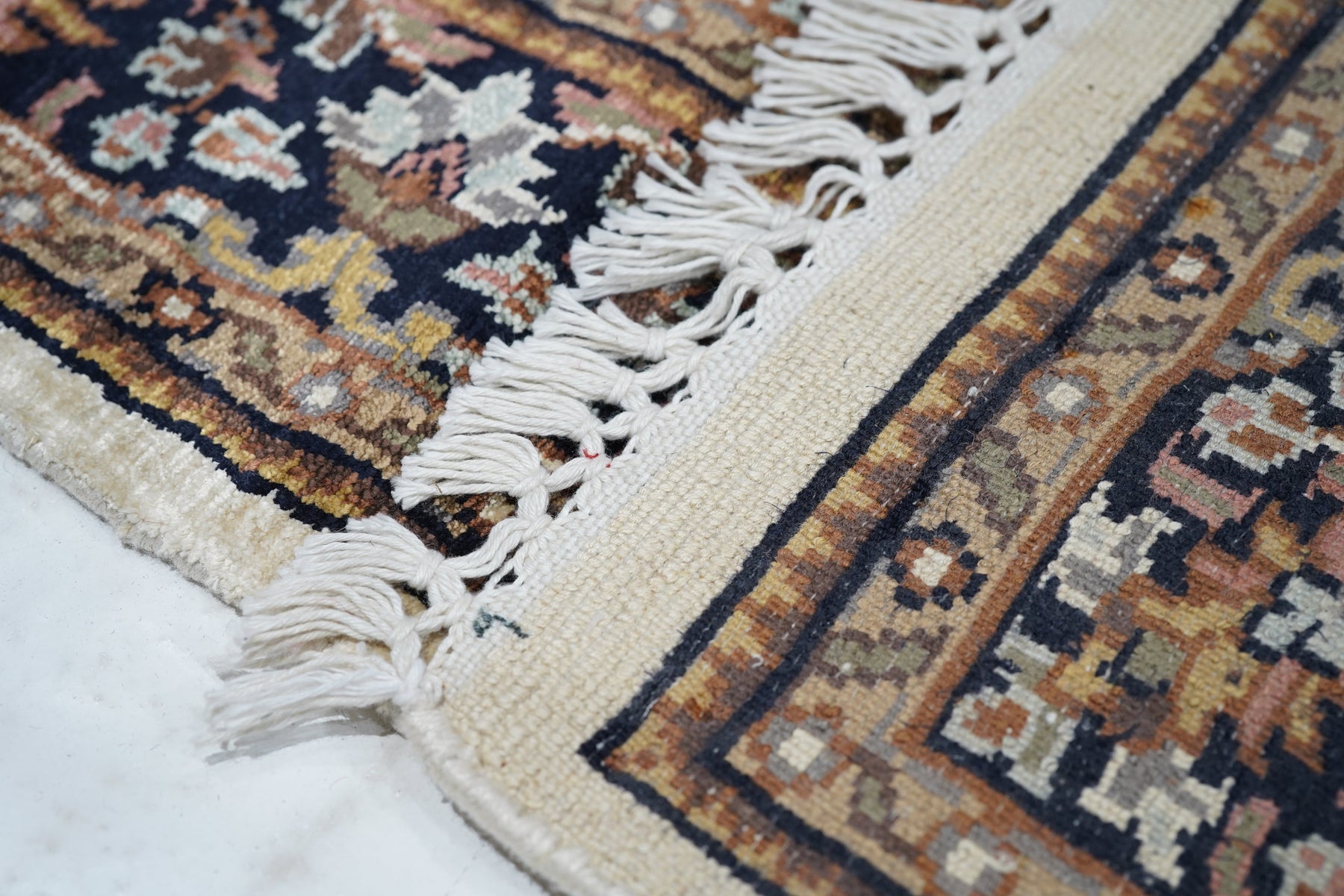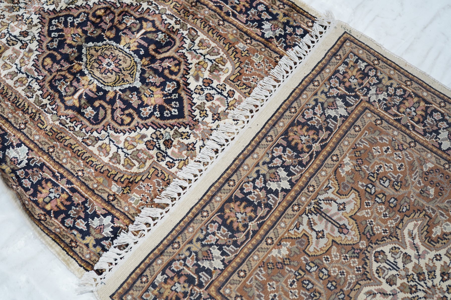 The area of northern India, responsible once (17th-early 19th centuries) for very finely knotted rugs with Kashmir goat wool pile, now weaving embroidered and pile carpets in a variety of Persianate allover and medallion formats, curvilinear andtraditional. Medium weaves. Moderate price.