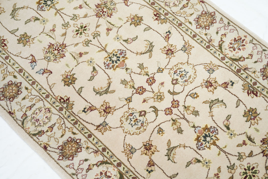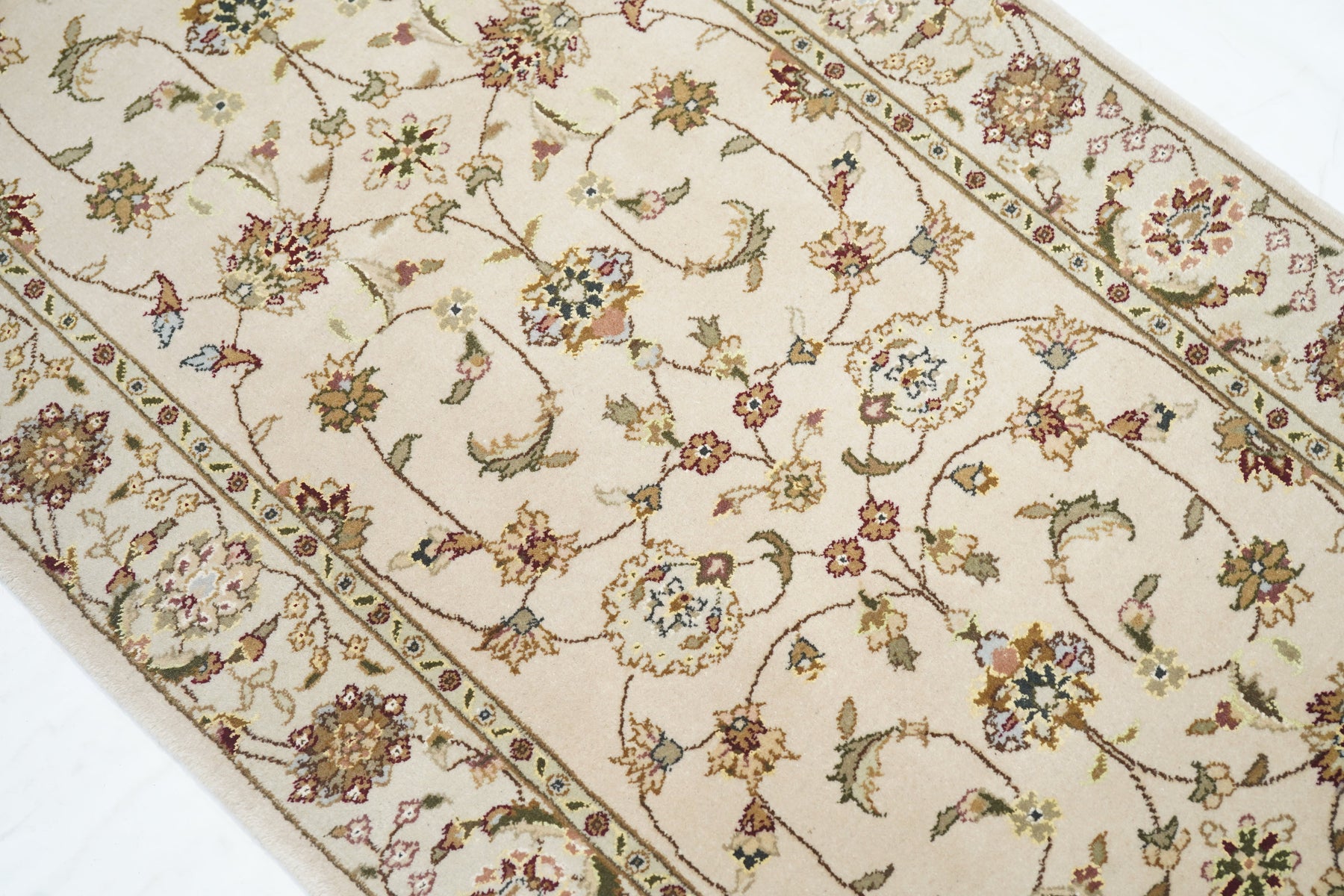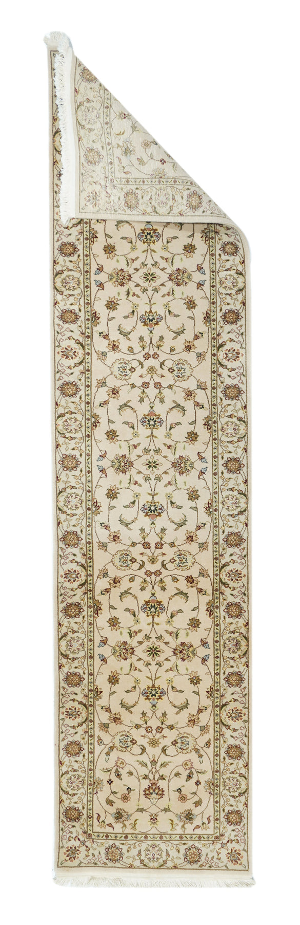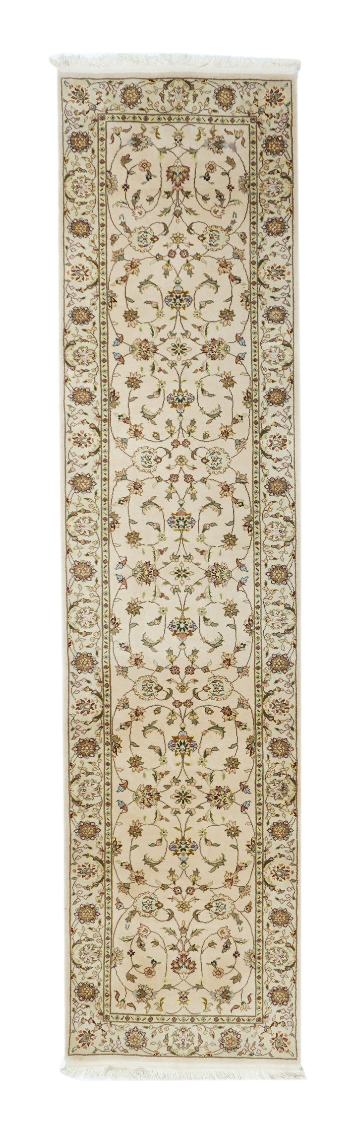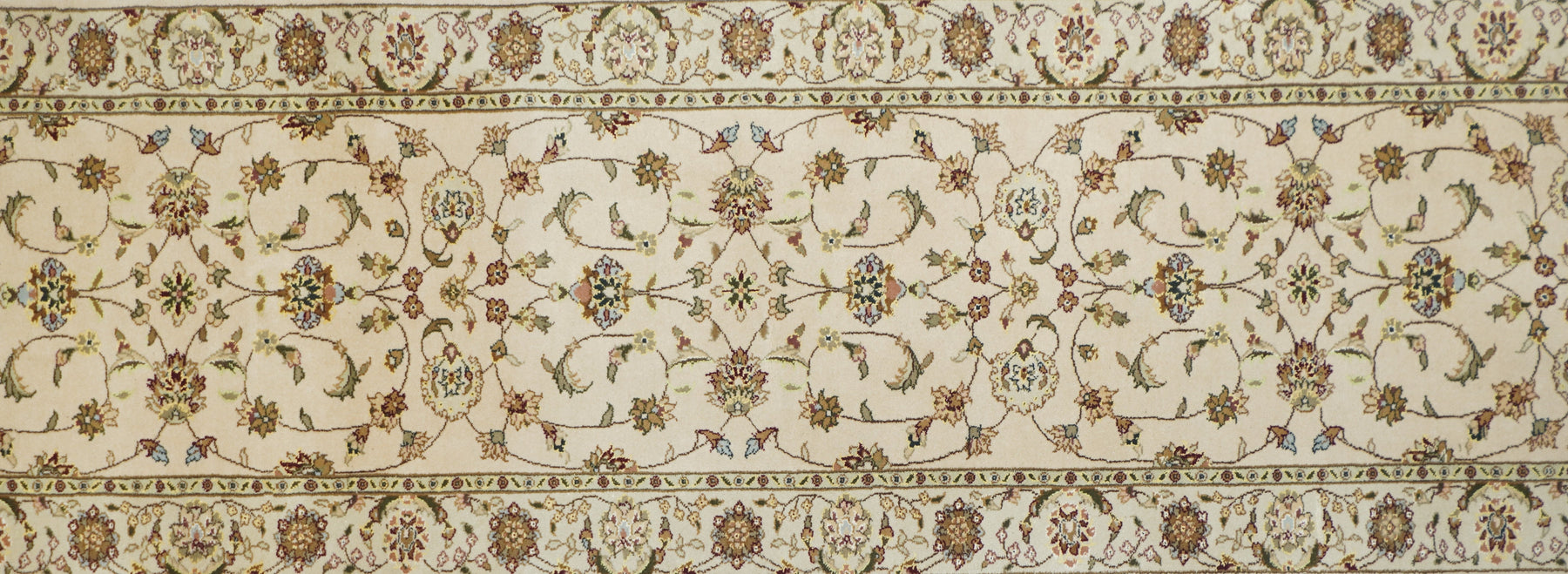 This well-woven urban style kenare (runner) employs the ever-popular coiling arabesque (islimi) pattern anchored by flame and ragged petal palmettes, and hosting a secondary array of barbed leaves, rosettes and little profile flowers, all on a straw ground. The matching straw border shows palmettes and complex rosettes and budding vine stems.