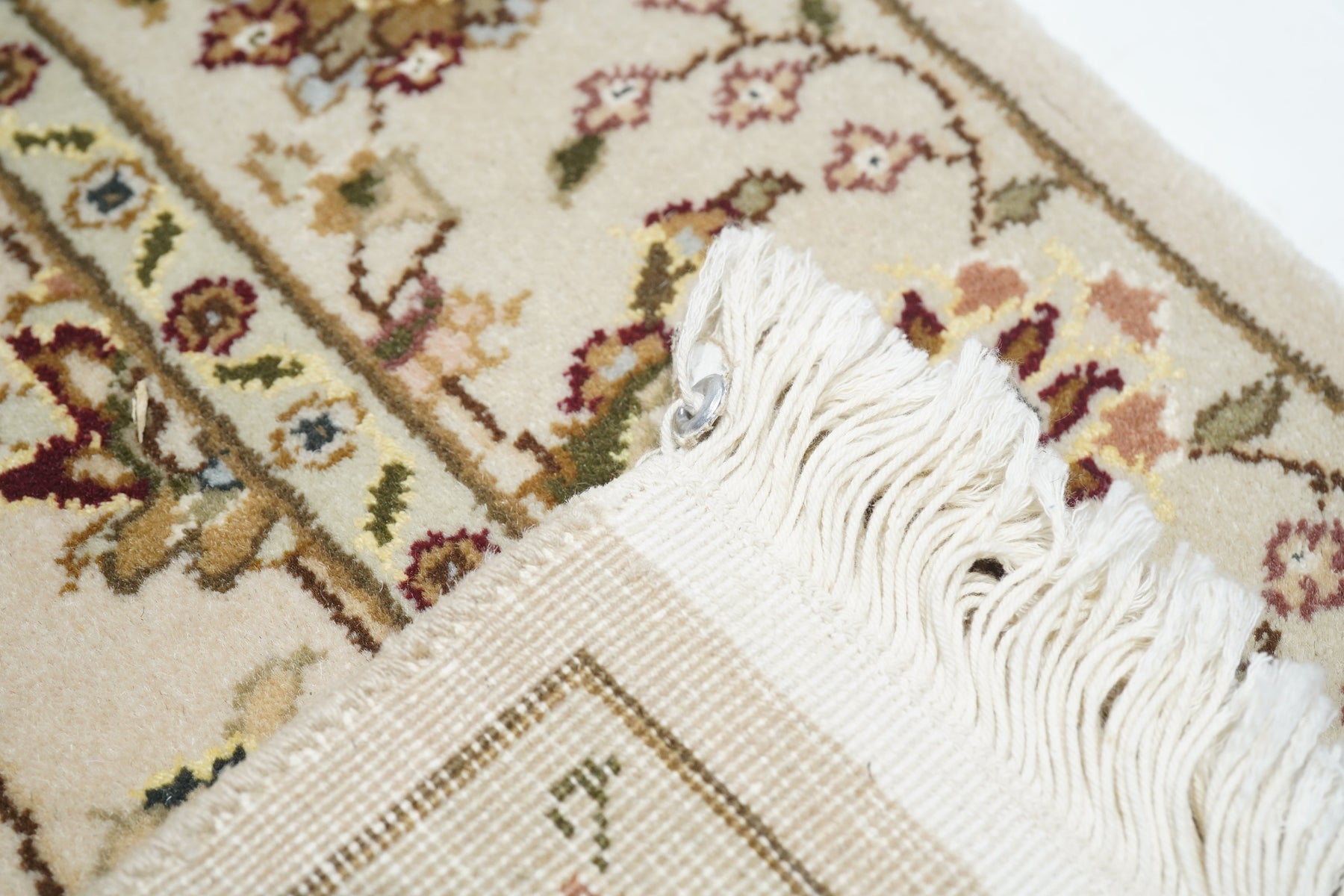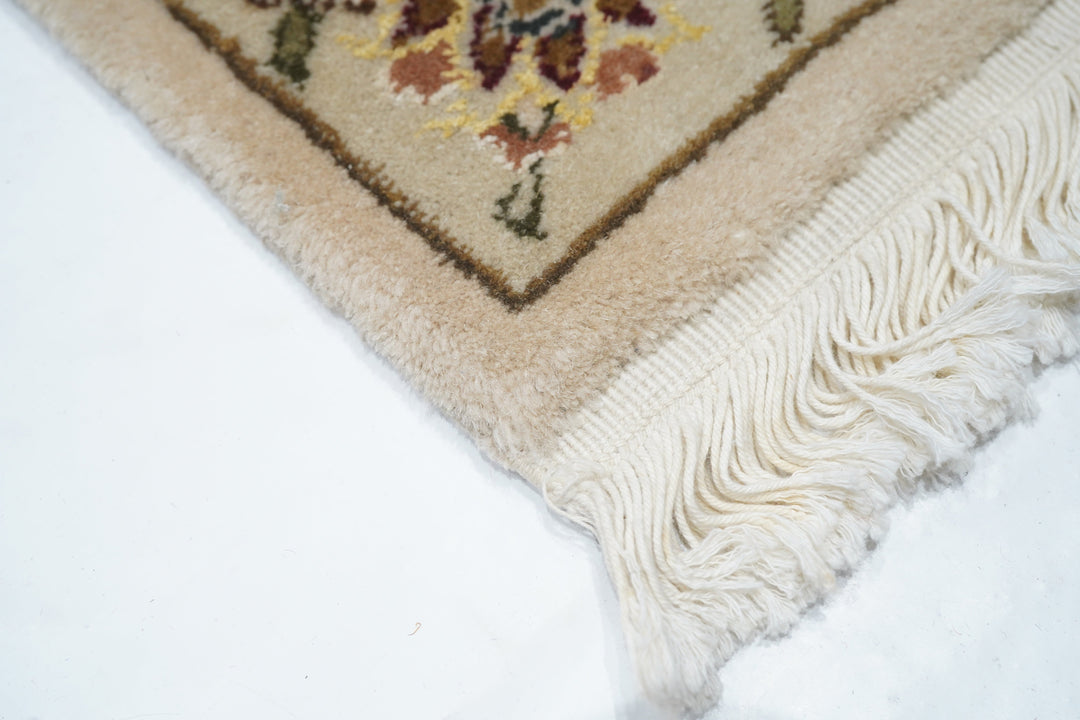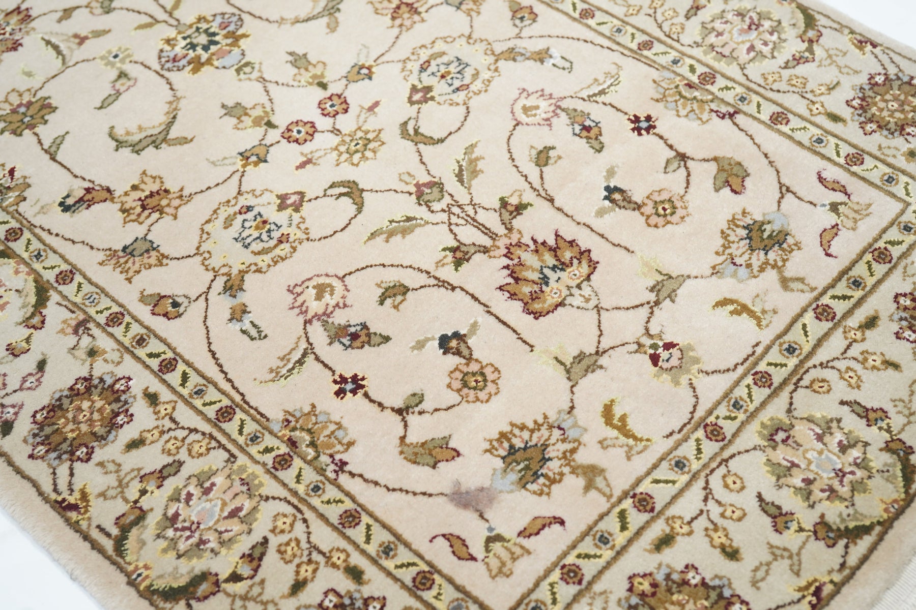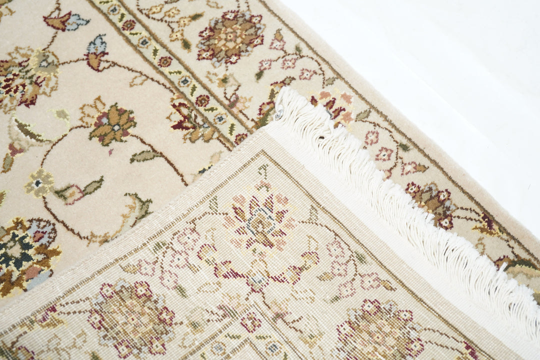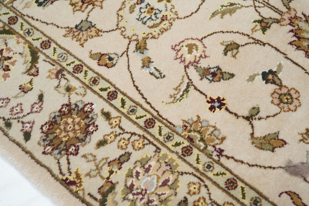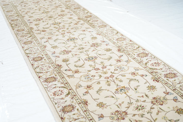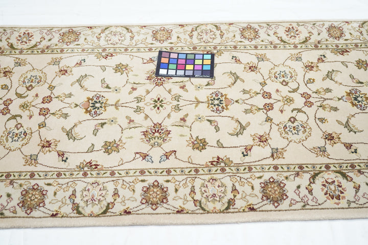This well-woven urban style kenare (runner) employs the ever-popular coiling arabesque (islimi) pattern anchored by flame and ragged petal palmettes, and hosting a secondary array of barbed leaves, rosettes and little profile flowers, all on a straw ground. The matching straw border shows palmettes and complex rosettes and budding vine stems.