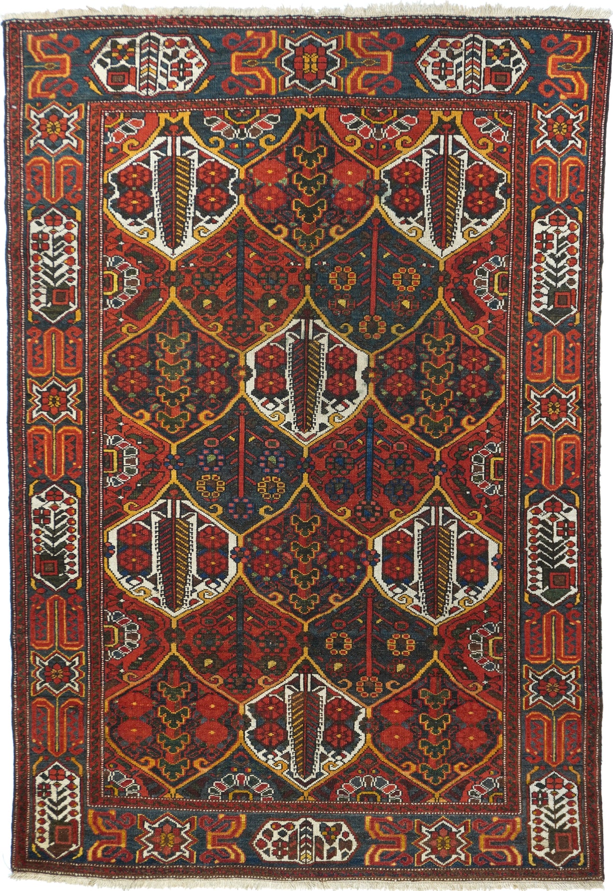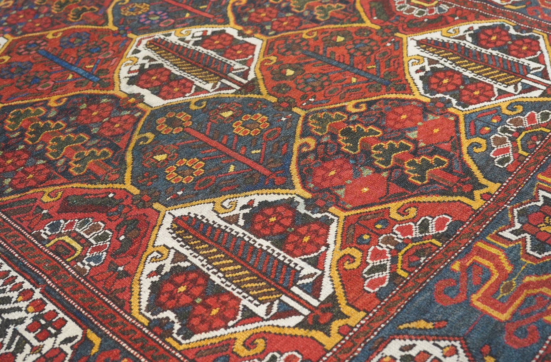 This a classic, cotton foundation, Chahar Mahal/"Bakhtiari" scatter with an allover large one-way scale pattern in which the yellow bounded panels in ecru, blue-green and red feature cypresses, standing whole flowers, blossom assemblies and petal rosettes. Main blue-green border of eggshell cartouches with flowers, some feathery, and deep tulipoid motives. A 17th century Kerman "Vase carpet" pattern is the ultimate pattern source. Good condition.