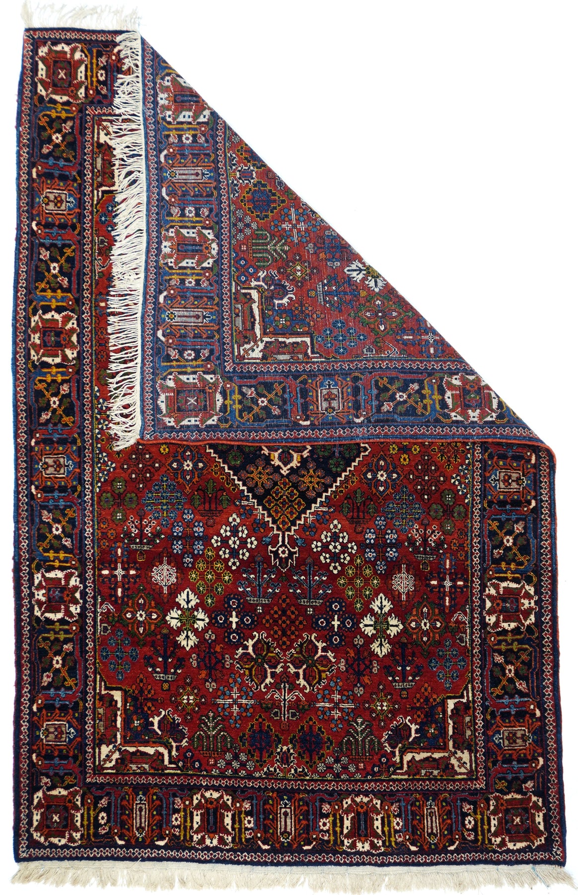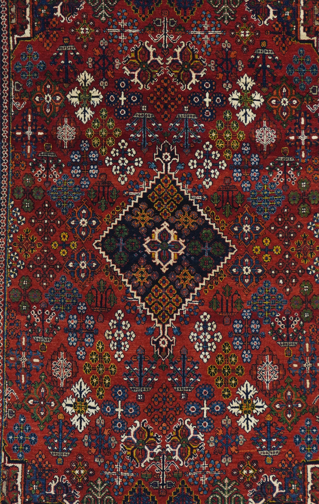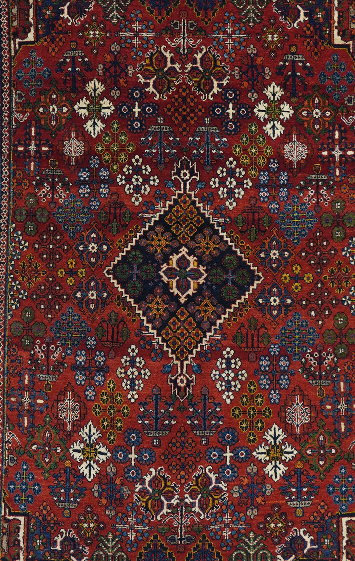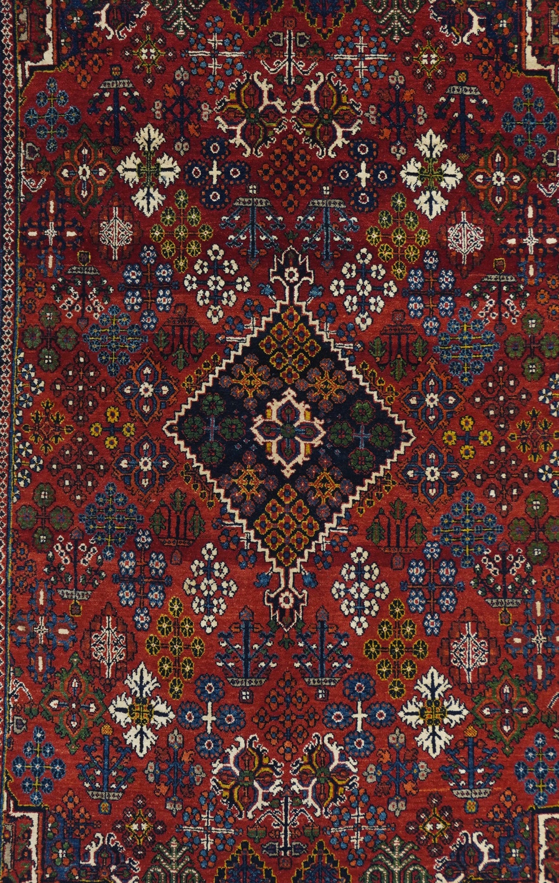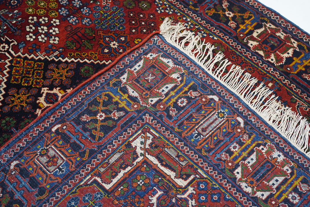 Joshogan (Joshagan), in central Persia specializes in only a few designs, especially one derived from Safavid originals, consisting of diamond or lozenge-shaped floret arrays, often around a central contrasting, design en suite small medallion. Usually red field, dark blue medallion, as here. Forked and bent leaf corners. Characteristic dark blue border of palmettes and stiff, tip-bent leaves. Cotton foundation, asymmetric knots. Good condition.