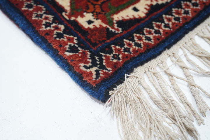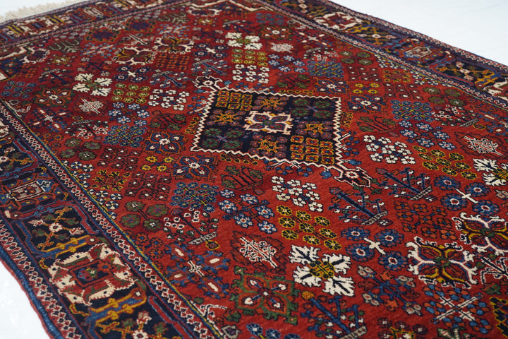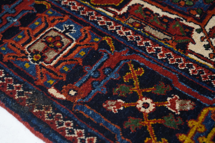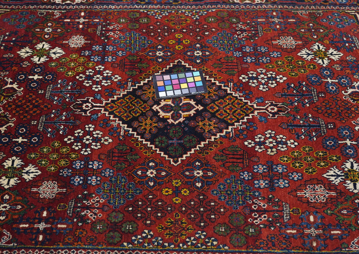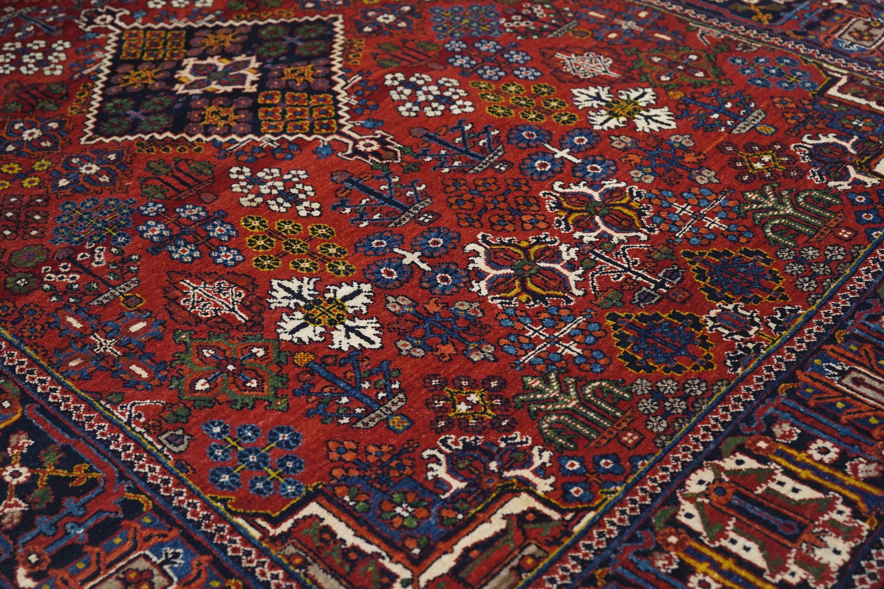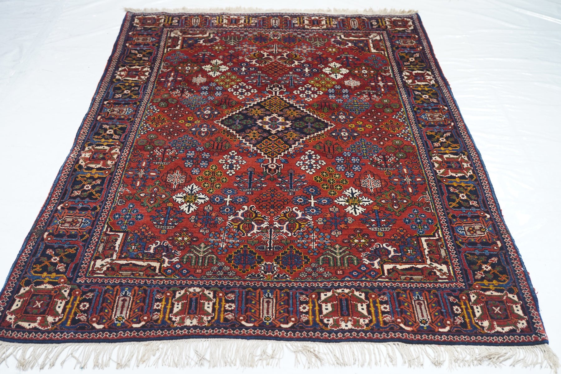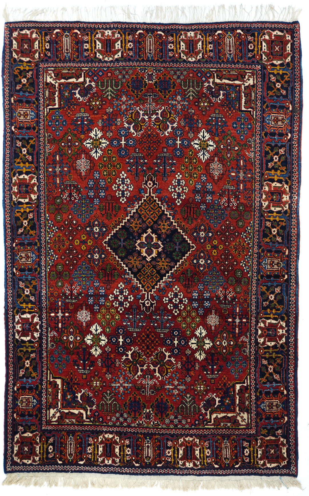 Joshogan (Joshagan), in central Persia specializes in only a few designs, especially one derived from Safavid originals, consisting of diamond or lozenge-shaped floret arrays, often around a central contrasting, design en suite small medallion. Usually red field, dark blue medallion, as here. Forked and bent leaf corners. Characteristic dark blue border of palmettes and stiff, tip-bent leaves. Cotton foundation, asymmetric knots. Good condition.
