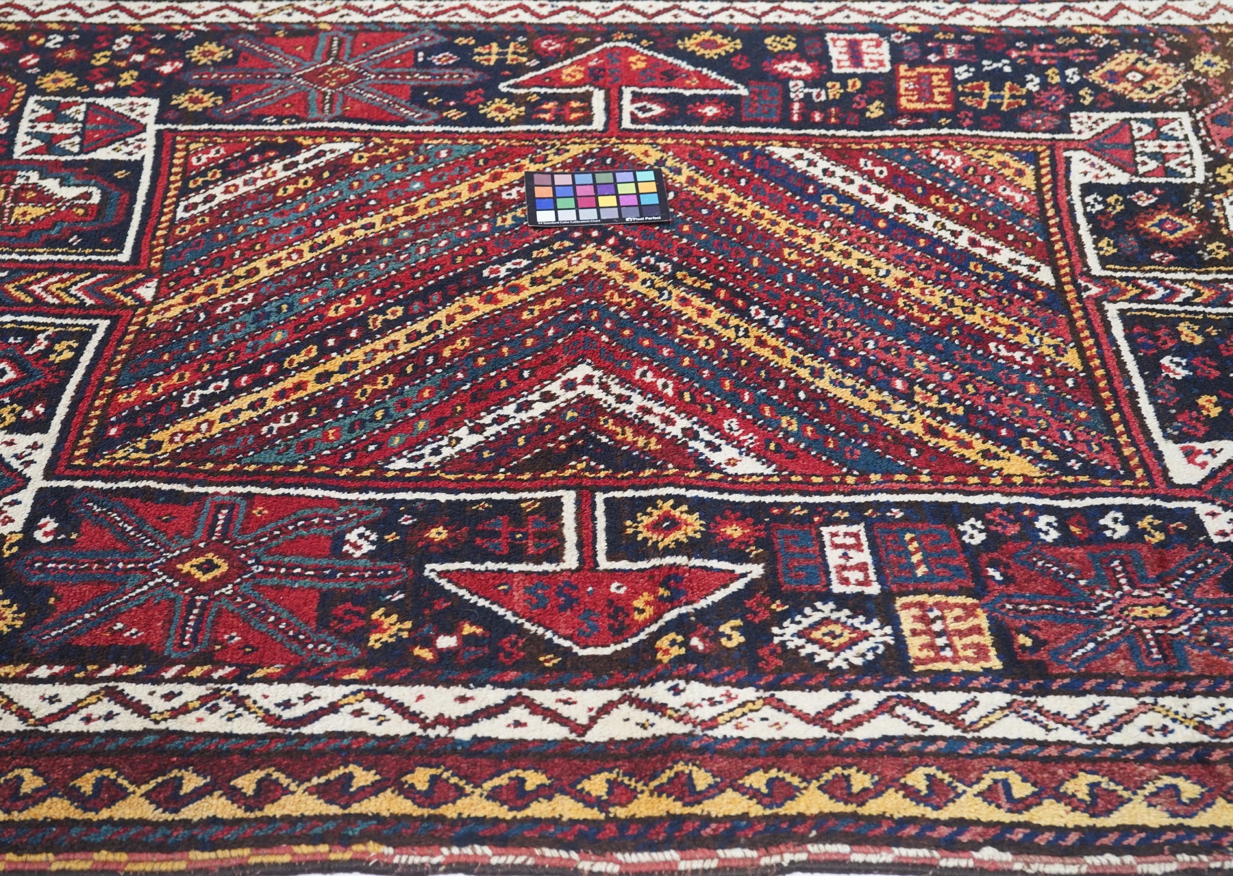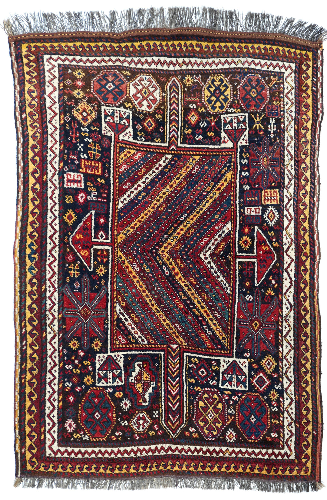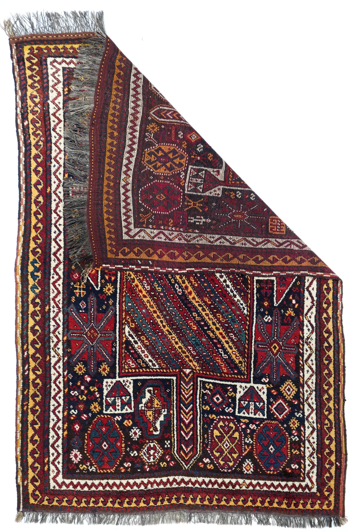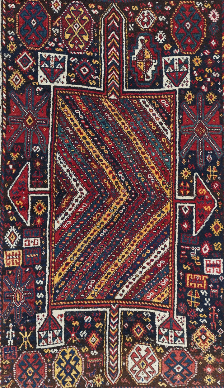 This rare NE Persian tribal scatter shows a rectangular, upright "pool" with a sideways polychrome chevron pattern in yellow, red, green, ecru and dark blue, Arrow heads project laterally and chromed spikes project vertically. Navy background with octagons, guls and other Turkmen-derived elements. Narrow ivory zig-zag border. Wool foundation. Moderate weave. Good condition.