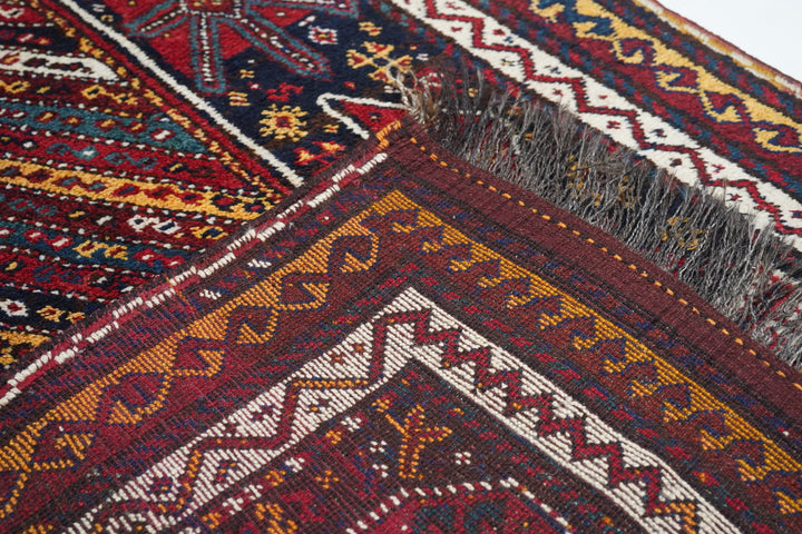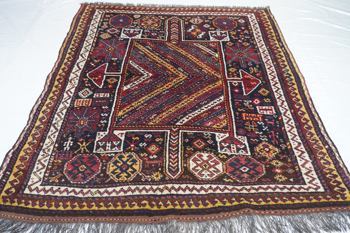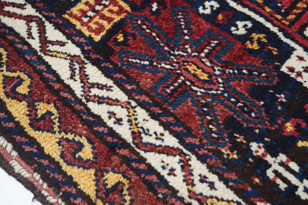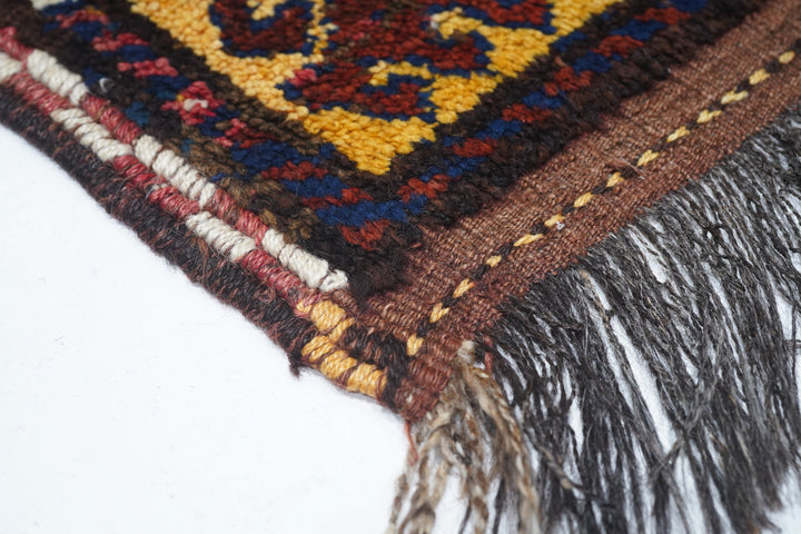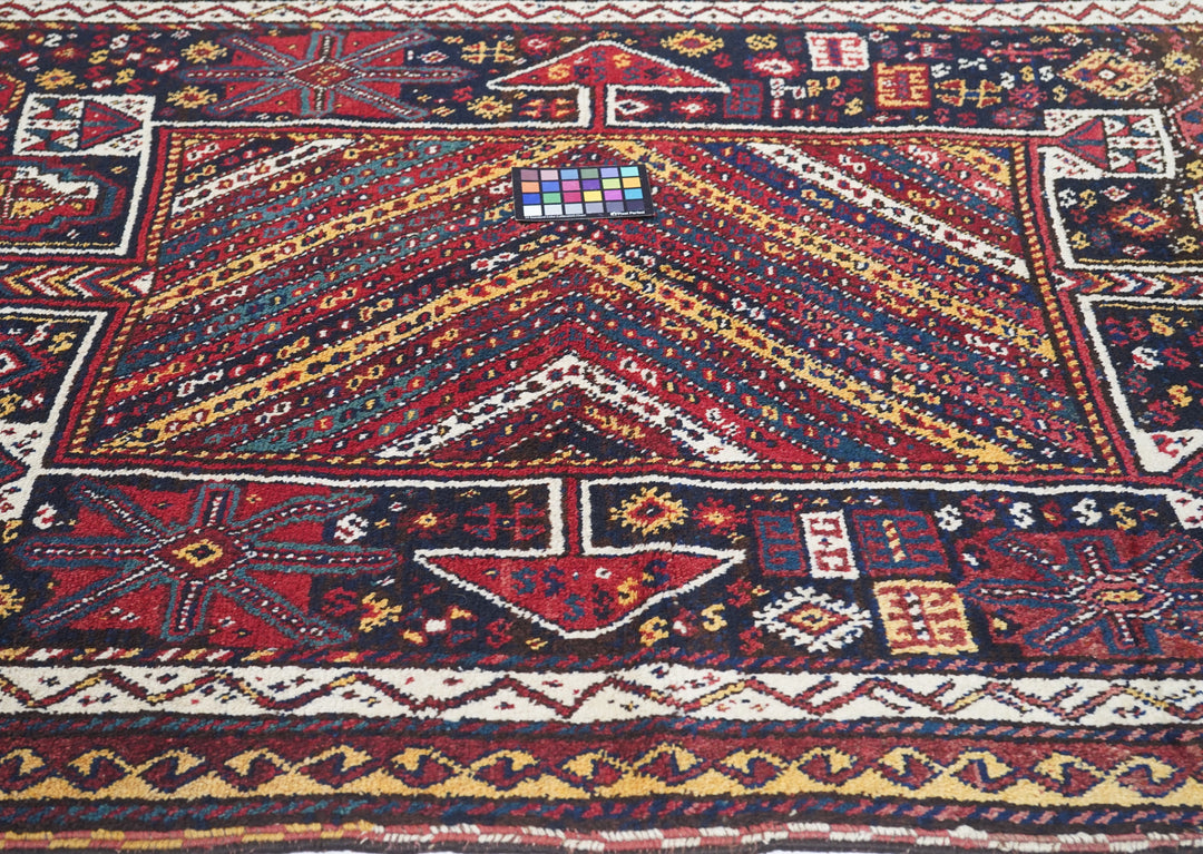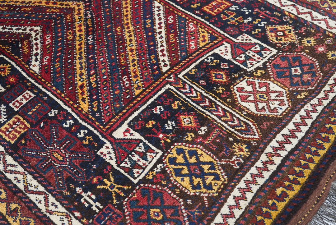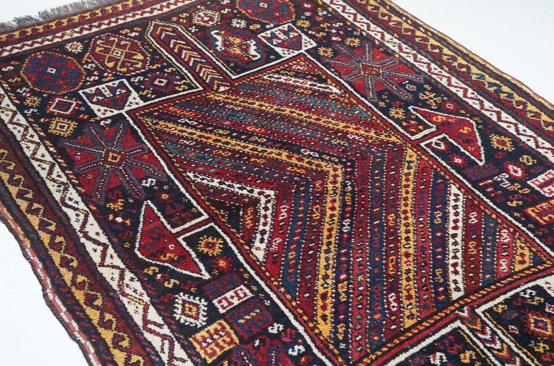 This rare NE Persian tribal scatter shows a rectangular, upright "pool" with a sideways polychrome chevron pattern in yellow, red, green, ecru and dark blue, Arrow heads project laterally and chromed spikes project vertically. Navy background with octagons, guls and other Turkmen-derived elements. Narrow ivory zig-zag border. Wool foundation. Moderate weave. Good condition.