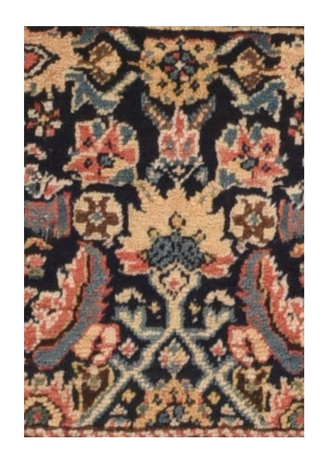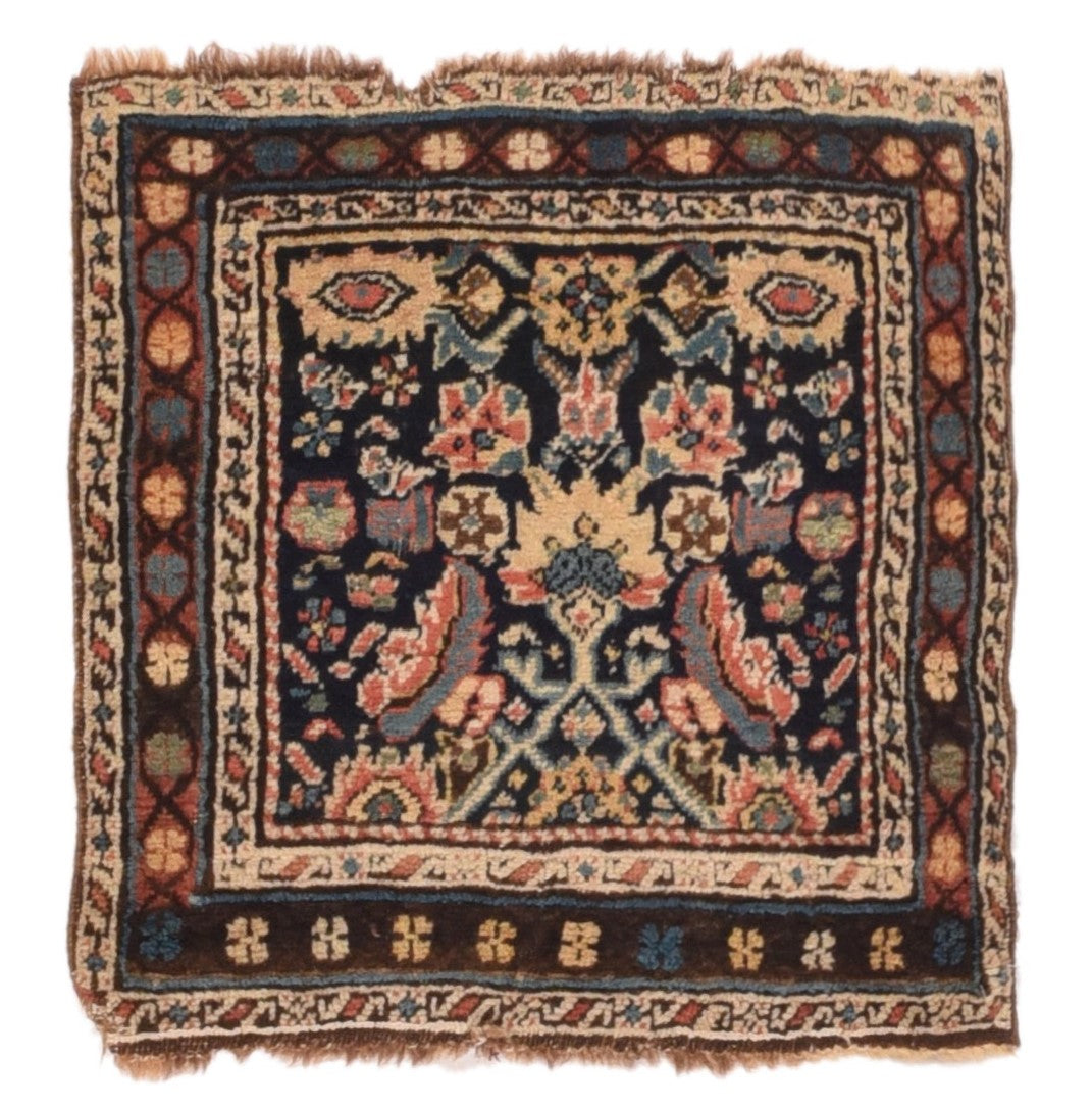 The near black field shows a vertically slipped section of the Herati design, highlighted in straw, green and cream. Abrashed brown border with a rounded quincunx repeat on a linked open hexagon chain. S-chain minor ecru borders. Wool foundation, moderate weave. Corroded brown, but generally good condition.