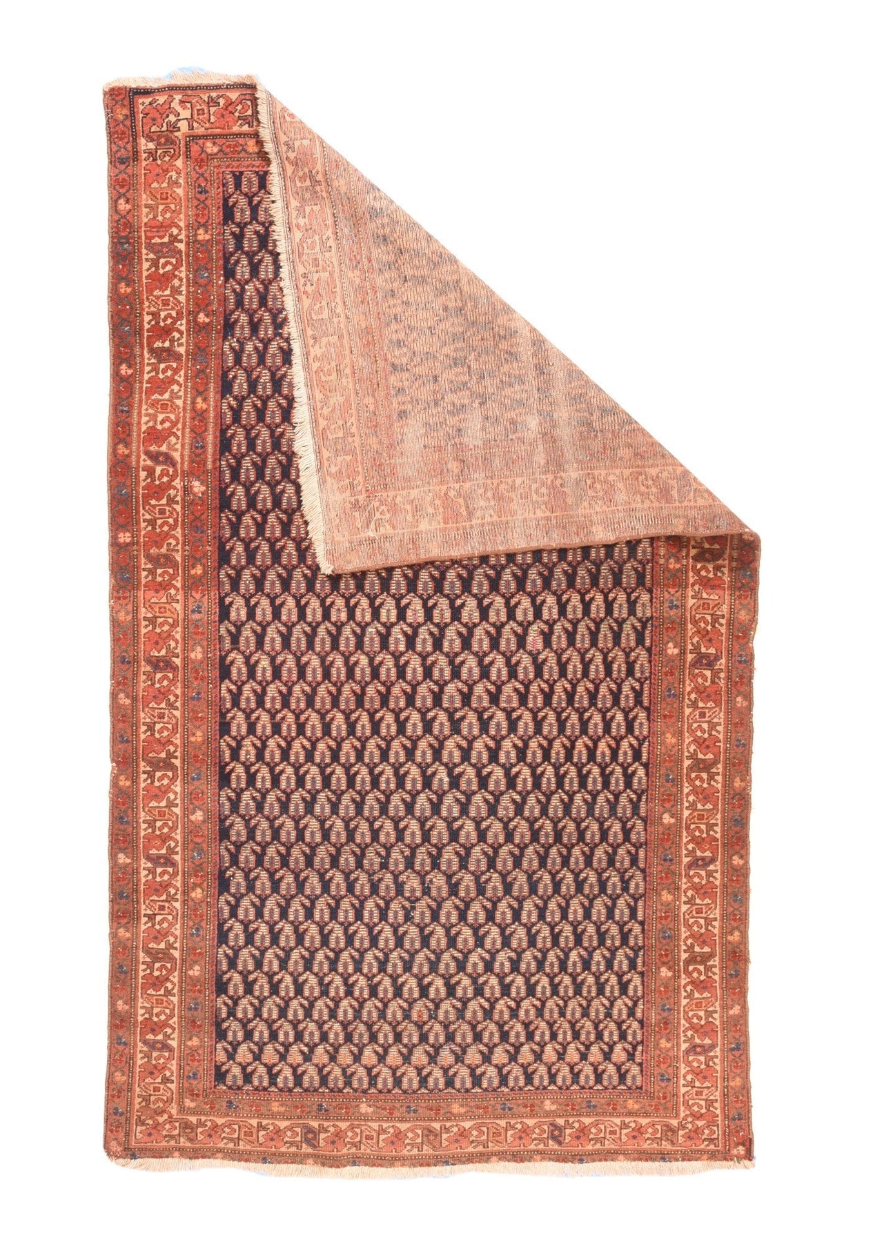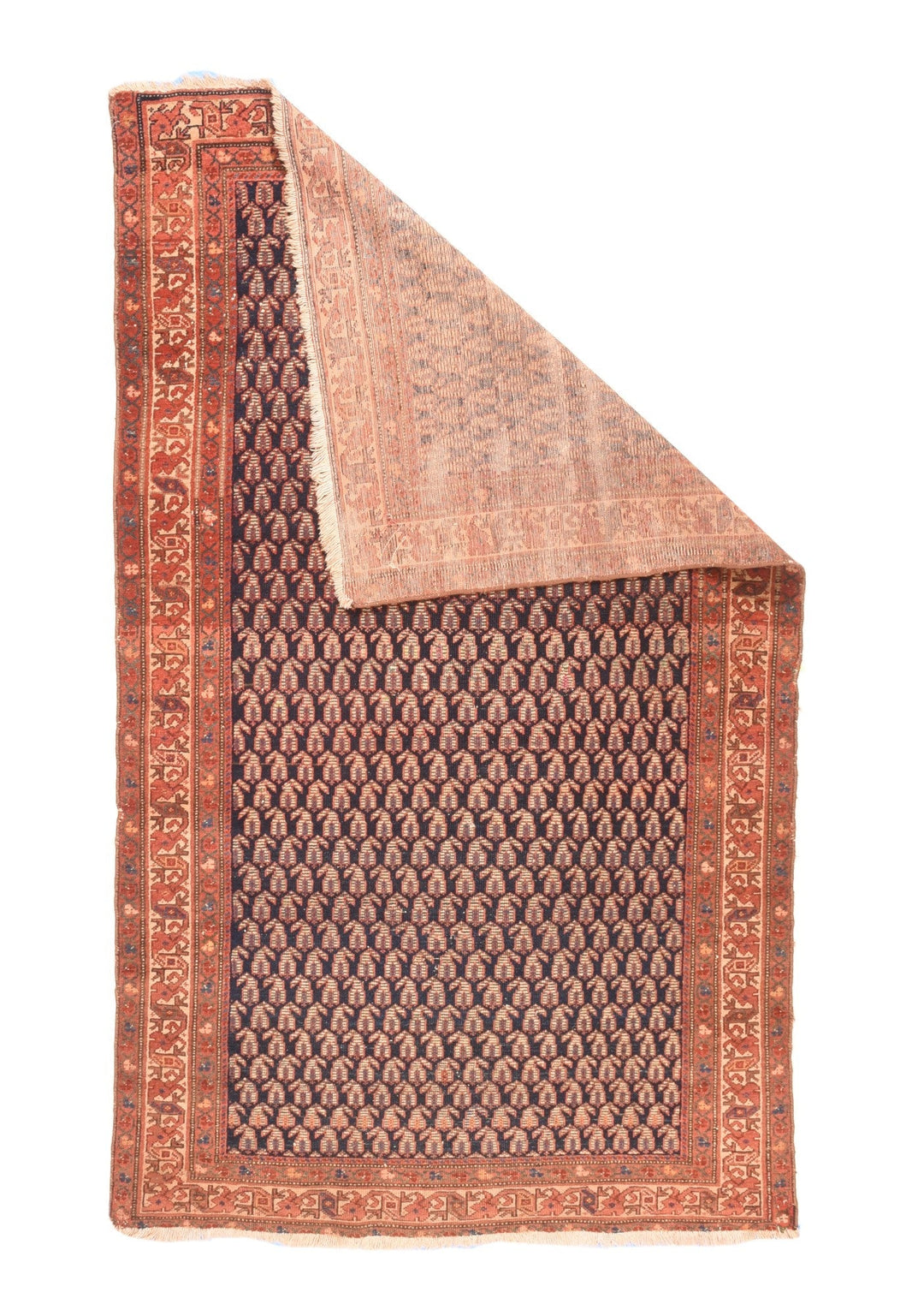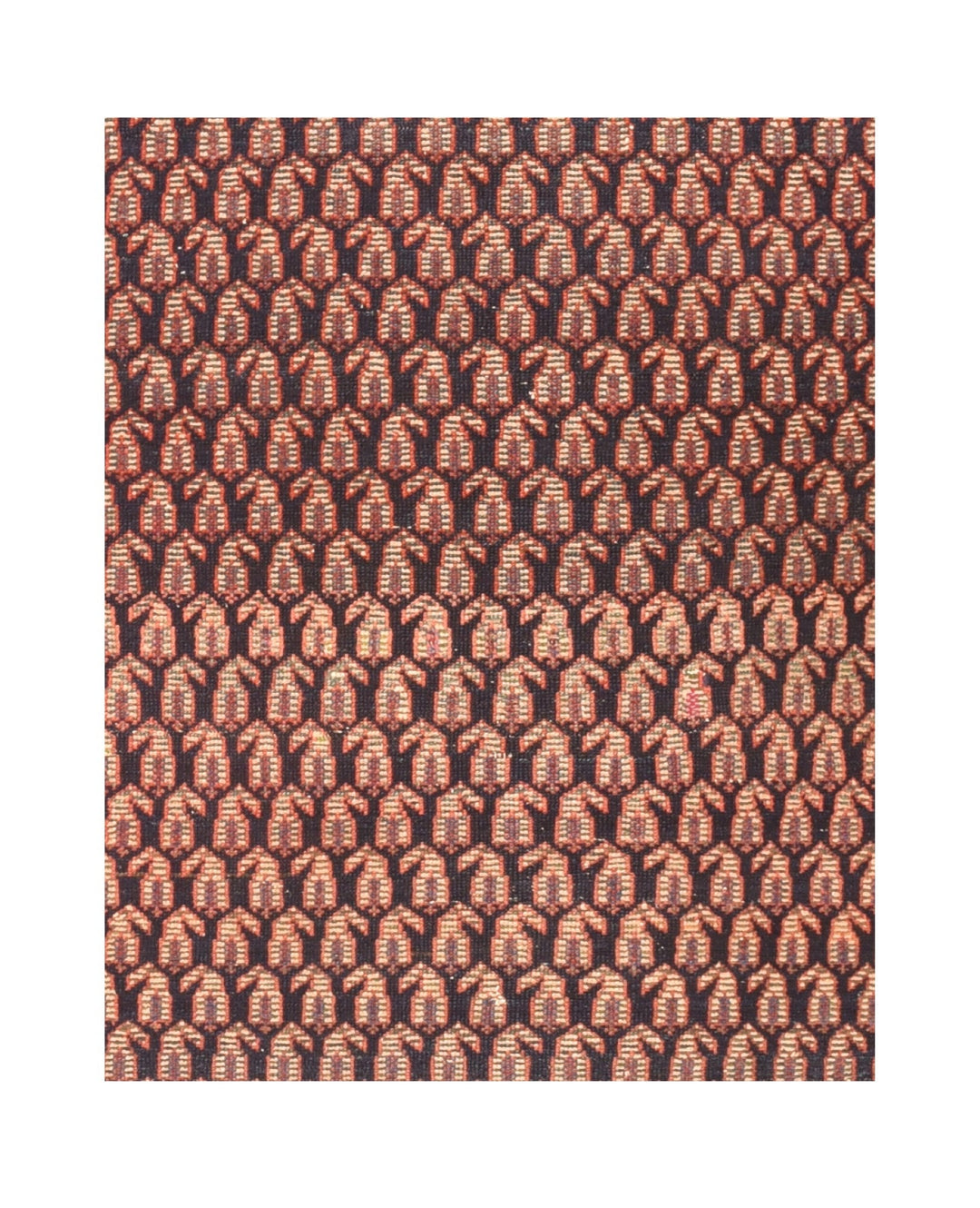 An almost complete three-column version of the classic Harshang ("crab") design of ragged palmettes, cogwheel rosettes, "goosenecks" and arrays of radiating flowers neatly covers the dark indigo field, short pile kellegi. Symmetric knots, wool and cotton foundation. Progressive flower minors and an ivory Kufesque design main border. Good condition, especially considering the age.