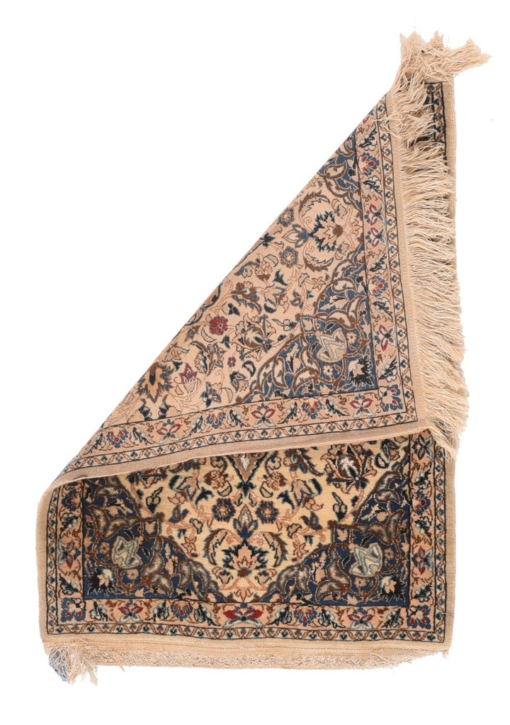This finely woven, Central Persian urban ruglet shows a cream field fully filled with palmettes and sickle leaves, and supporting the lightly lobed and salmon-pink medallion with a 12 lappet inner straw sub-medallion. Navy corners with cherry red and ecru forked leaves. Narrow border with palmettes and barbed leaves. Finishing issues at one end. Good condition with a short, firmly velvety pile.