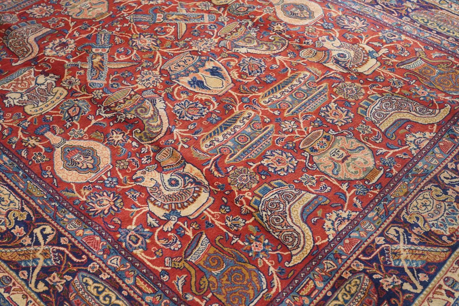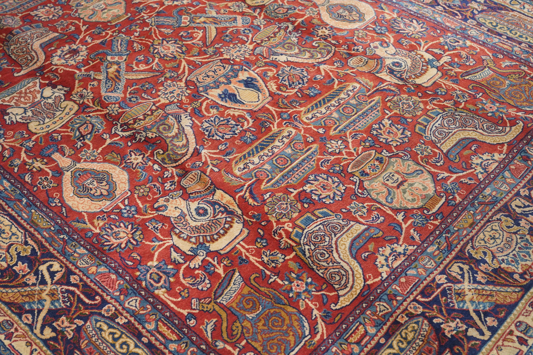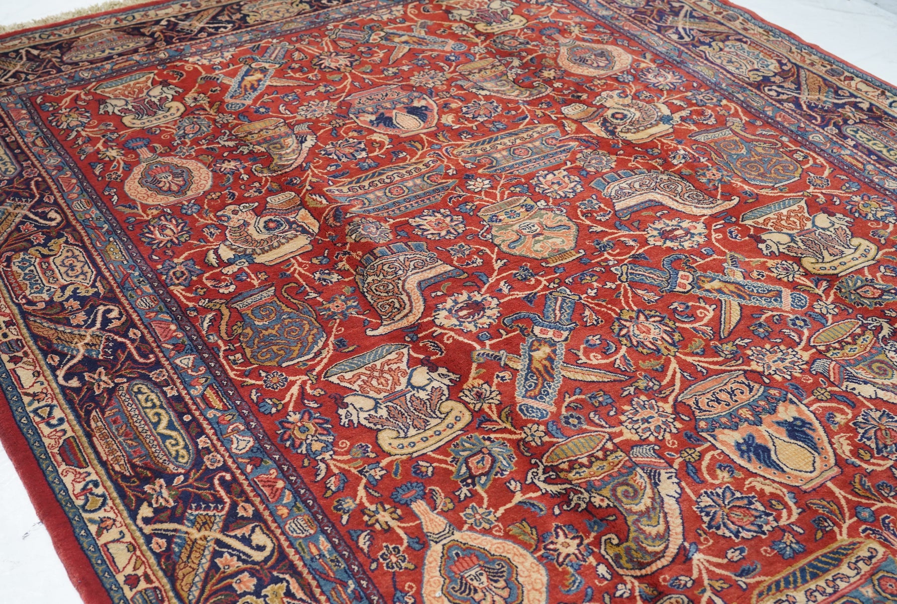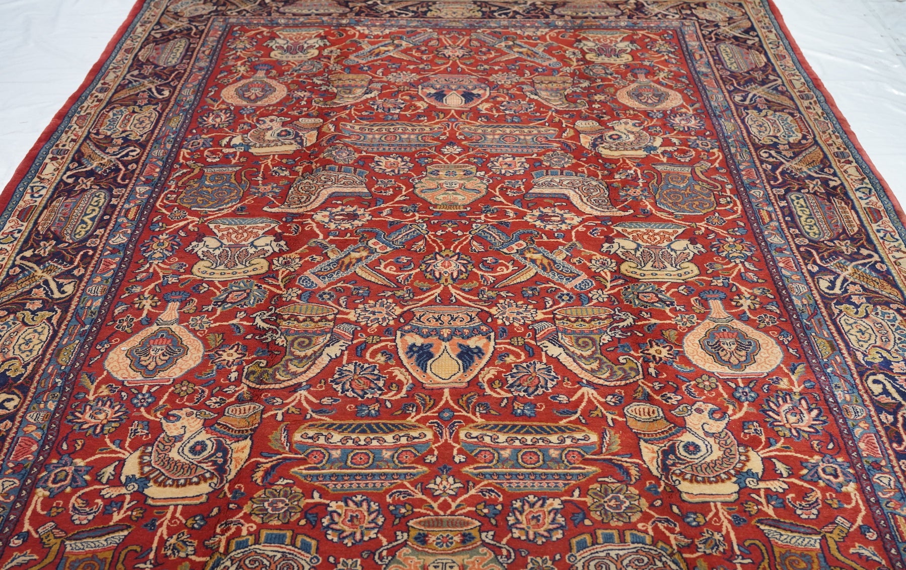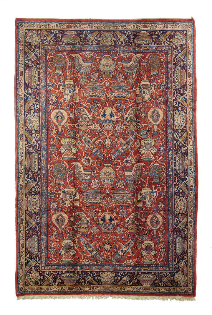 This is one very unusual carpet! The red field displays bottles, vases, swords, daggers, helmets, drinking horns and various other accoutrements, with vinery, leaves and palmettes passing round and beneath, tying it altogether. Bows, quivers and ceramic pots decorate the dark blue border. Definitely one-of-a-kind. Cotton foundation, well-woven. Obviously a very special commission.