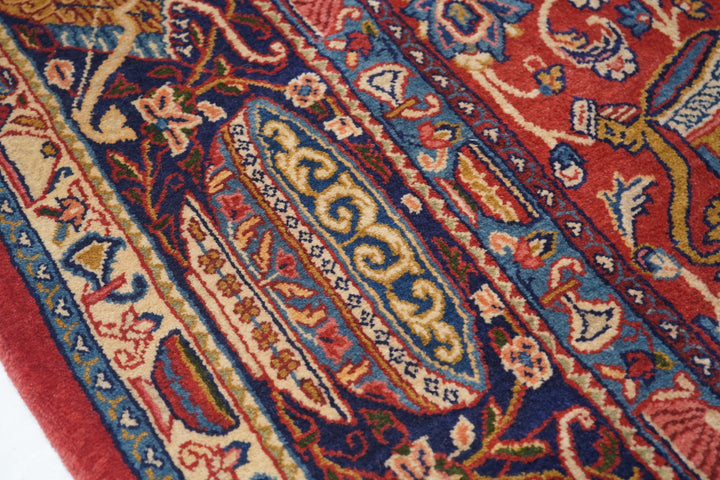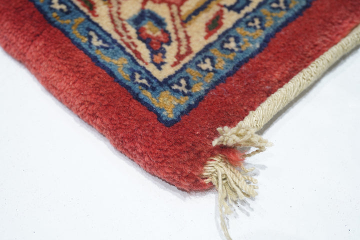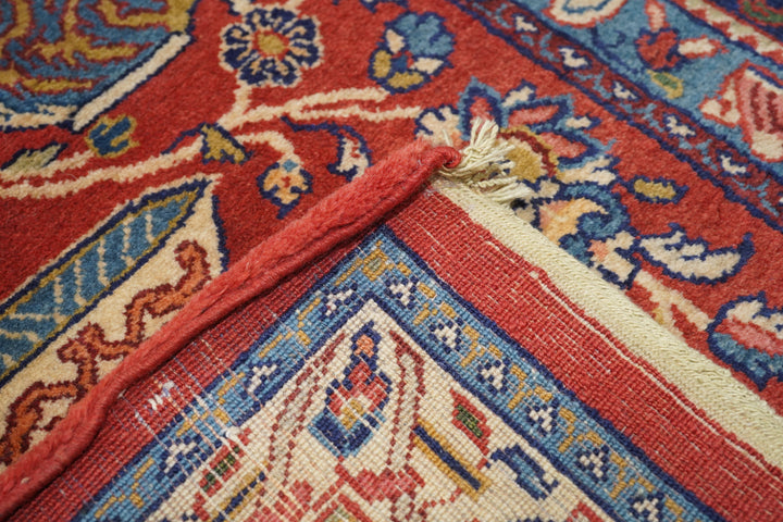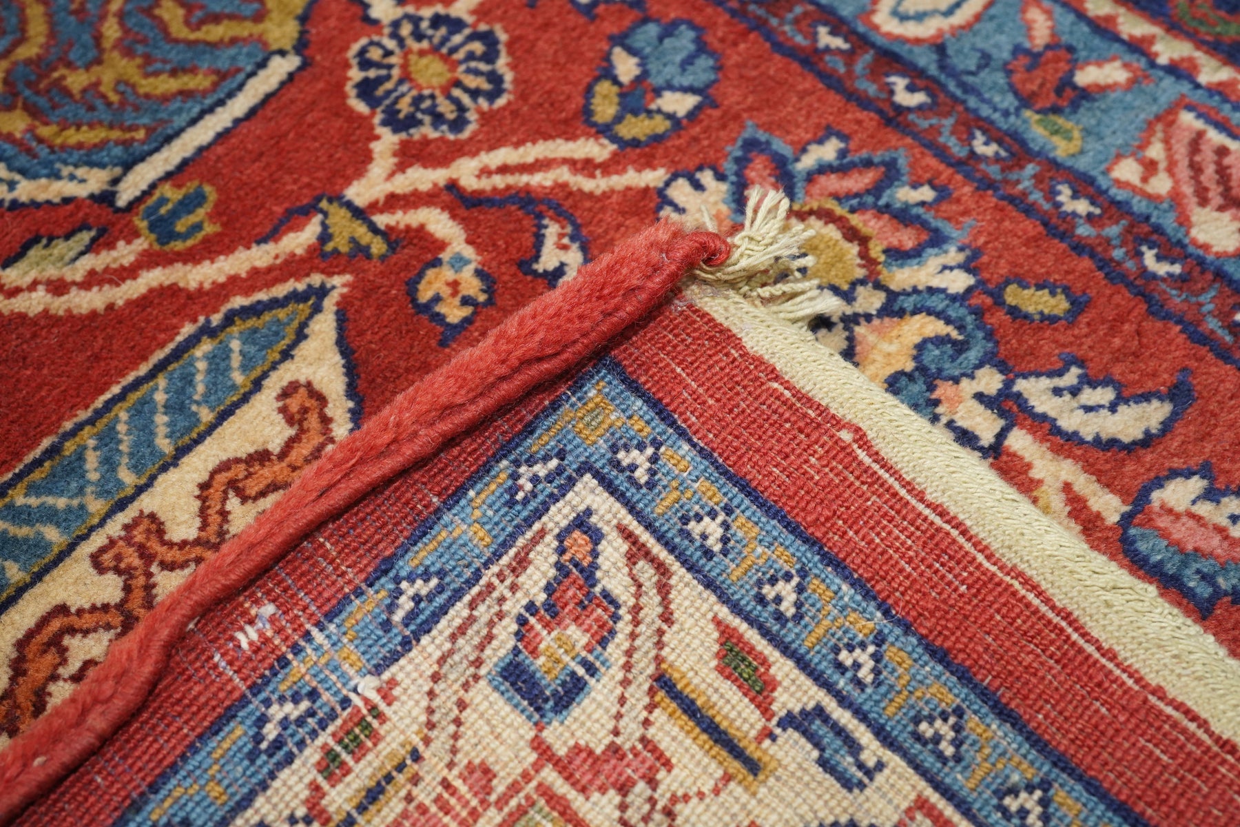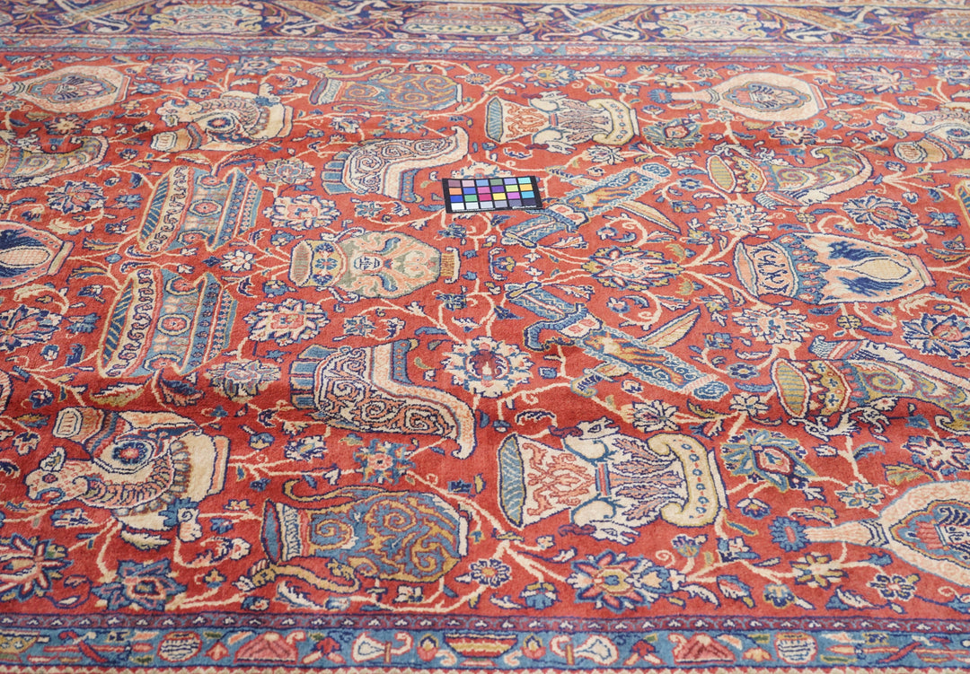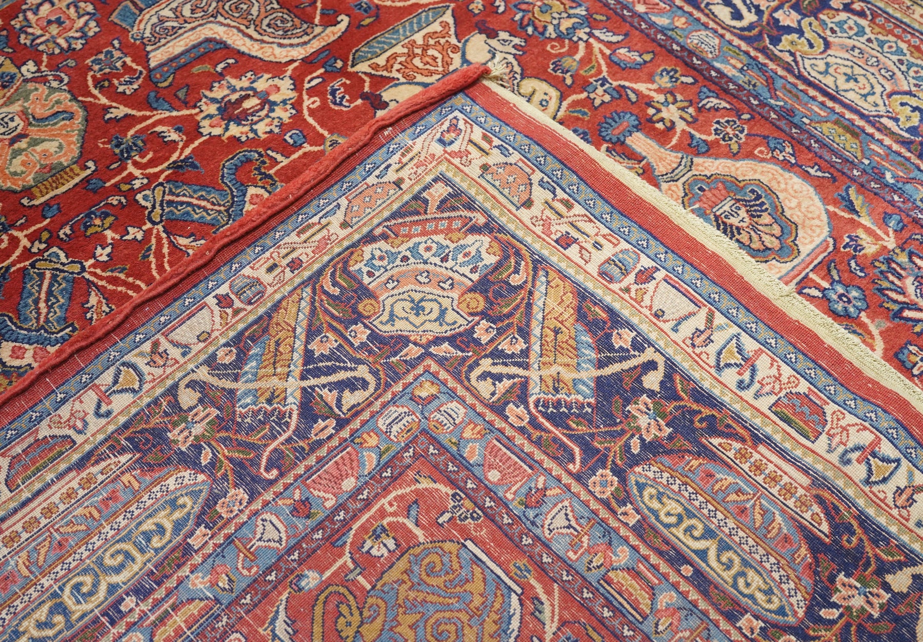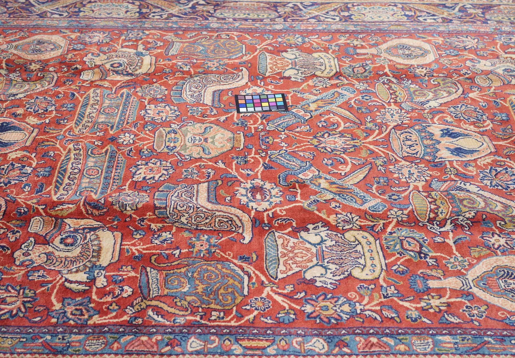 This is one very unusual carpet! The red field displays bottles, vases, swords, daggers, helmets, drinking horns and various other accoutrements, with vinery, leaves and palmettes passing round and beneath, tying it altogether. Bows, quivers and ceramic pots decorate the dark blue border. Definitely one-of-a-kind. Cotton foundation, well-woven. Obviously a very special commission.