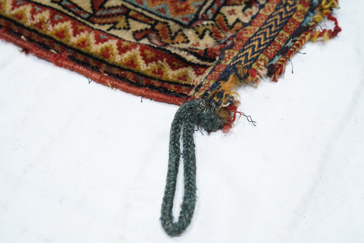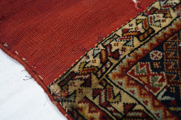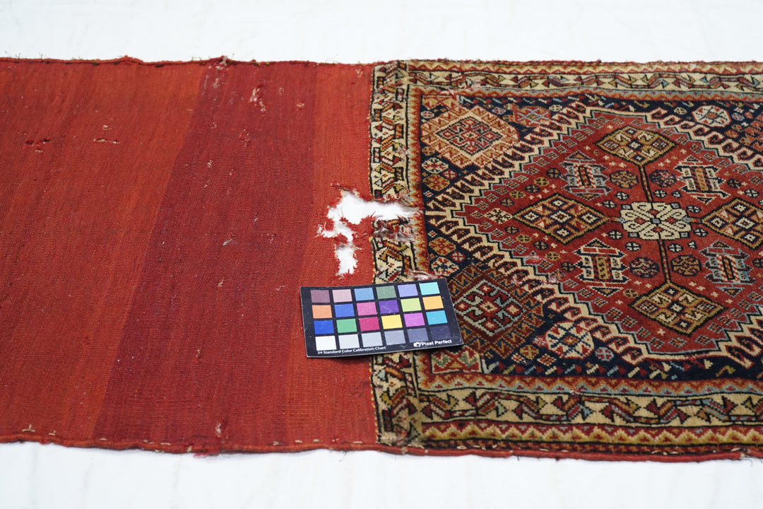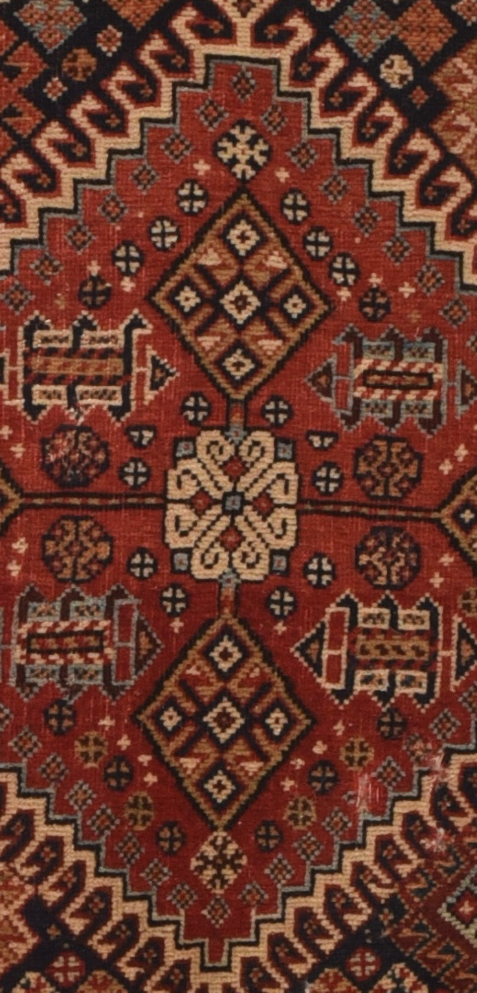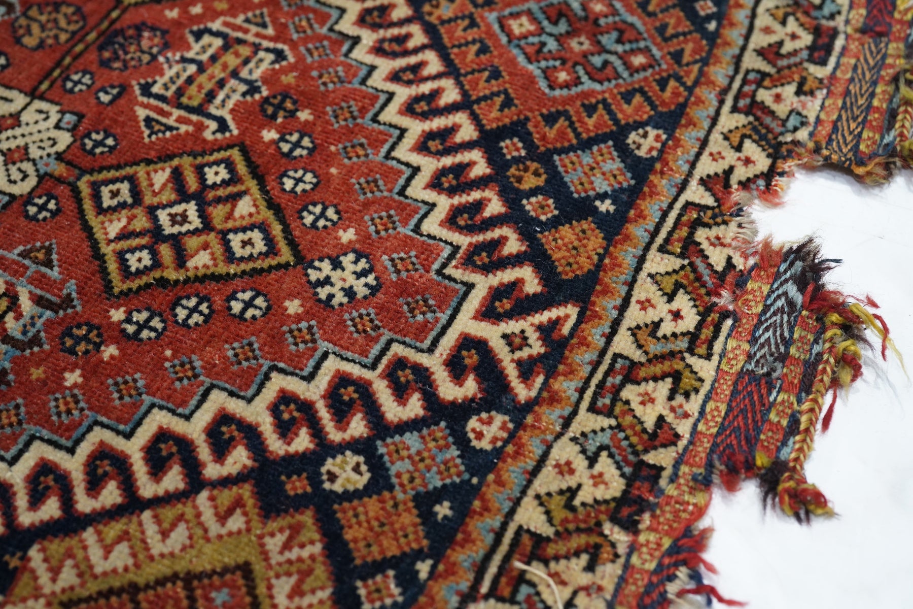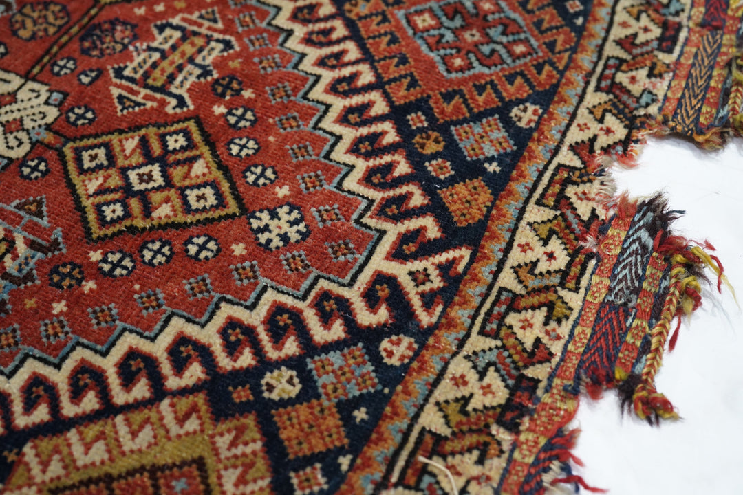 Although in rough condition, this well-woven SW Persian tribal artefact shows the iconic stepped, hooked red octagonal medallion with an ivory rosette volute central knot and four straw lozenges in the cardinal directions. Dark blue field with hooked corner diamonds. Ivory chunky vine meander border. Red plain weave back. A study collection piece.