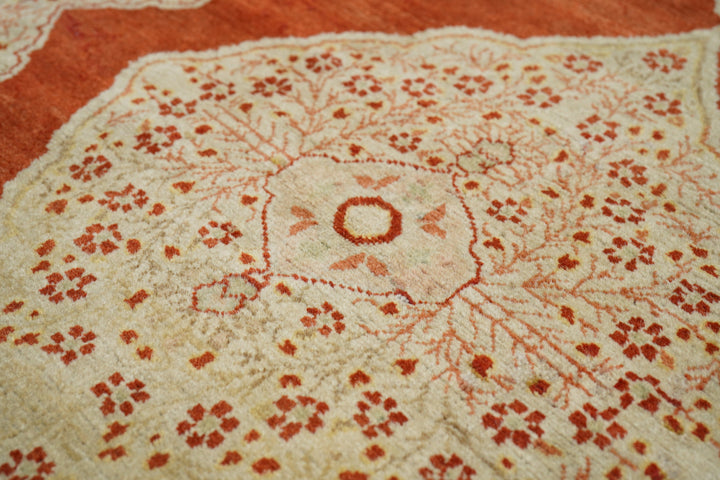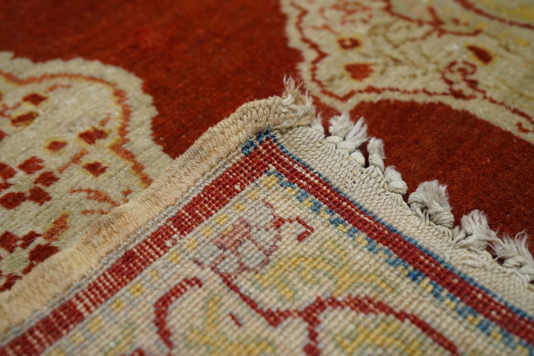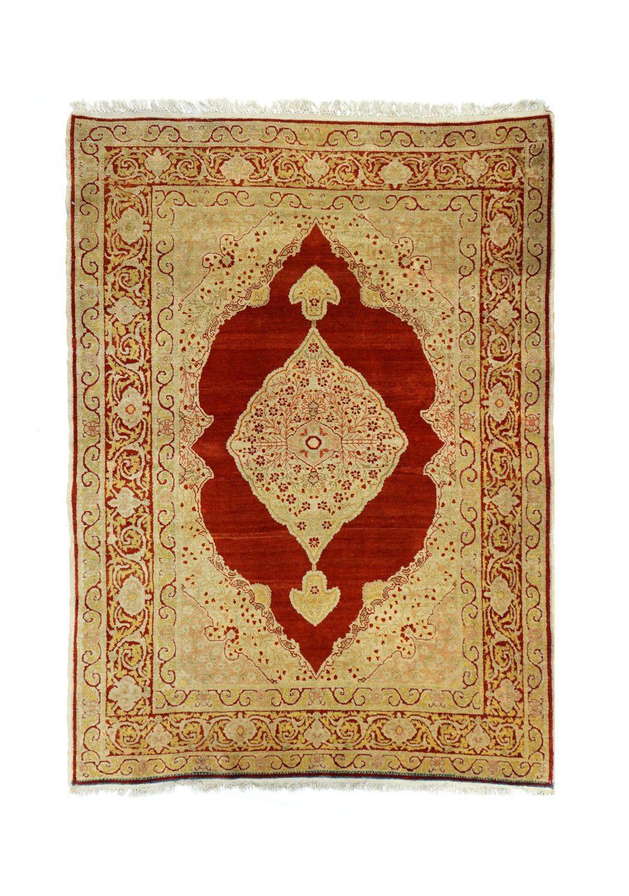 The well-woven to finely knotted 1890 to 1910 pieces woven in the eponymous workshop or its  copyists, in Tabriz, in formats ranging from mats  to giant carpets, with prayer (niche), allover and medallion layouts, with filled or open fields, often with a characteristic rust-red field tone. Prices are usually unsigned and undated. Cotton foundations, brisk pile. Expensive and up.