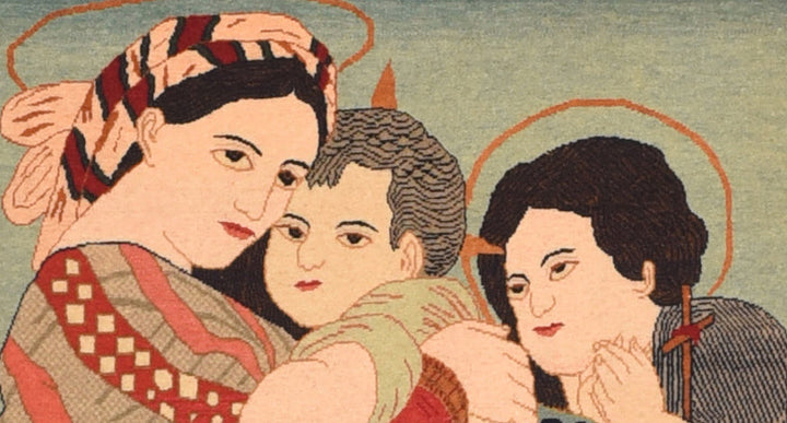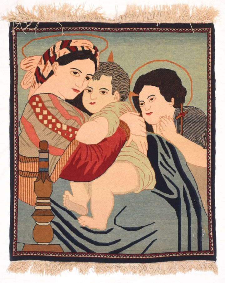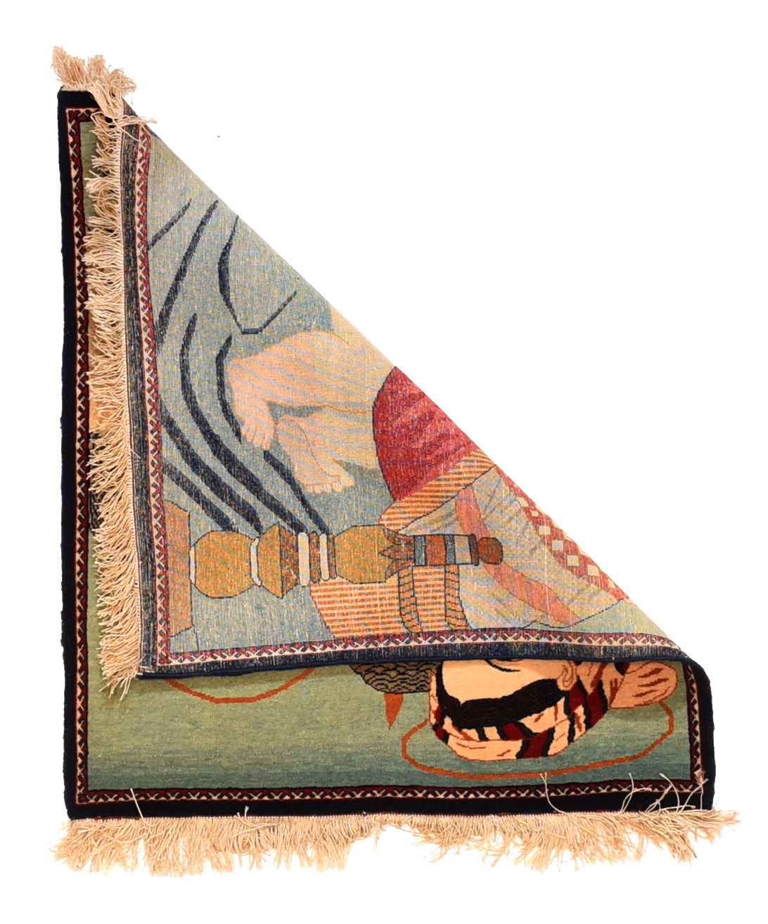 Identical in size, weave, palette, subject and origin to 216 except that the figures are oriented toward the left instead of to the right. Any weaver or workshop can weave a pictorial, the only requirements being close knotting and a decent source, be it a book illustration, photograph, art form reproduction, print or drawing. Picture rugs have always been a Persian specialty and a test of the artisan technical ability.
