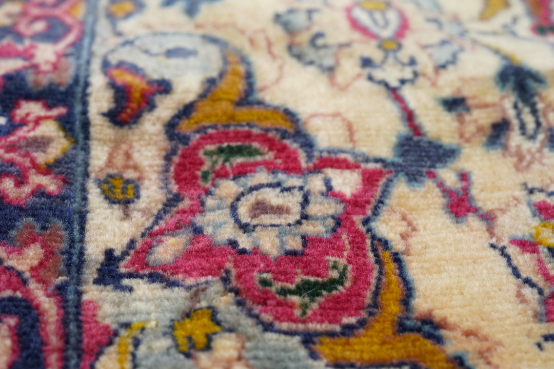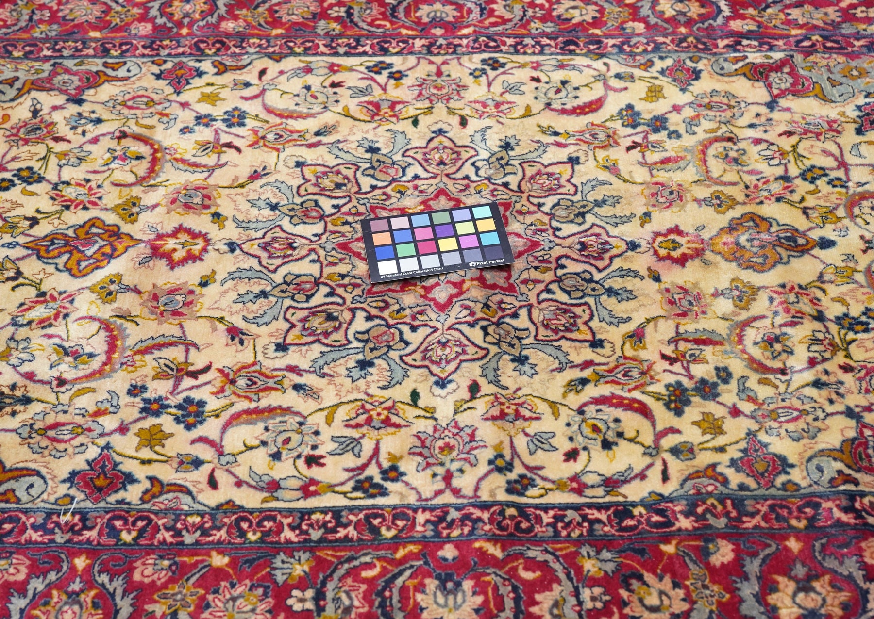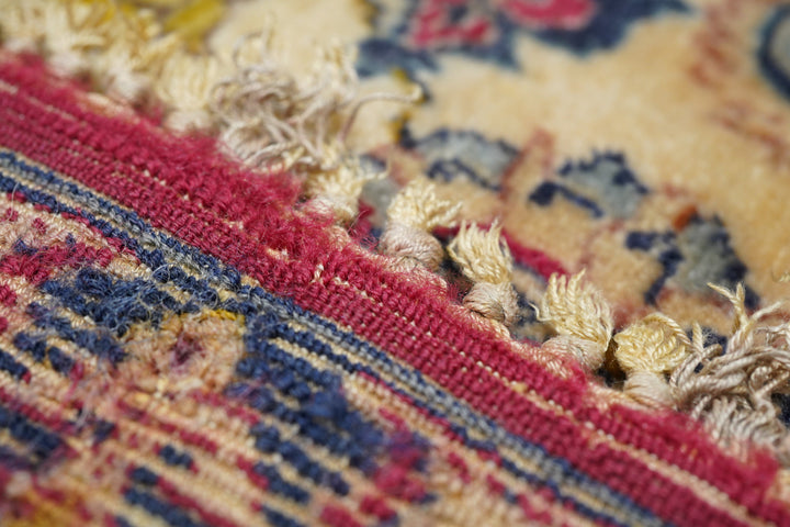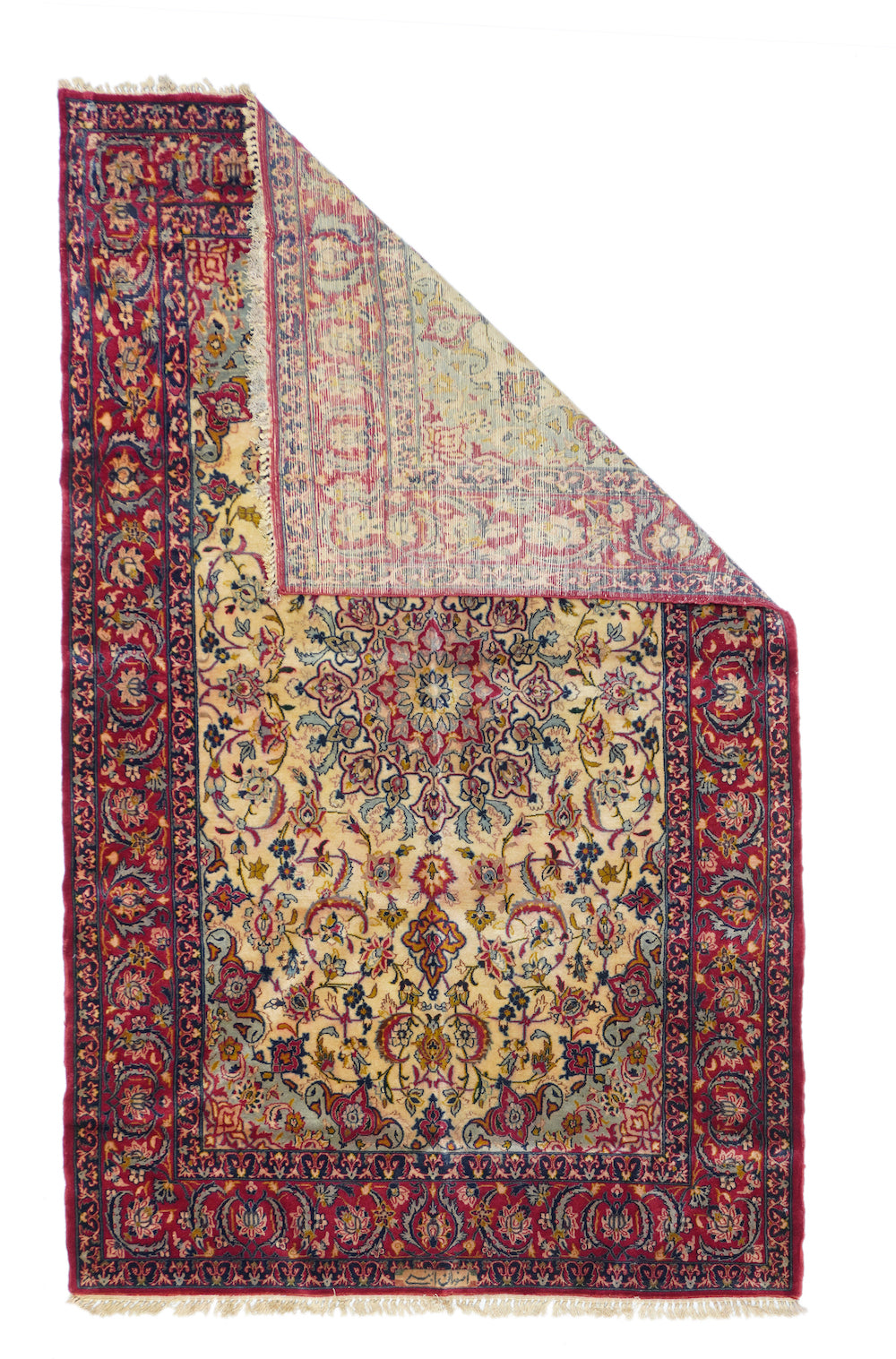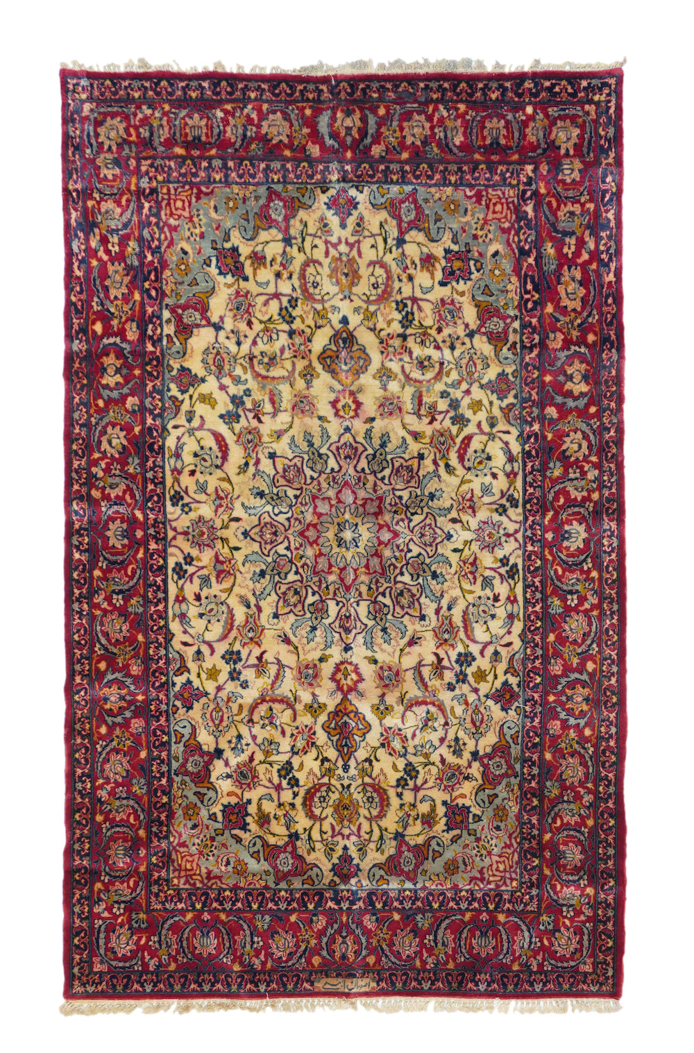 Always finely woven and favoring cream fields, Isfahan rugs, as here, show pendanted round medallions supported by palmettes, lancet leaves and scrolling vinery. Eight plus eight medallion edge and semi-en suite corners. Solid cardinal red border with petal palmettes and bitonal barbed sickle leaves. Inscribed in minor border at one end. Cotton foundation, short “Kurk” wool pile, very finely knotted. Good condition.