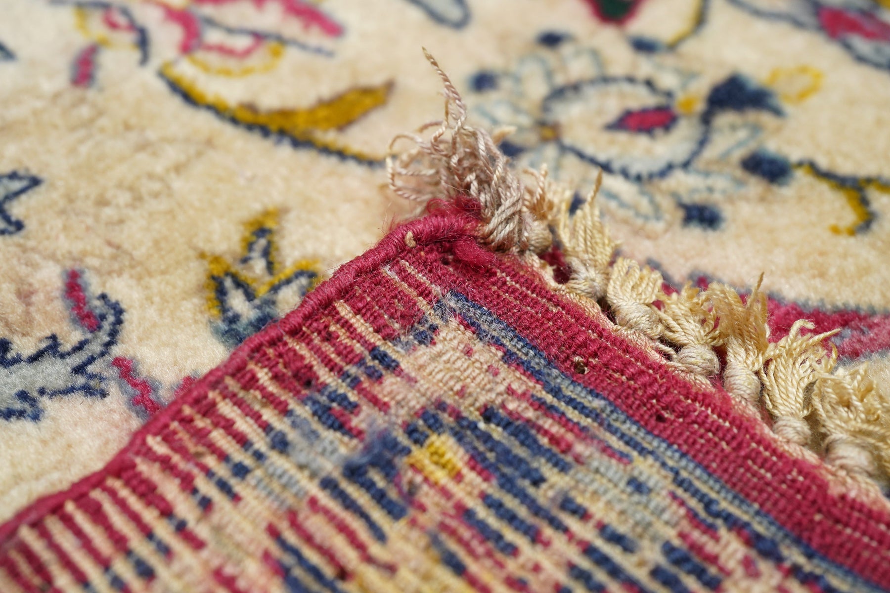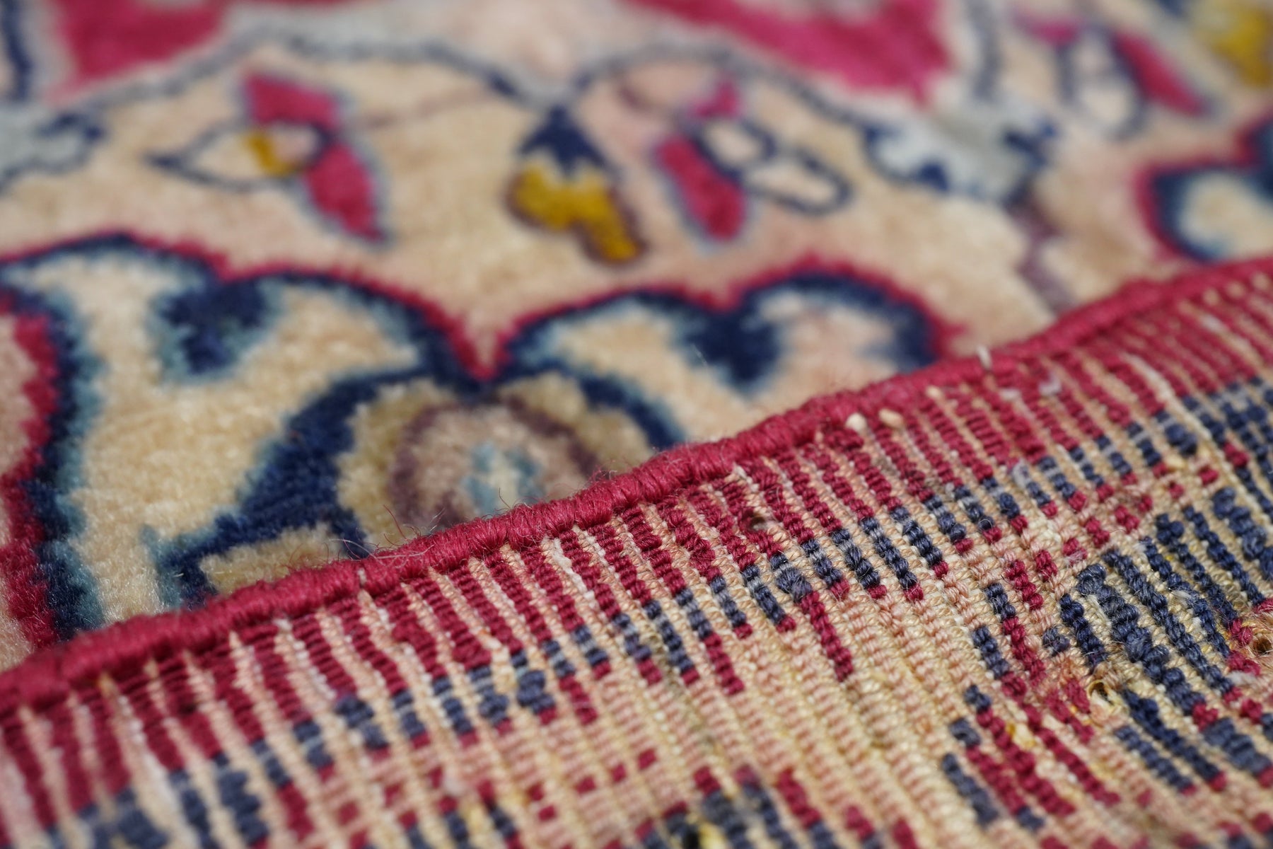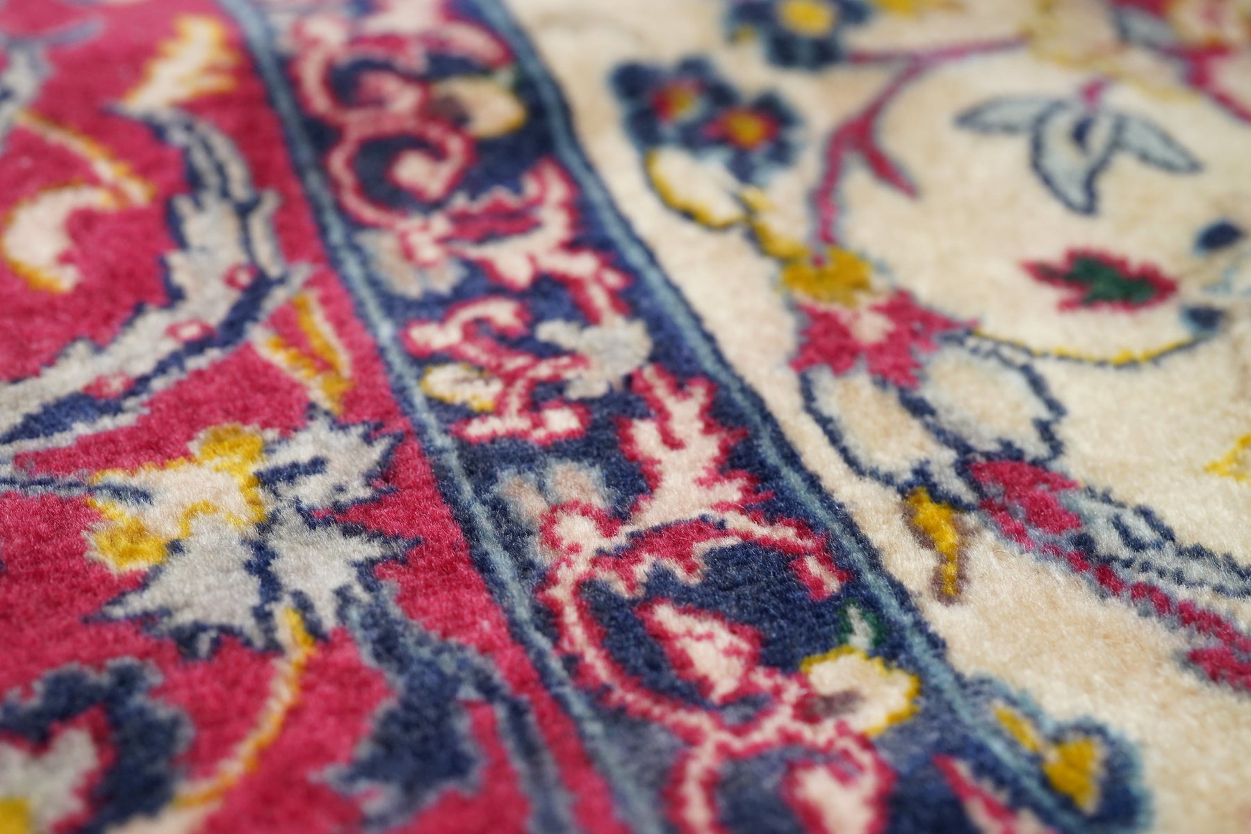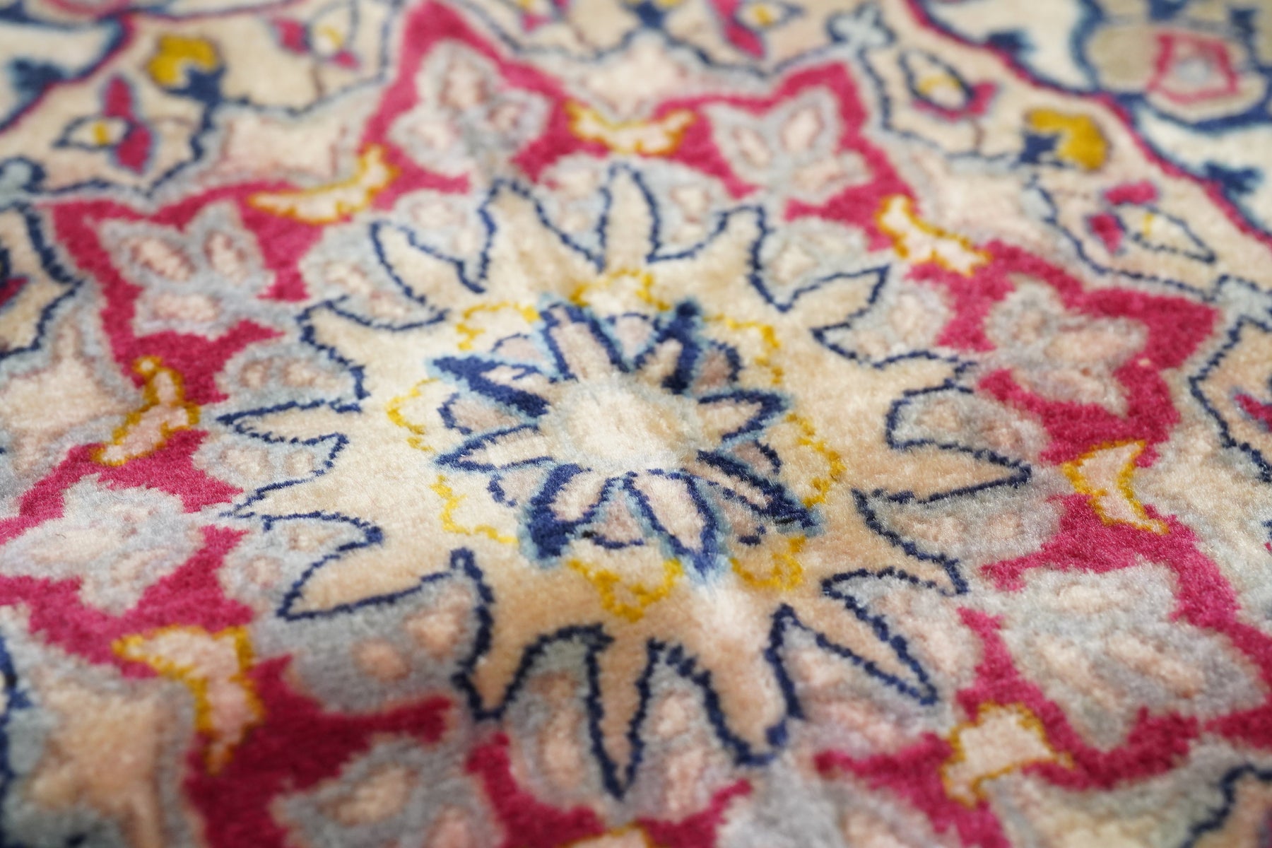Always finely woven and favoring cream fields, Isfahan rugs, as here, show pendanted round medallions supported by palmettes, lancet leaves and scrolling vinery. Eight plus eight medallion edge and semi-en suite corners. Solid cardinal red border with petal palmettes and bitonal barbed sickle leaves. Inscribed in minor border at one end. Cotton foundation, short “Kurk” wool pile, very finely knotted. Good condition.