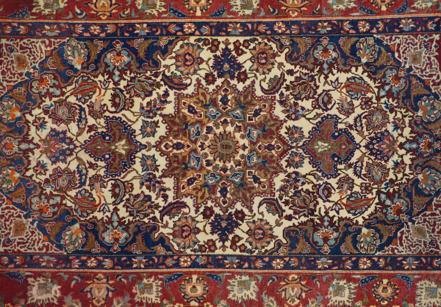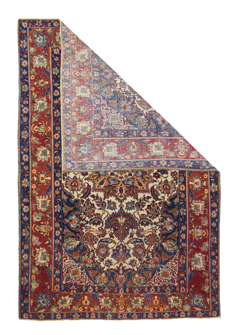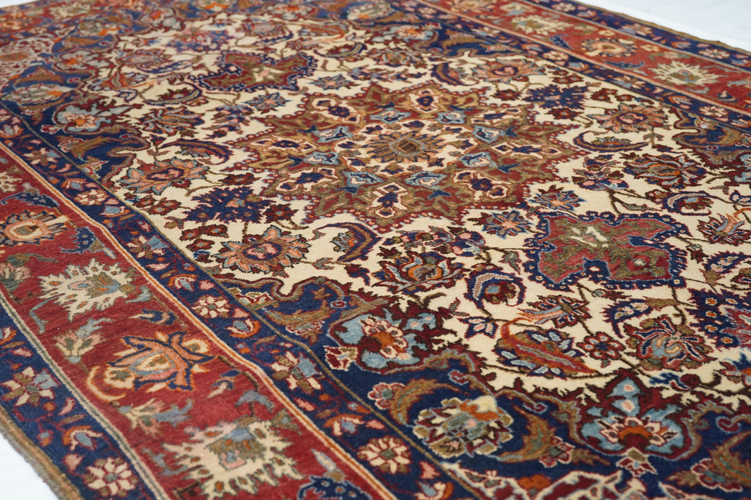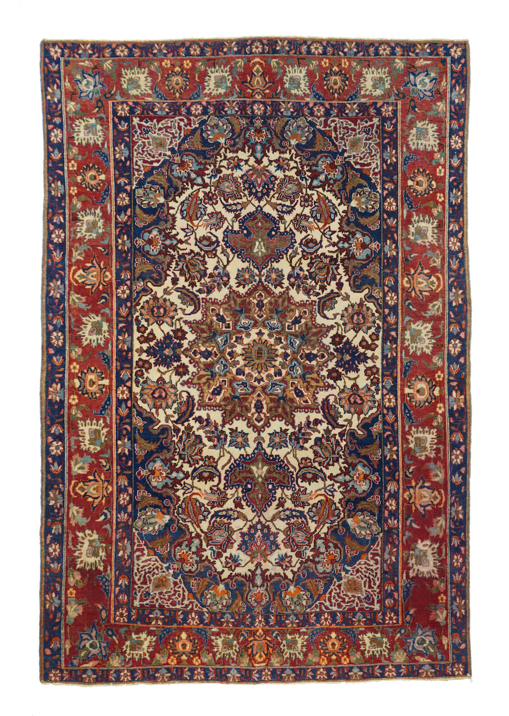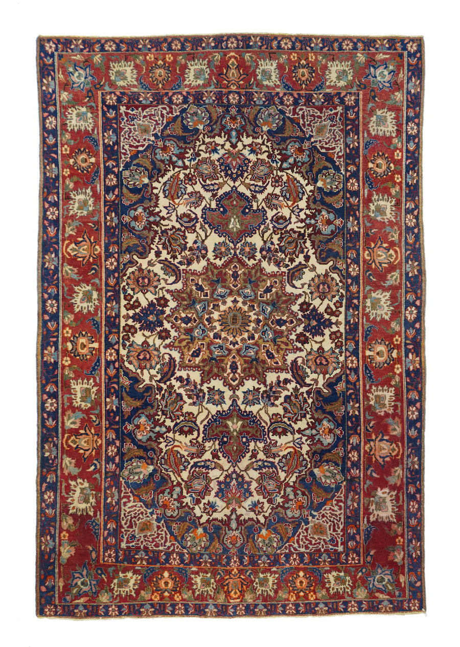 The sandy ivory field is decorated with large petal palmettes symmetrically flowing around the 16 point rounded medallion. Both medallion and escutcheon pendants are pearl edged. Navy corners with ecru arabesque sub-corners. Characteristic Isfahan red border with ragged and petal palmettes. Royal blue en suite minors. Fine weave. Good condition.