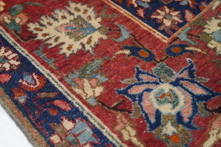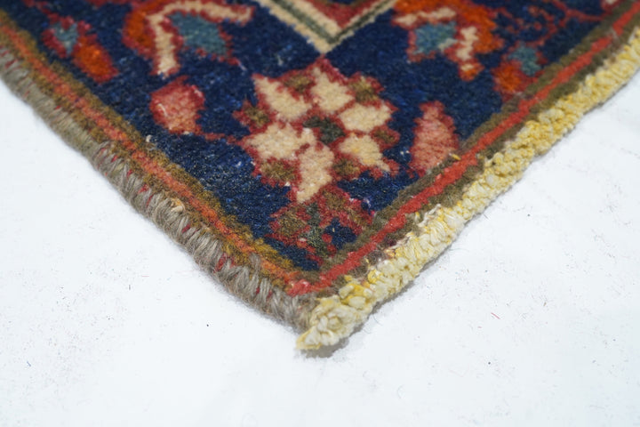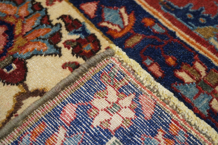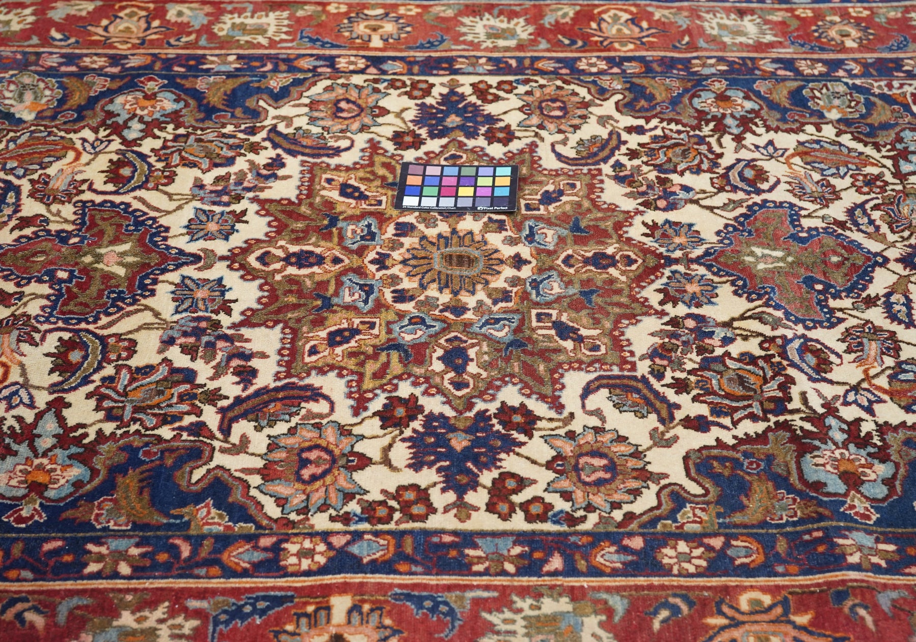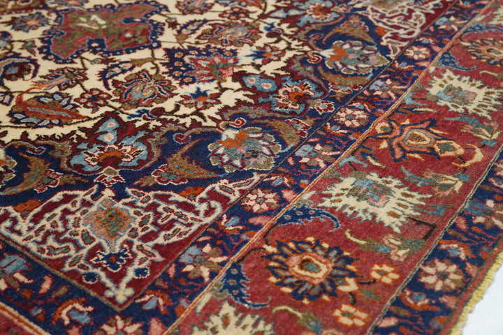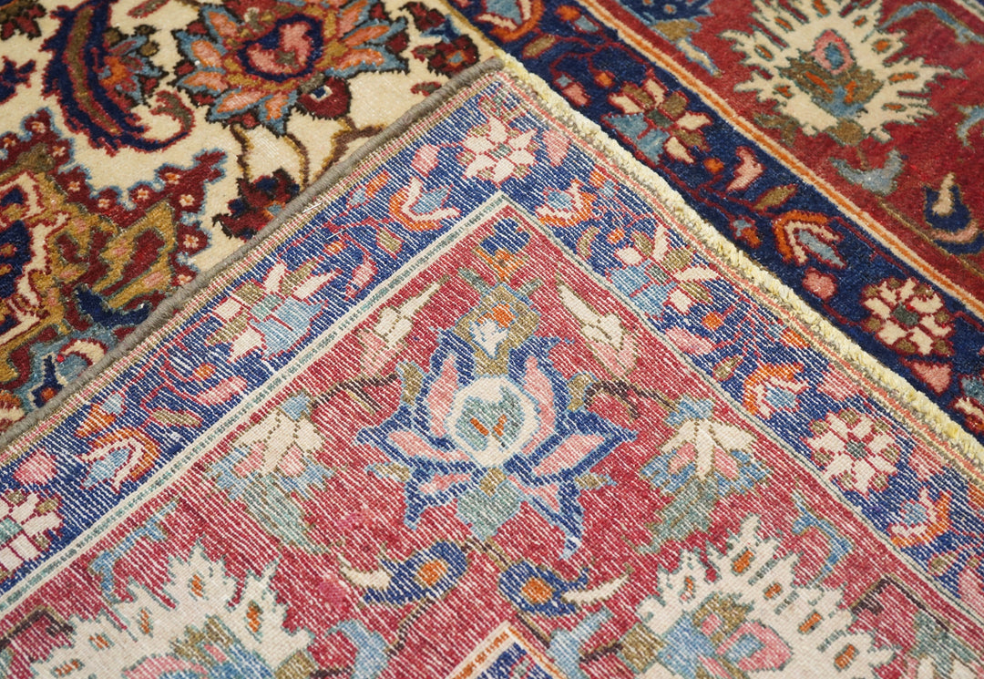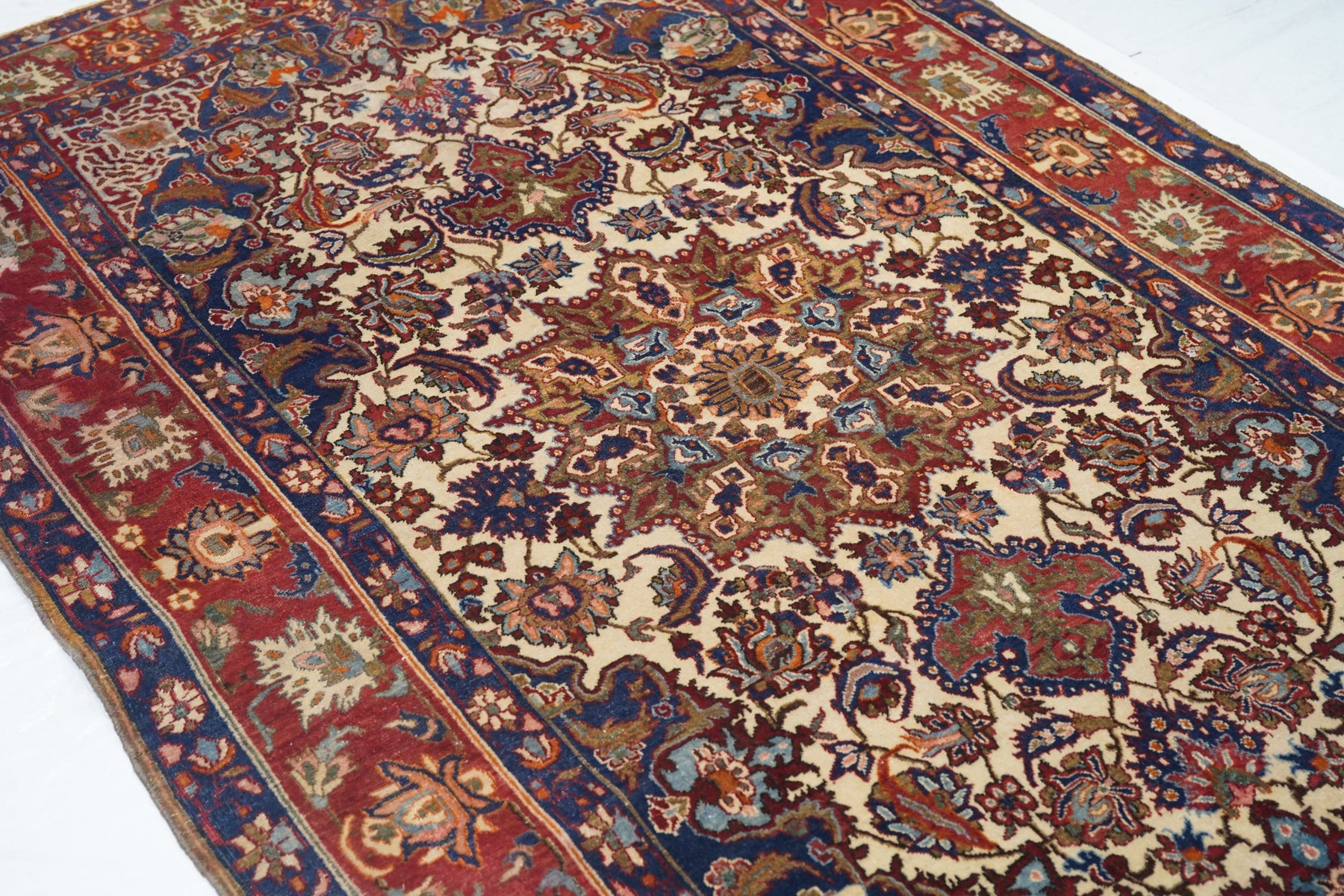 The sandy ivory field is decorated with large petal palmettes symmetrically flowing around the 16 point rounded medallion. Both medallion and escutcheon pendants are pearl edged. Navy corners with ecru arabesque sub-corners. Characteristic Isfahan red border with ragged and petal palmettes. Royal blue en suite minors. Fine weave. Good condition.