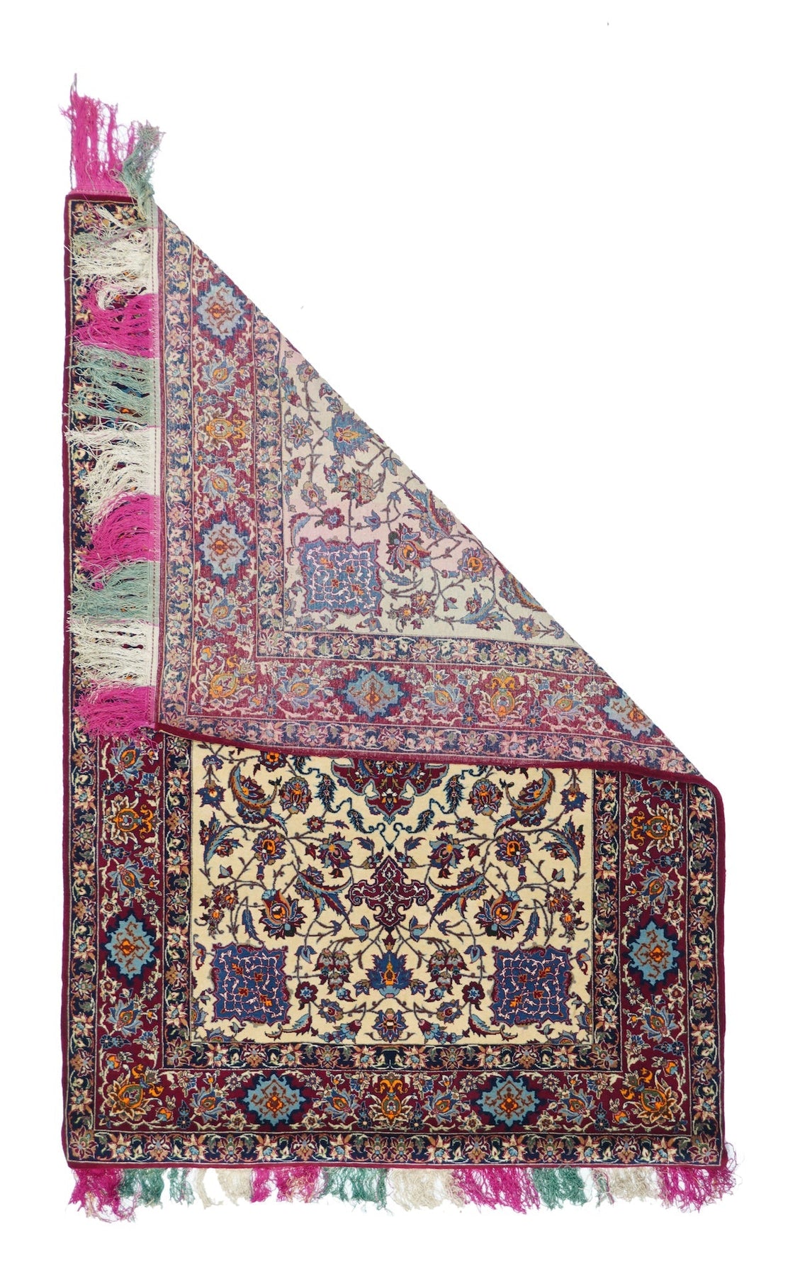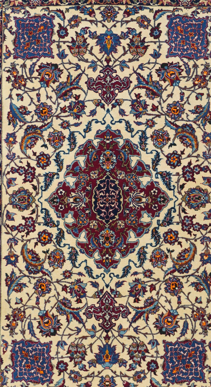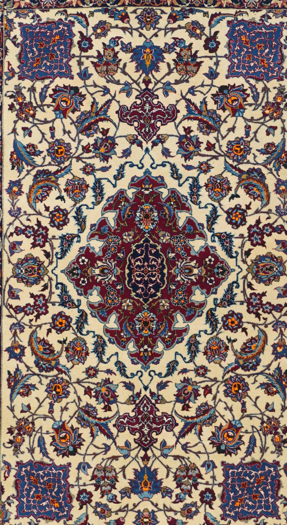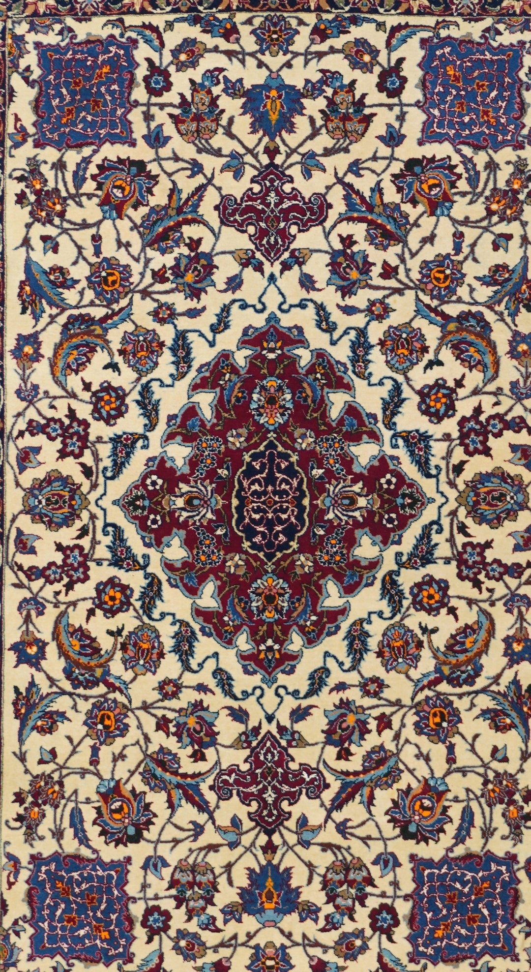 This very finely knotted central Persian city workshop small scatter shows a rainbow-colored silk warp. The palette is characteristically Isfahan with a cream field, very dark red flaming lozenge medallion and medium blue floating corners. Sickle leaves often overlap palmettes in the field. Dark red border with petal palmettes and light blue cartouches. Short, "kurk" pile. Good condition.
