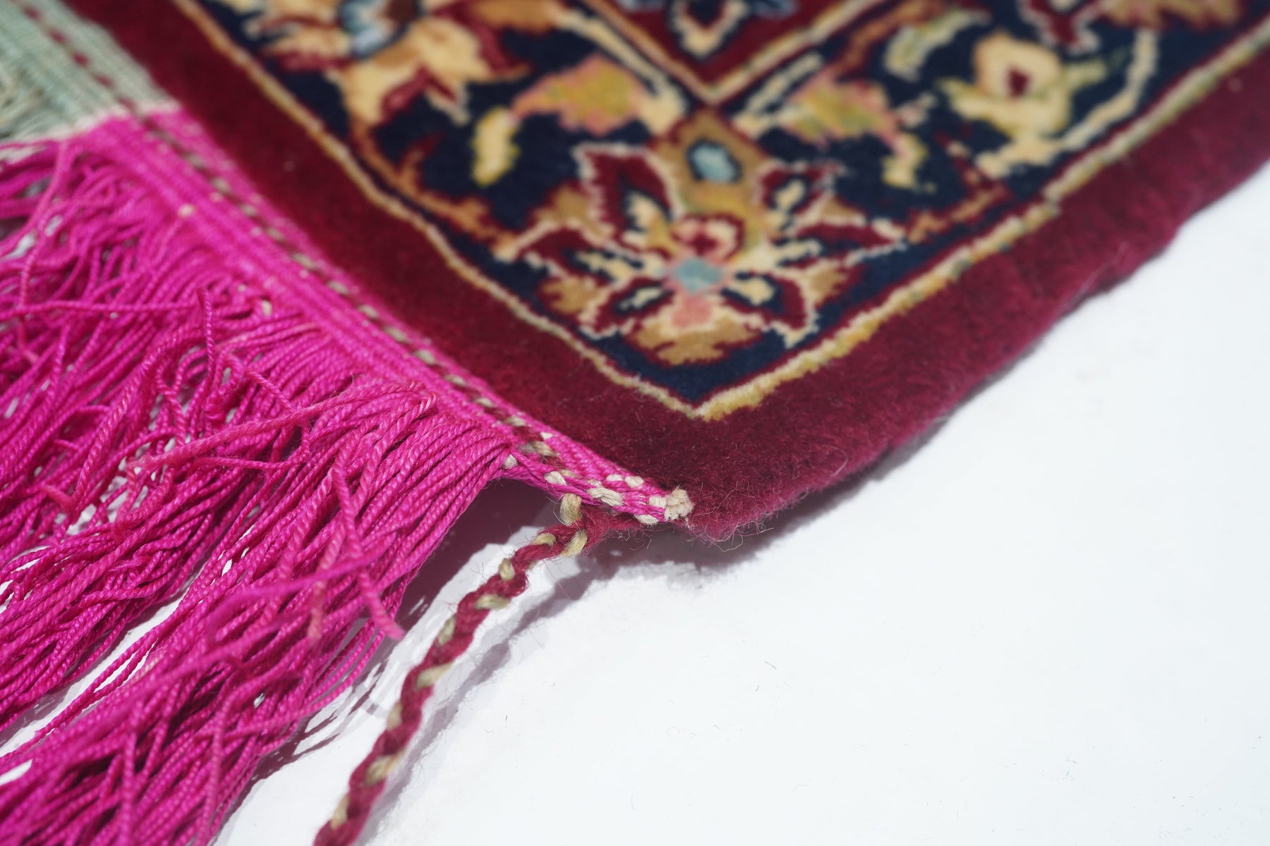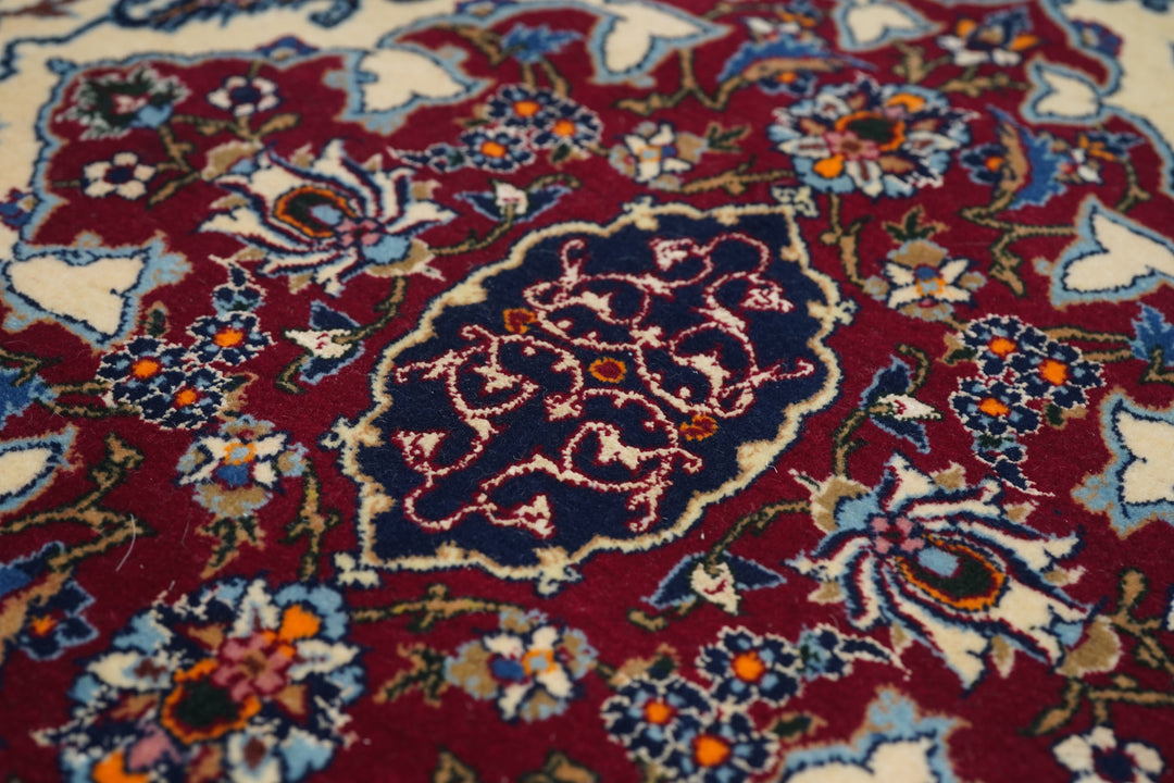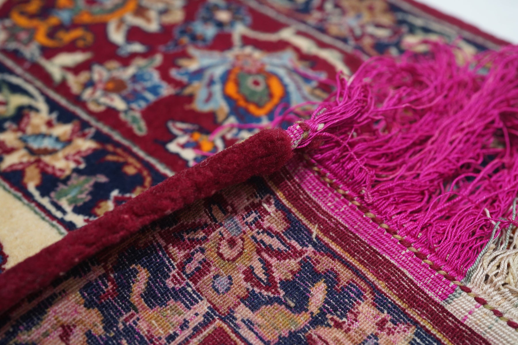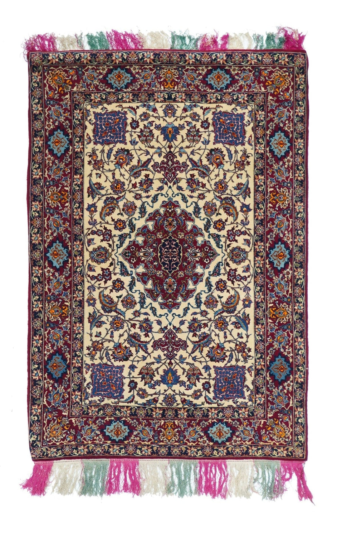 This very finely knotted central Persian city workshop small scatter shows a rainbow-colored silk warp. The palette is characteristically Isfahan with a cream field, very dark red flaming lozenge medallion and medium blue floating corners. Sickle leaves often overlap palmettes in the field. Dark red border with petal palmettes and light blue cartouches. Short, "kurk" pile. Good condition.