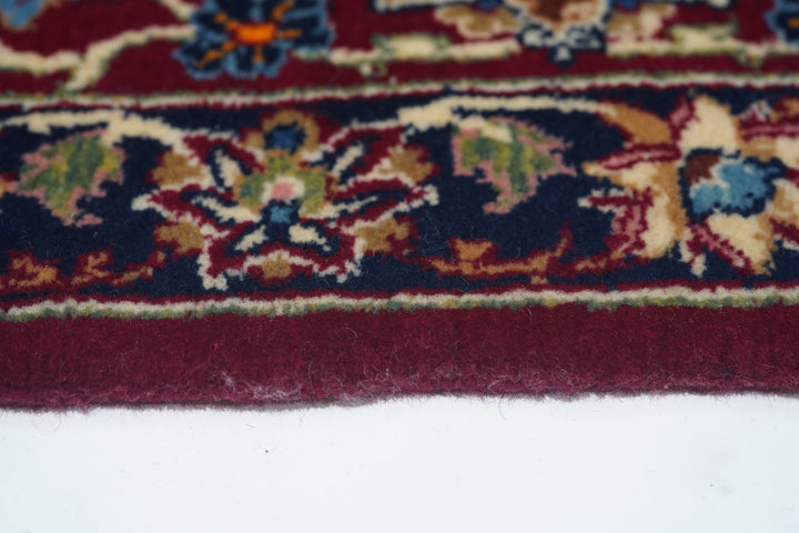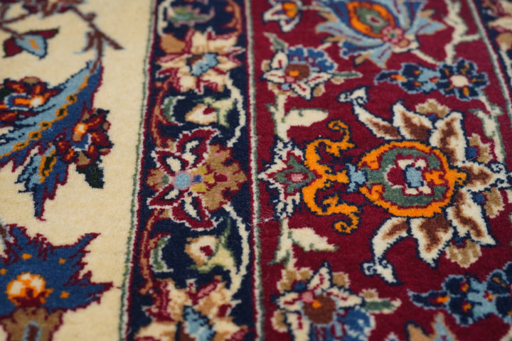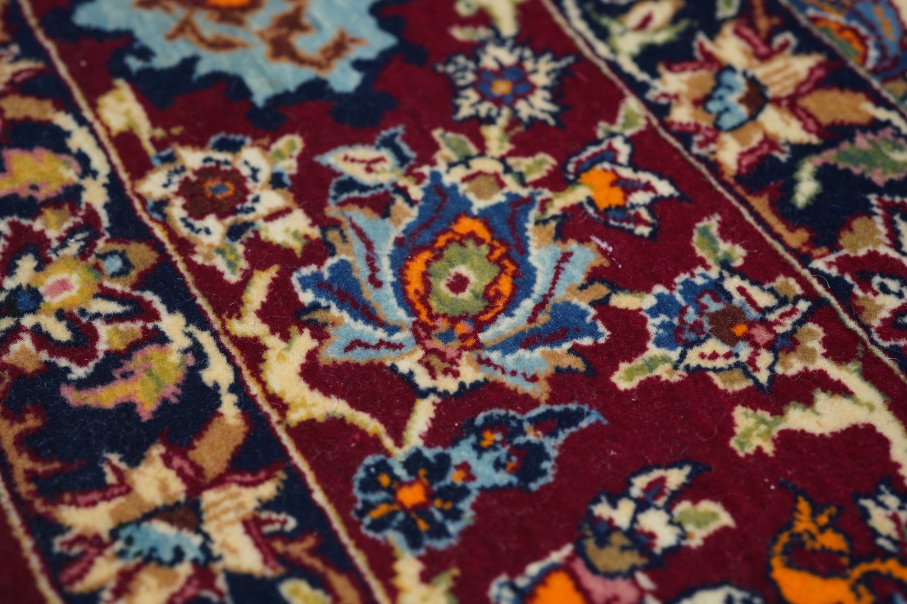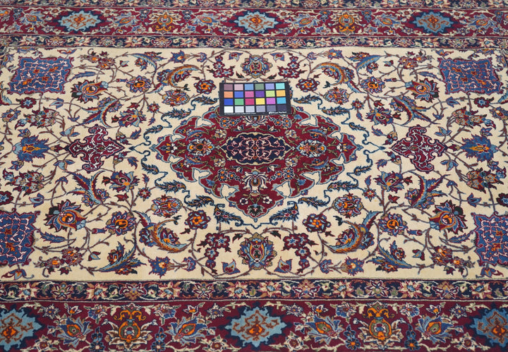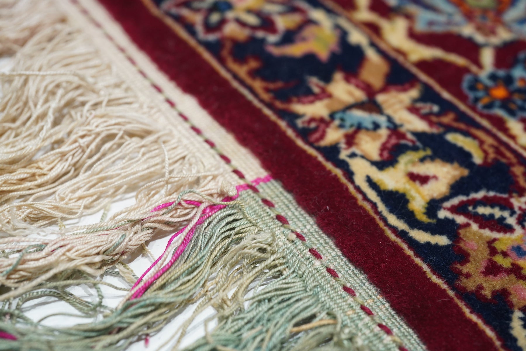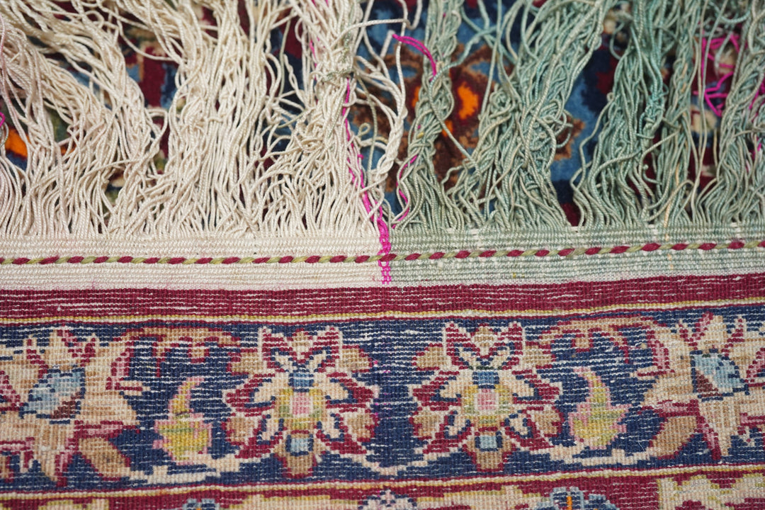 This very finely knotted central Persian city workshop small scatter shows a rainbow-colored silk warp. The palette is characteristically Isfahan with a cream field, very dark red flaming lozenge medallion and medium blue floating corners. Sickle leaves often overlap palmettes in the field. Dark red border with petal palmettes and light blue cartouches. Short, "kurk" pile. Good condition.