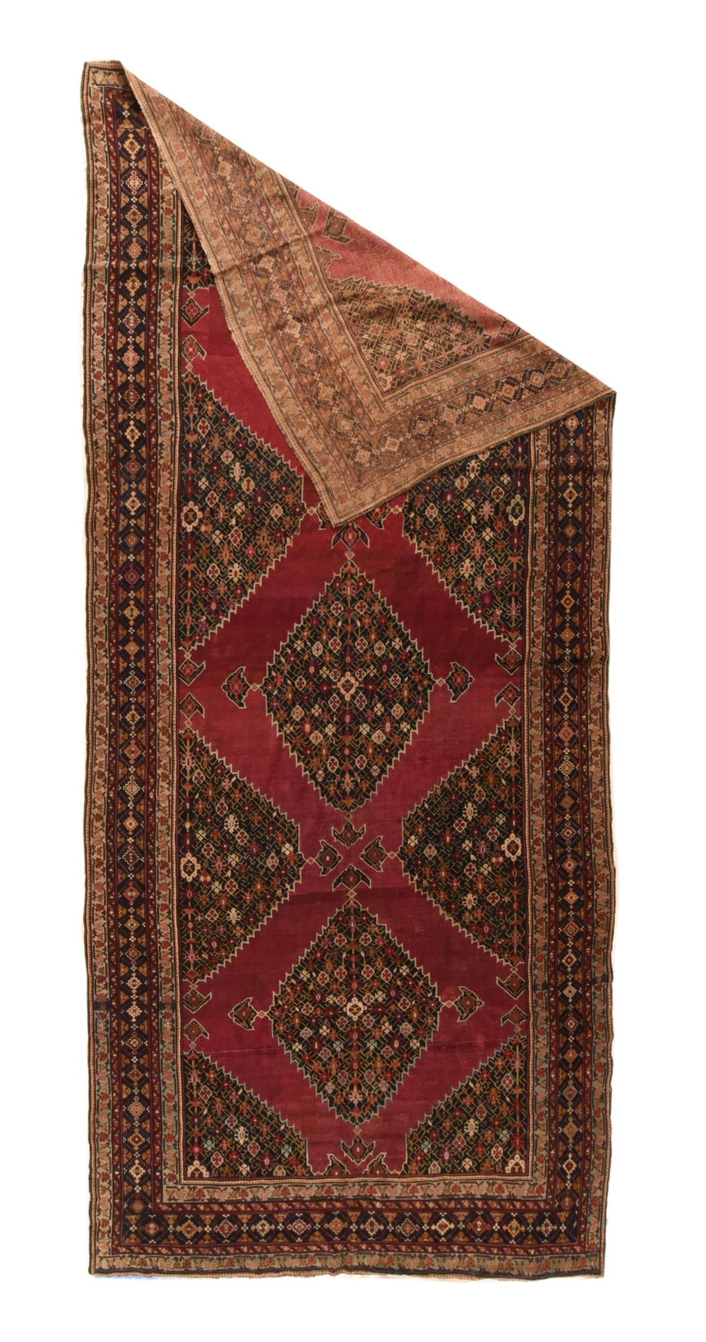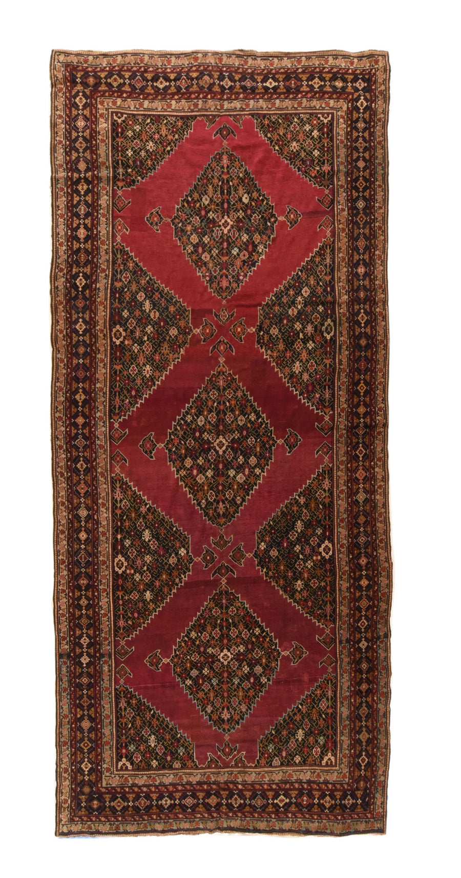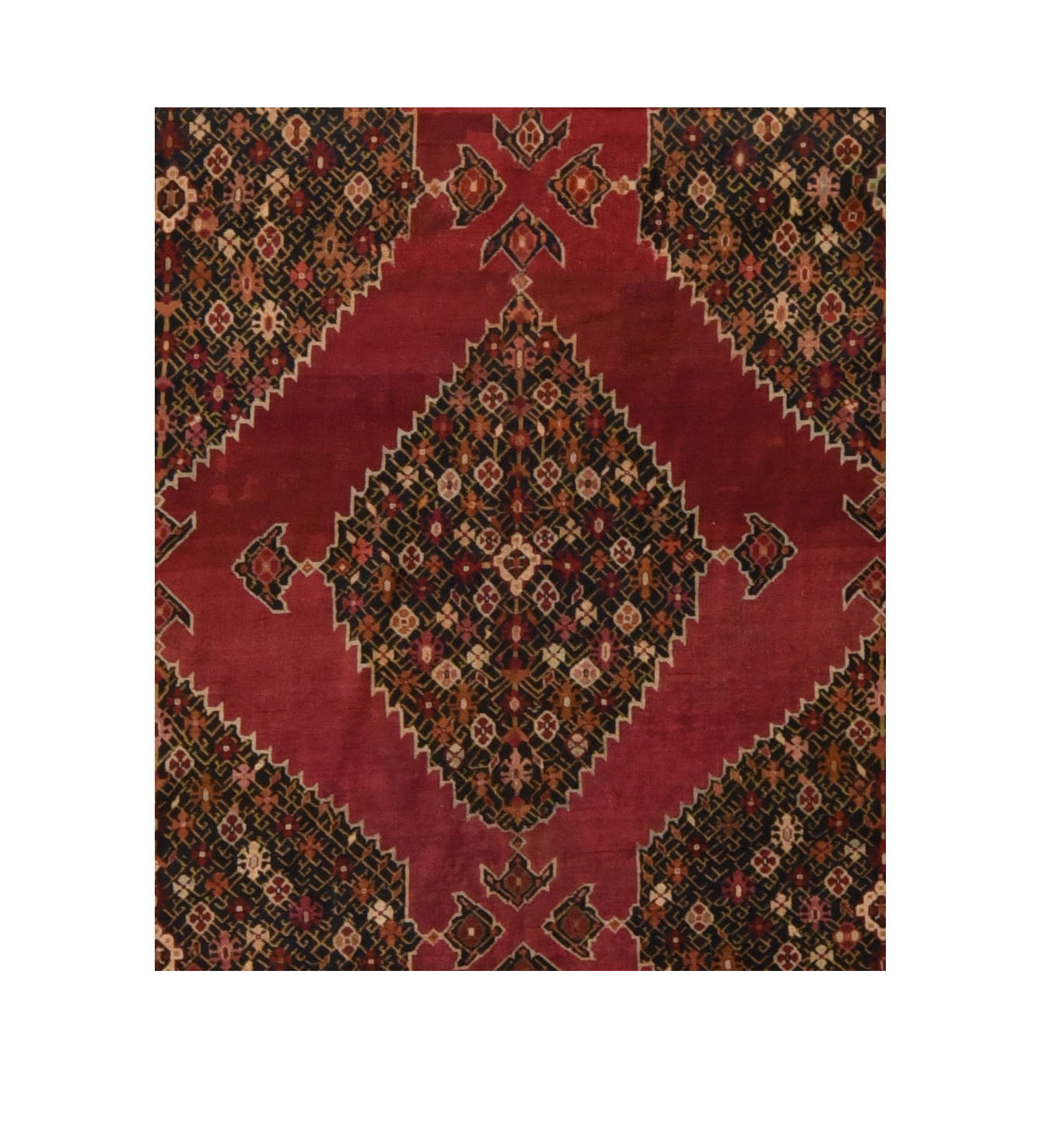 Three complete and eight fractional navy stepped millefleurs hexagonal four pendant medallions float on the plain cochineal scarlet field of this moderately woven, wool foundation south Caucasian workshop carpet, probably from Shusha. Navy border with ashiks and split triangular fillers. This type is called “Channik”. Good condition. Natural dyes.