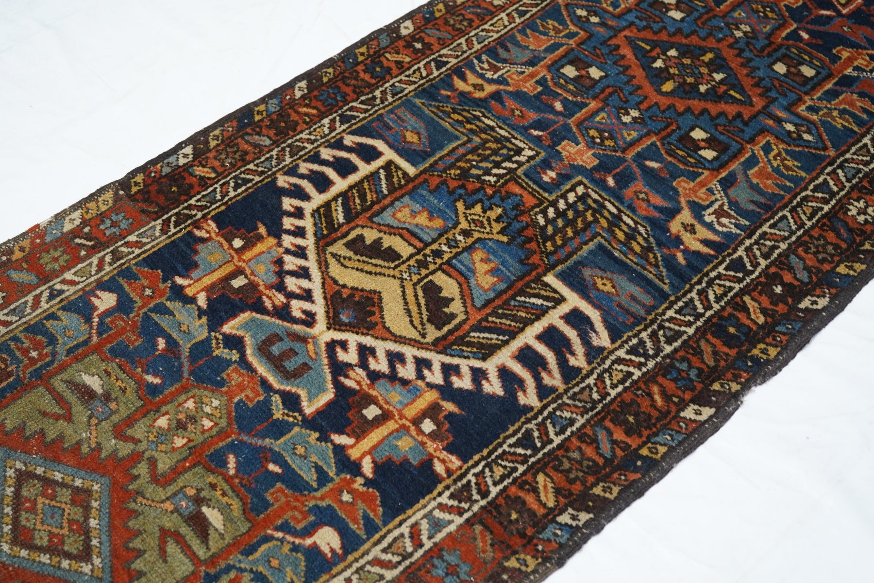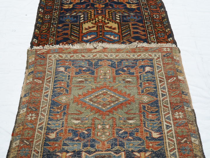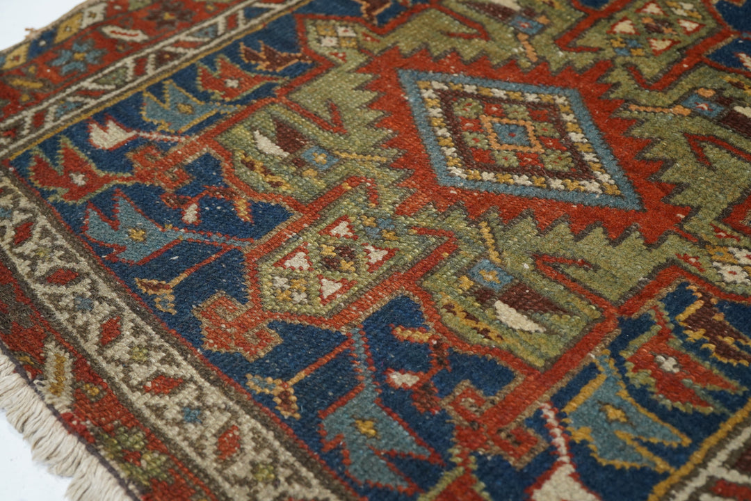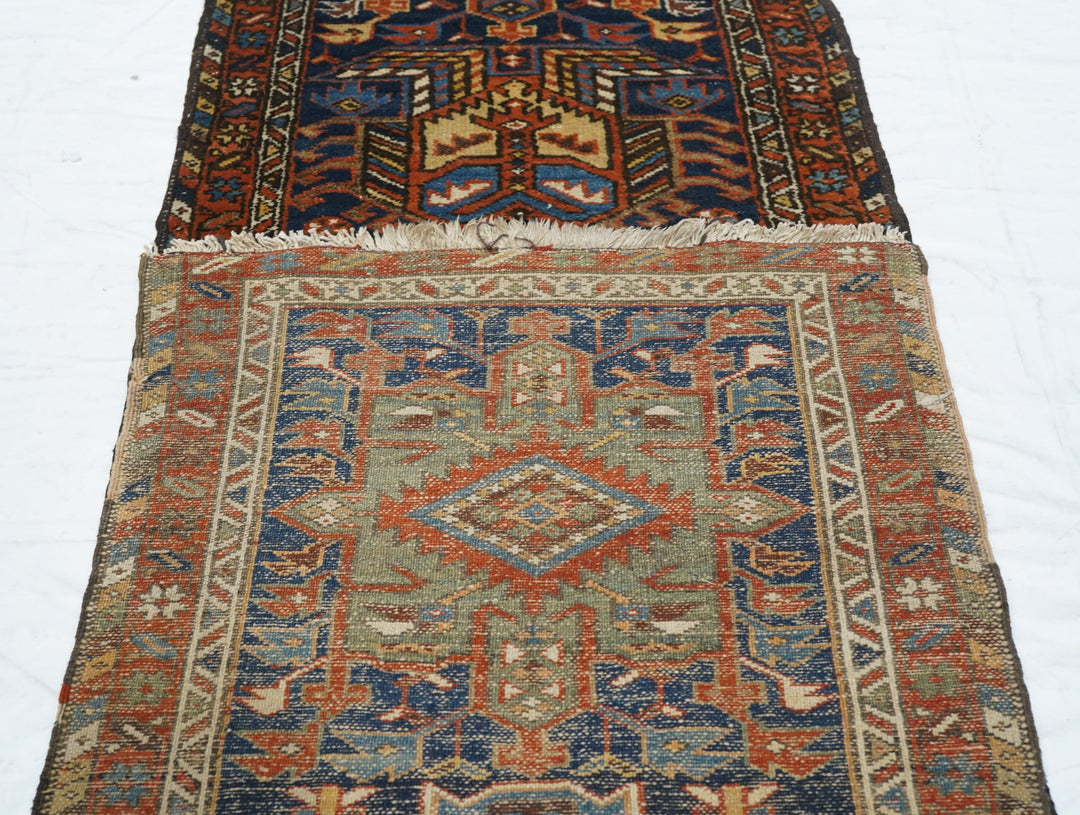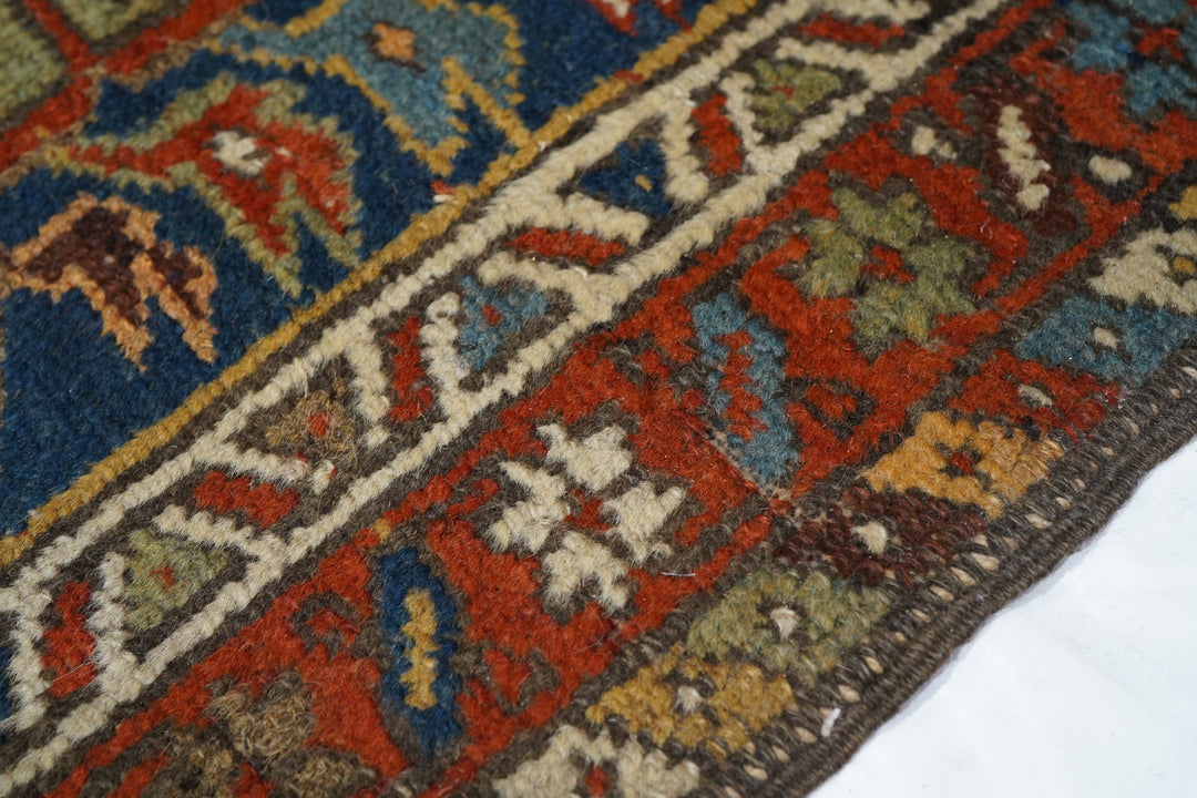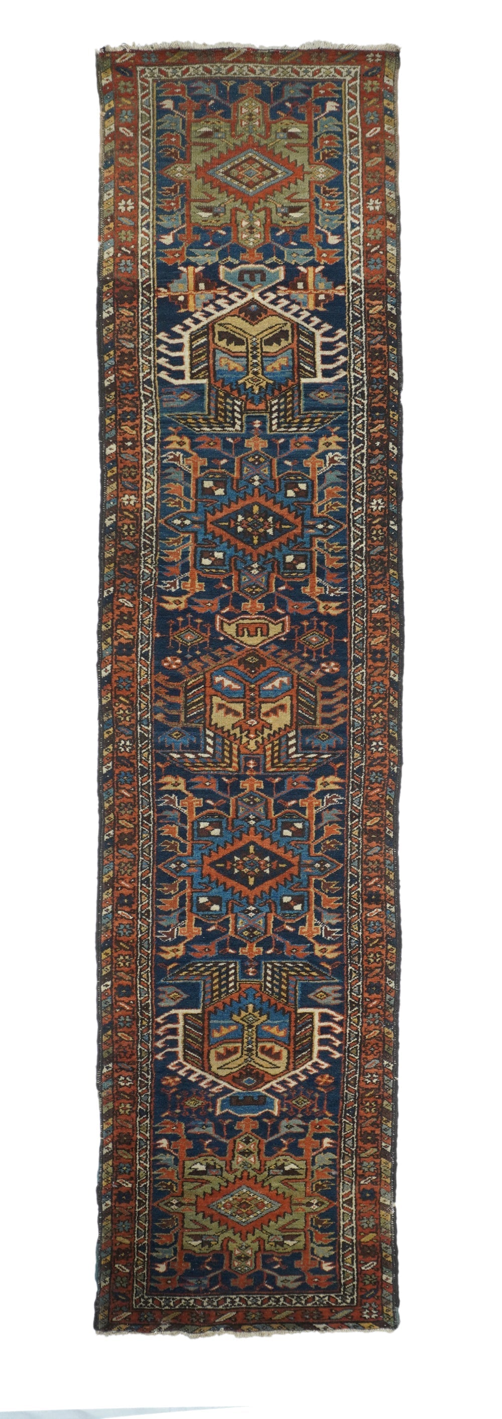 The blue field of this rustic NW Persian runner displays seven characteristic octogrammes and hooked complex abstract palmette medallions, with ecru, green and medium blue accents. The red border shows stars and oblique bars. Moderate weave on cotton, from the general Heriz weaving district.