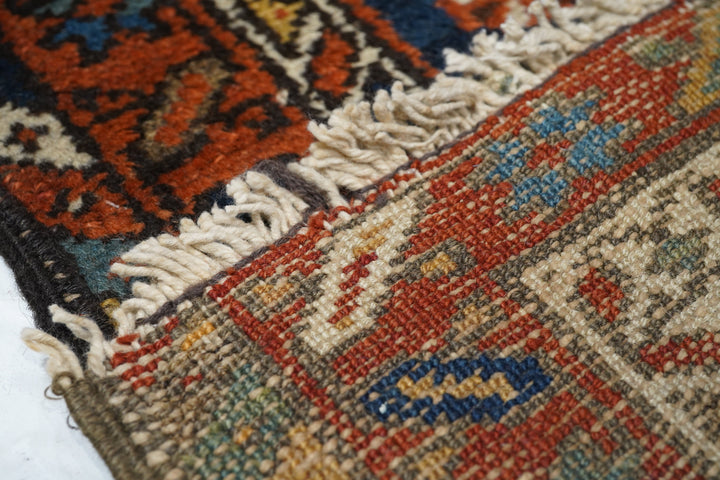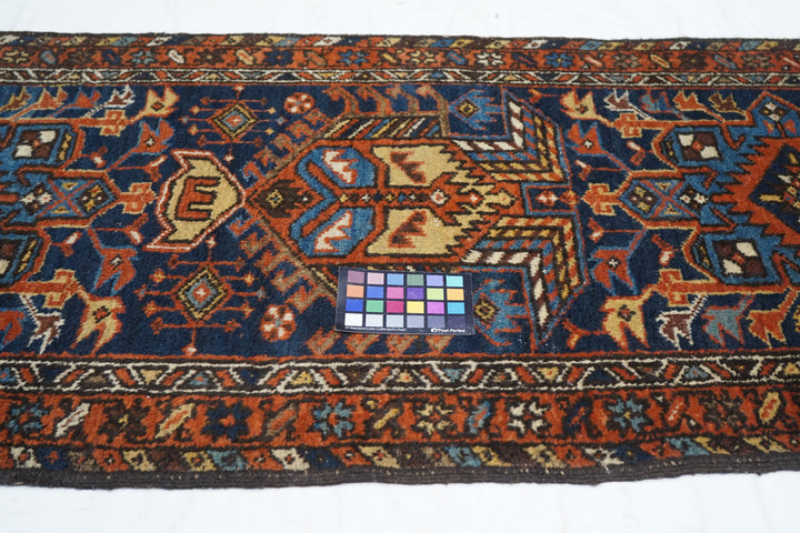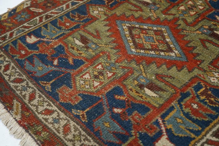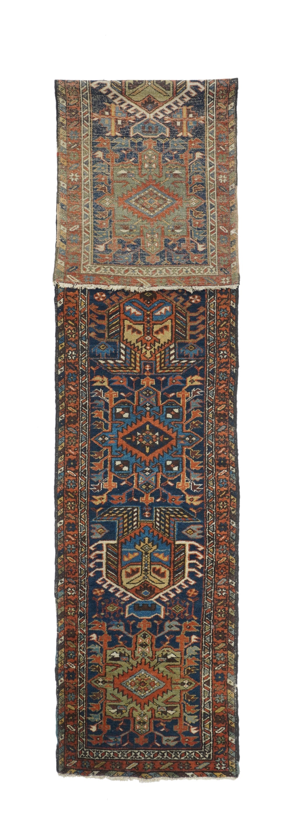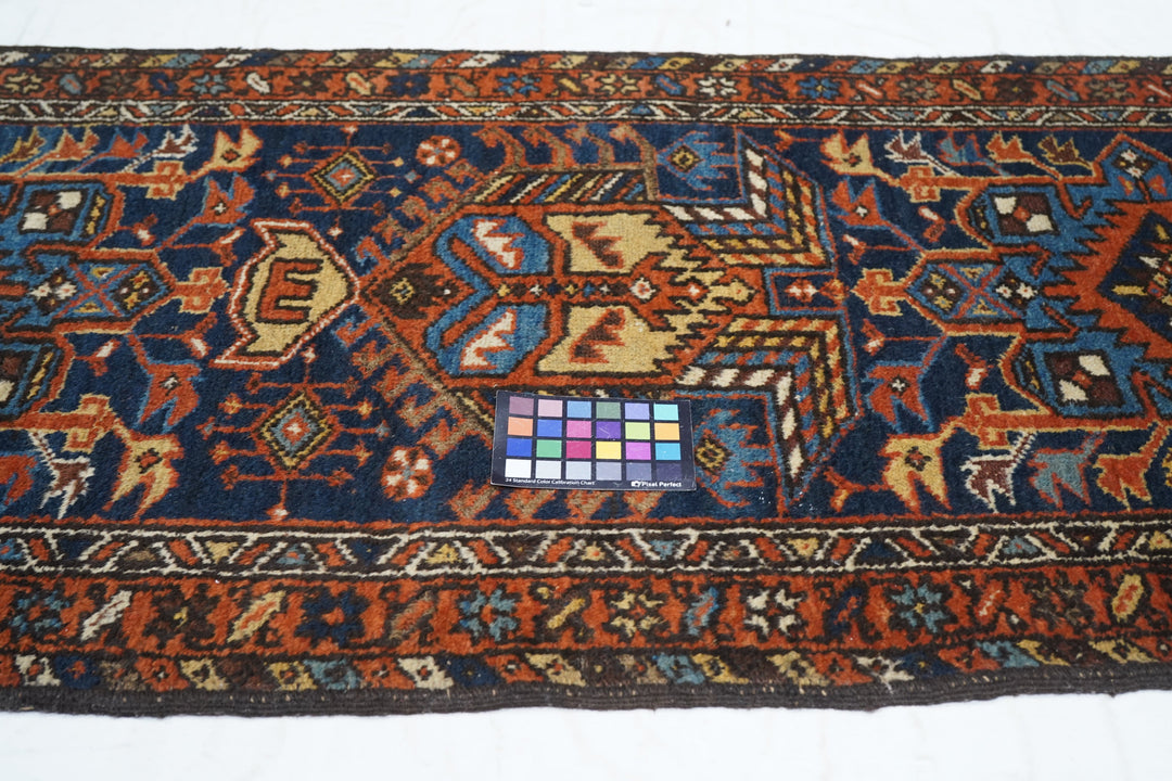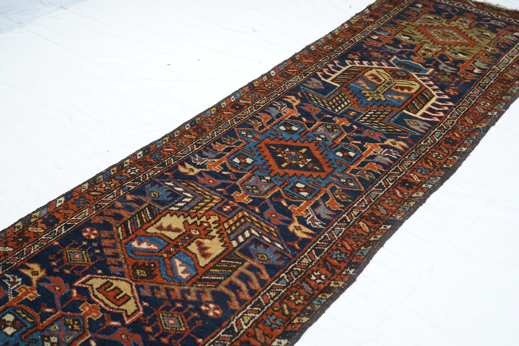 The blue field of this rustic NW Persian runner displays seven characteristic octogrammes and hooked complex abstract palmette medallions, with ecru, green and medium blue accents. The red border shows stars and oblique bars. Moderate weave on cotton, from the general Heriz weaving district.