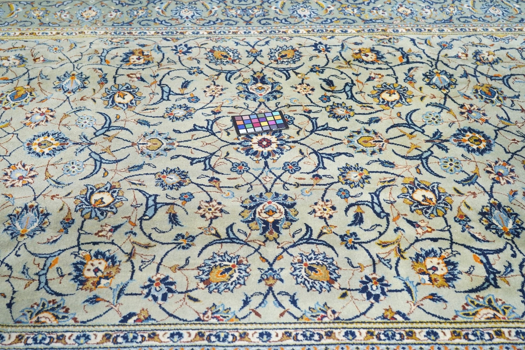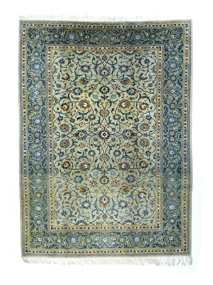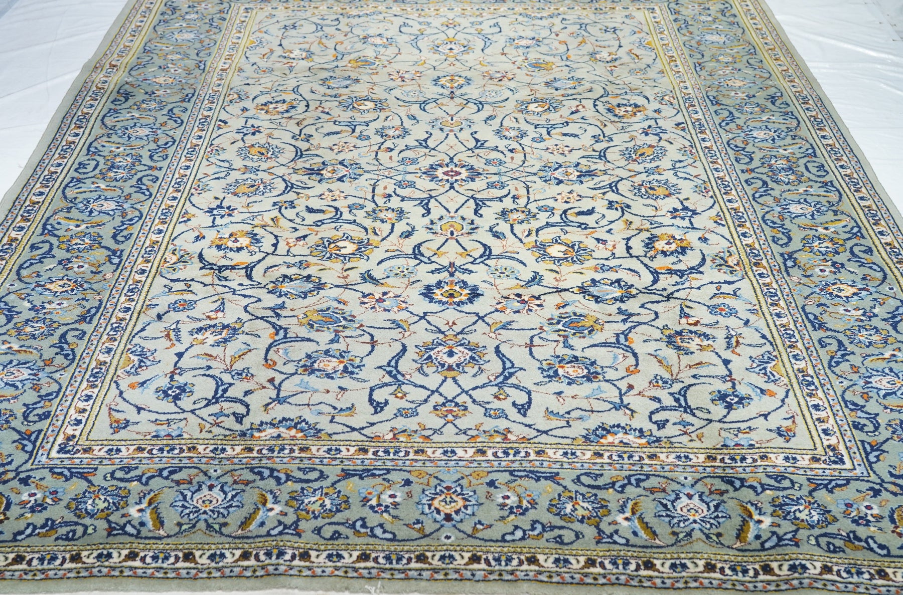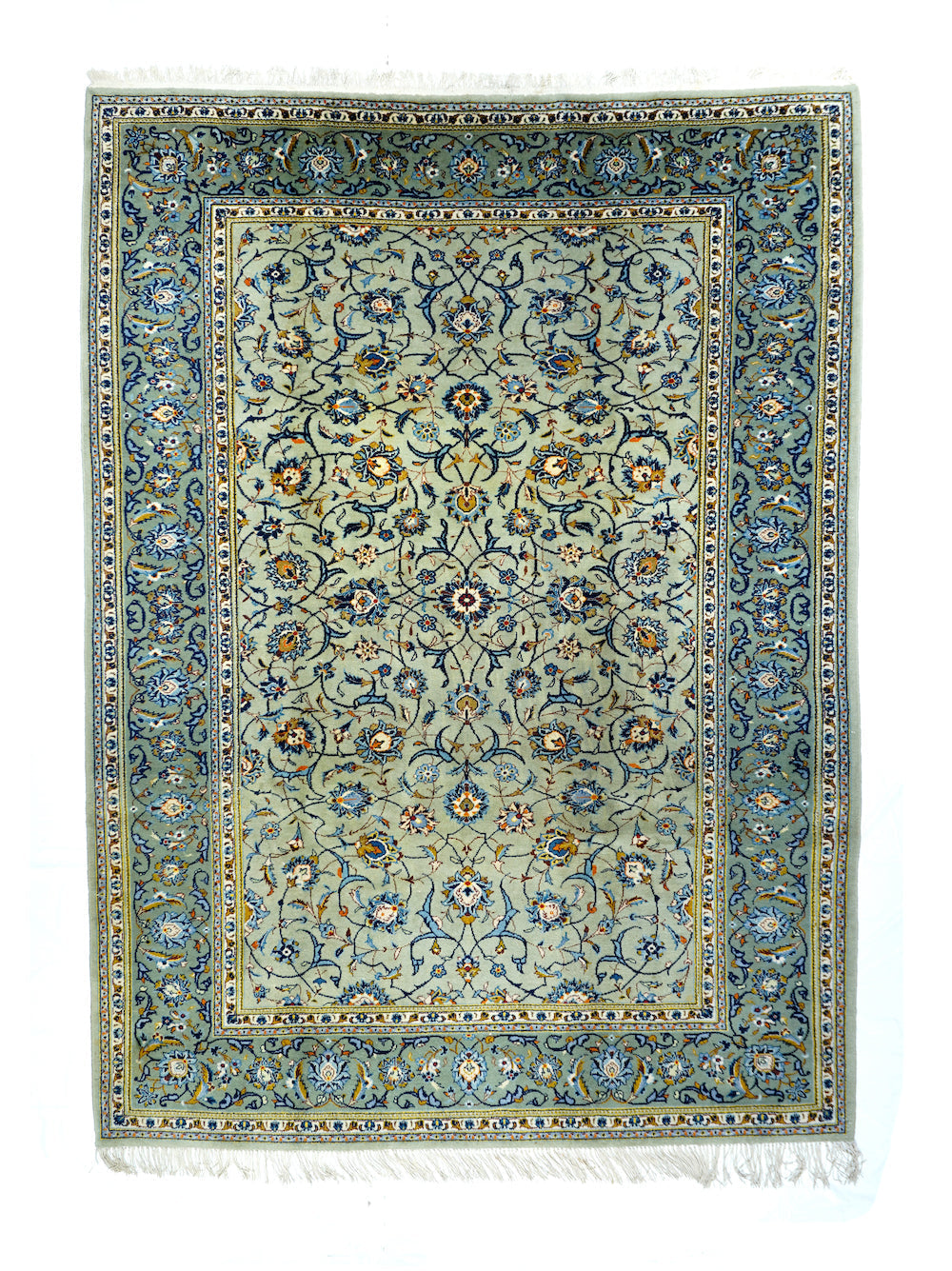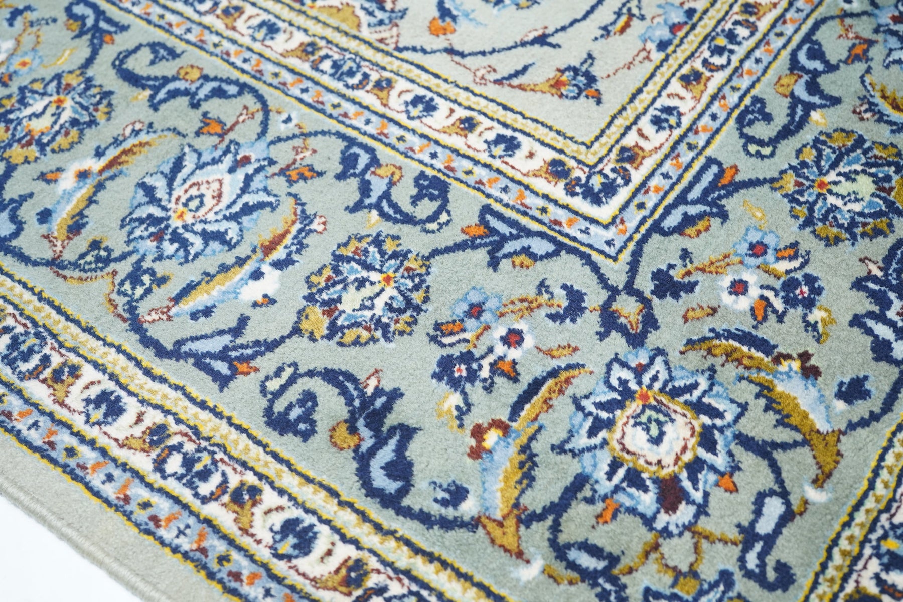 Shades of light and royal blue accent the peal palmettes, forked arabesques and two-level vinery adorning the putty ground of this centrally organized central Persian finely woven city carpet. Green border with similarly toned petal palmettes and barbed leaves. Tangerine accents overall. Short pile. Good condition.