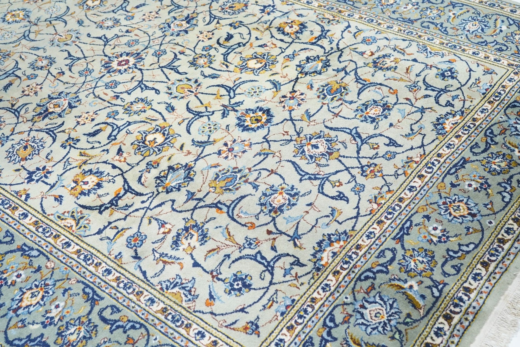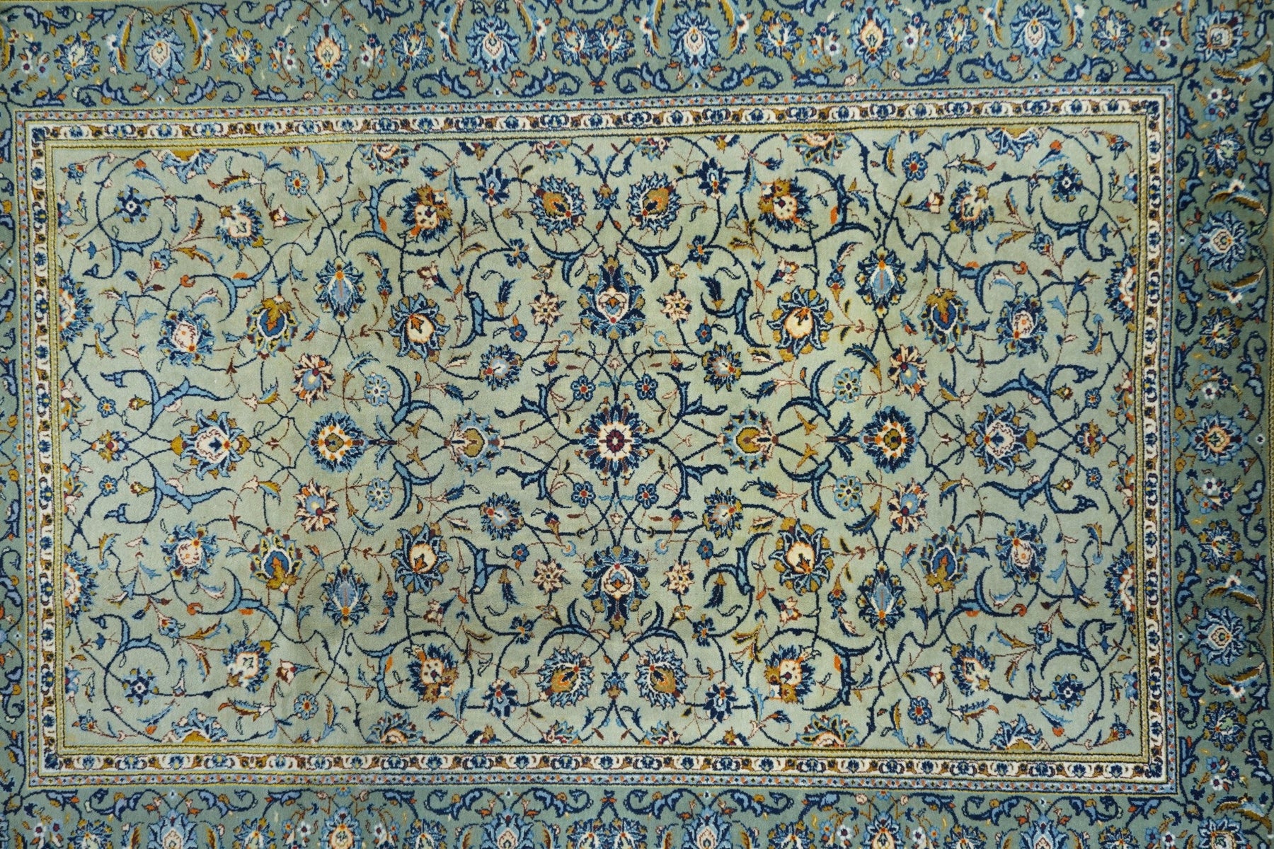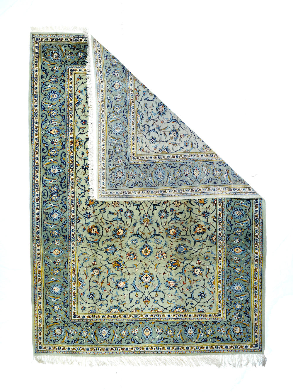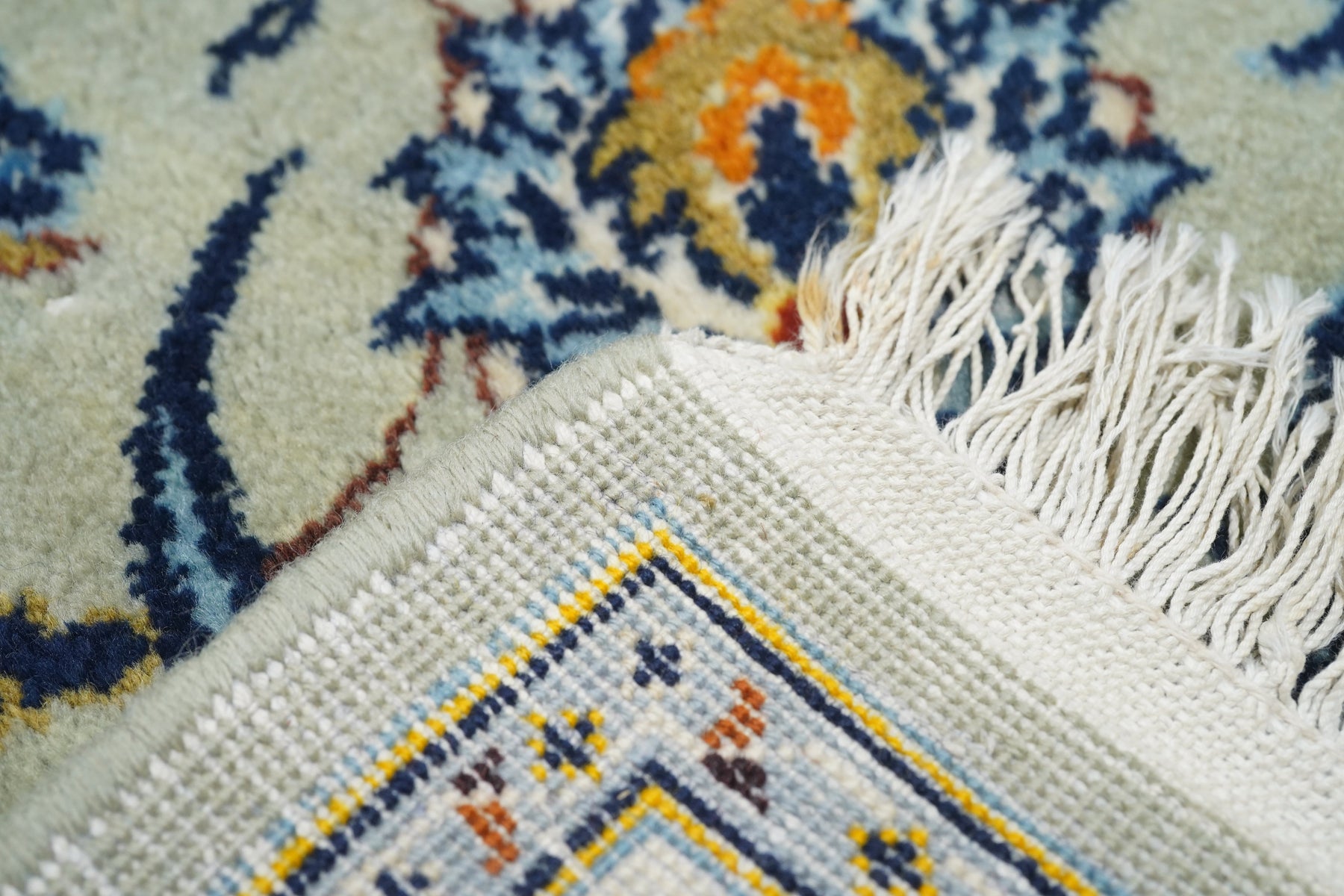 Shades of light and royal blue accent the peal palmettes, forked arabesques and two-level vinery adorning the putty ground of this centrally organized central Persian finely woven city carpet. Green border with similarly toned petal palmettes and barbed leaves. Tangerine accents overall. Short pile. Good condition.