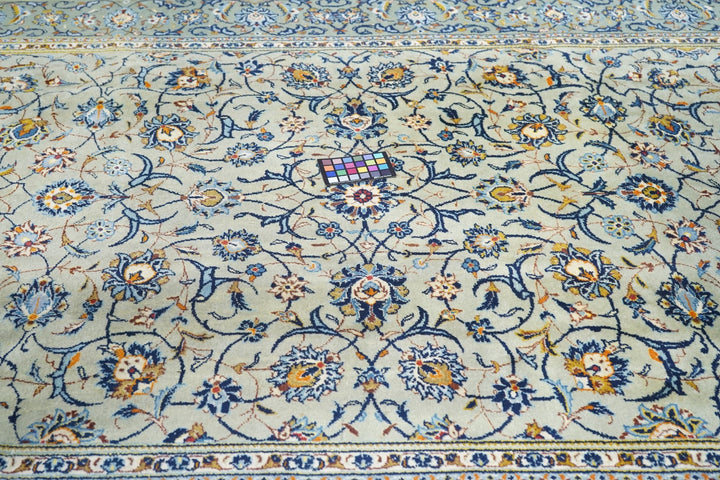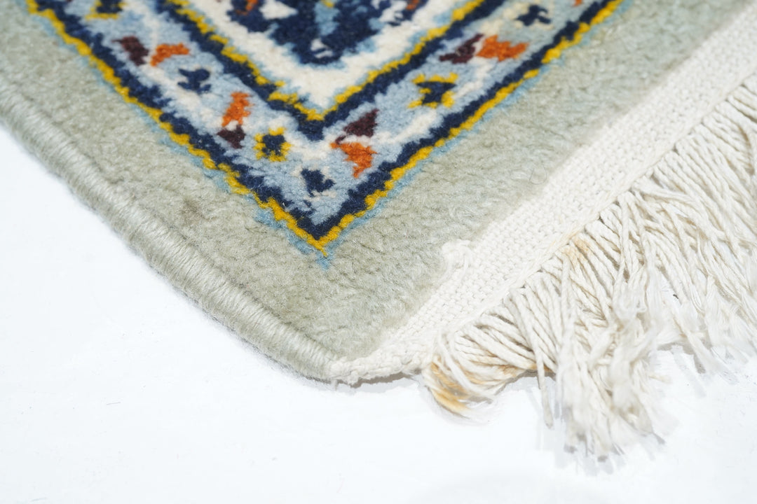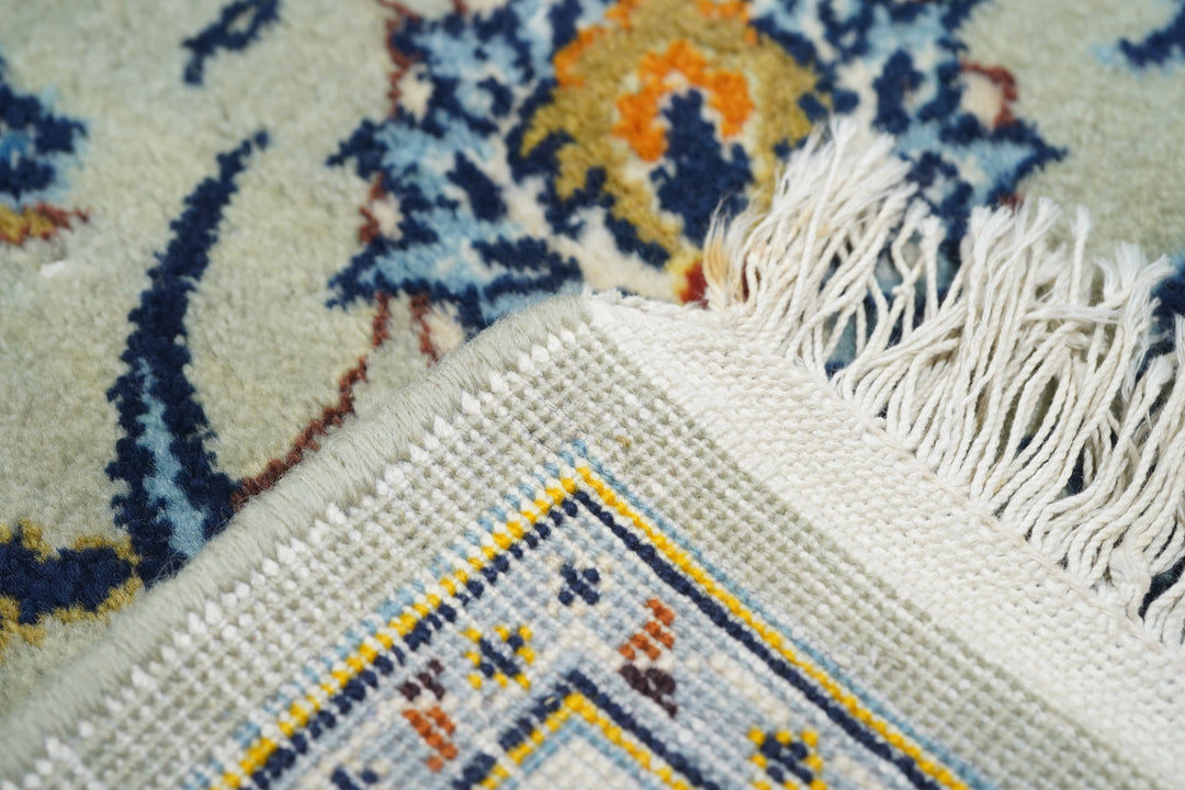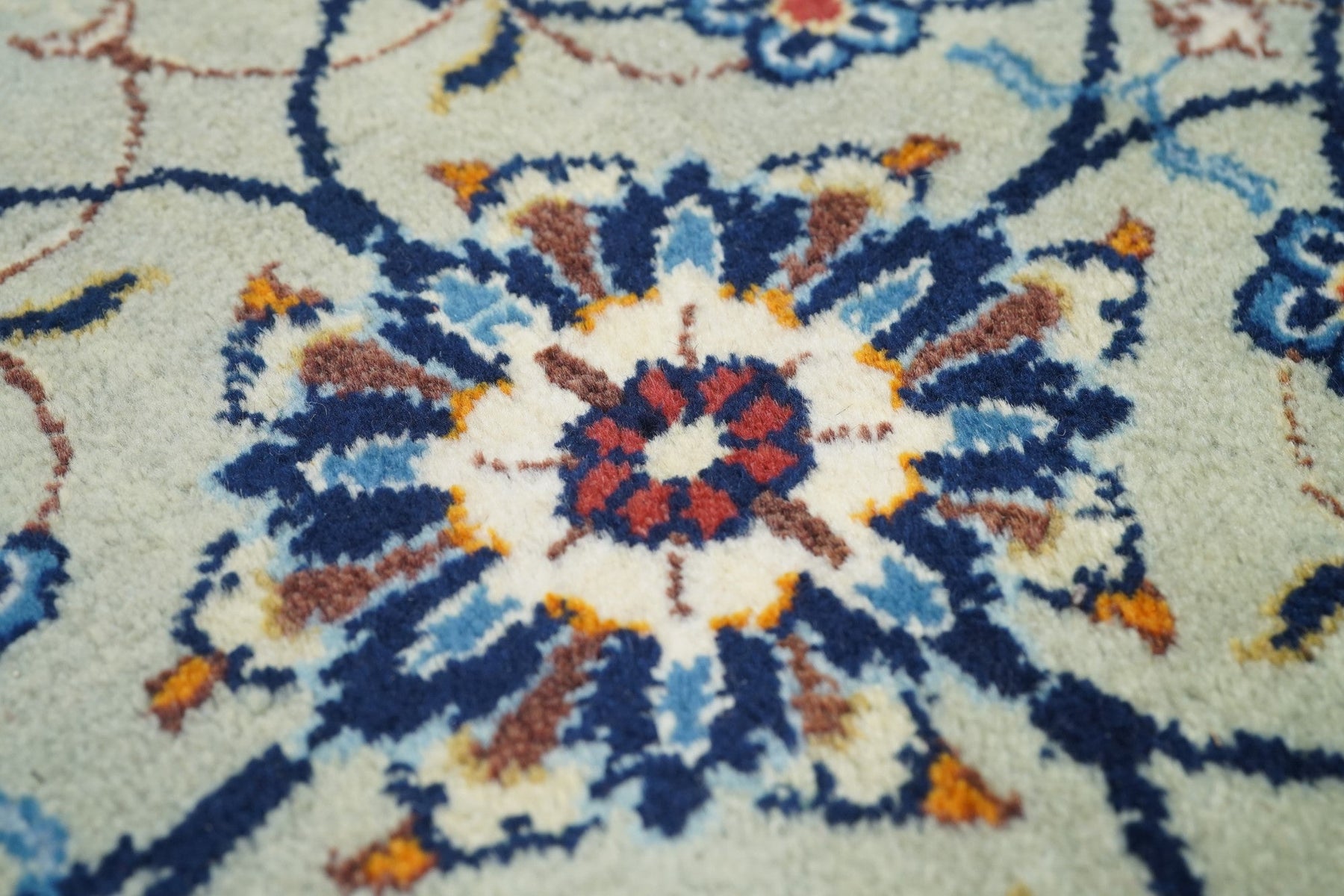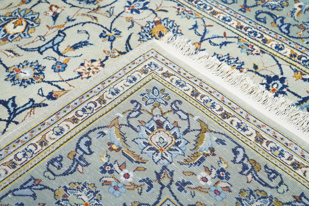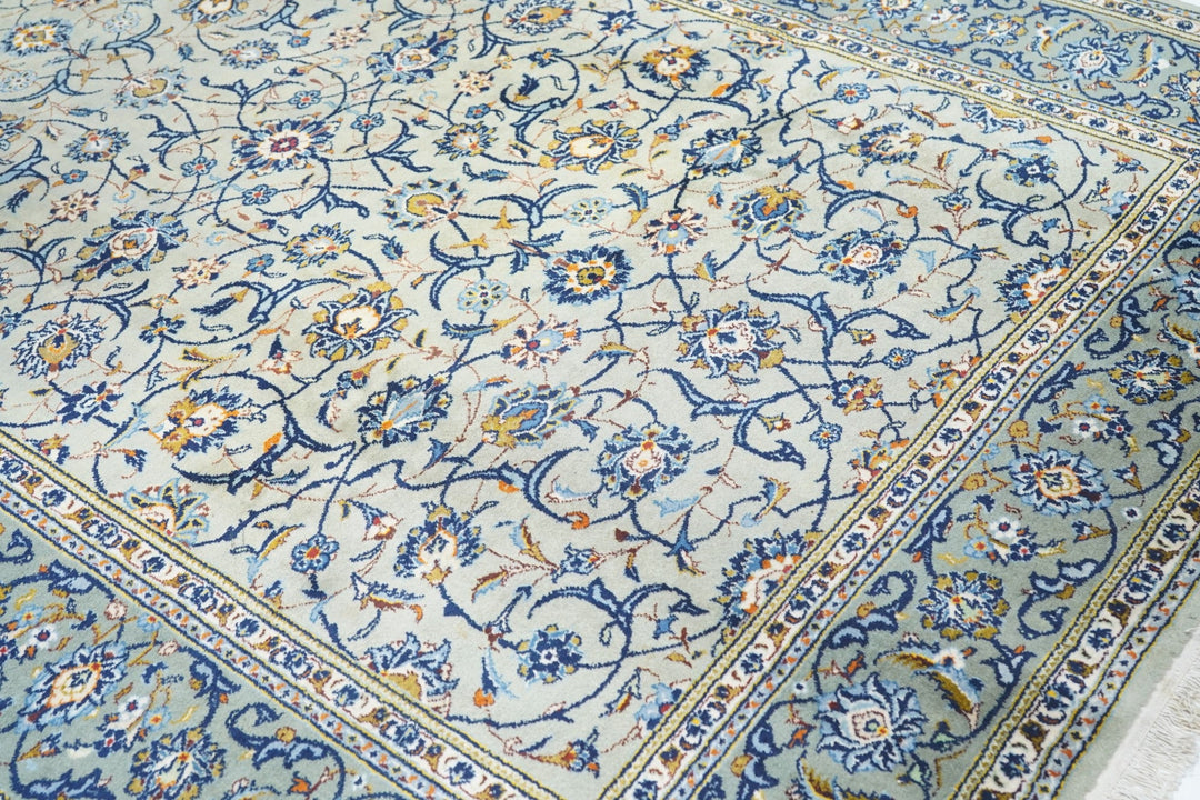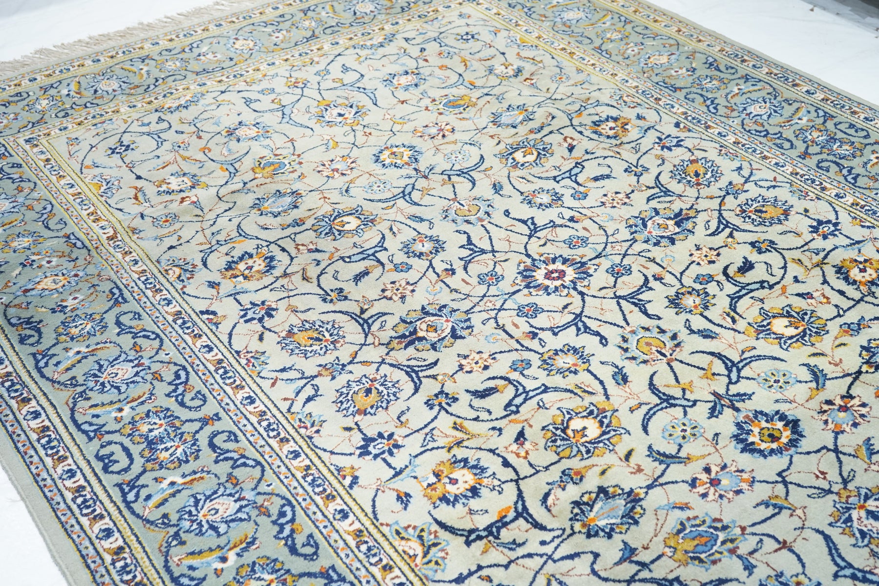 Shades of light and royal blue accent the peal palmettes, forked arabesques and two-level vinery adorning the putty ground of this centrally organized central Persian finely woven city carpet. Green border with similarly toned petal palmettes and barbed leaves. Tangerine accents overall. Short pile. Good condition.