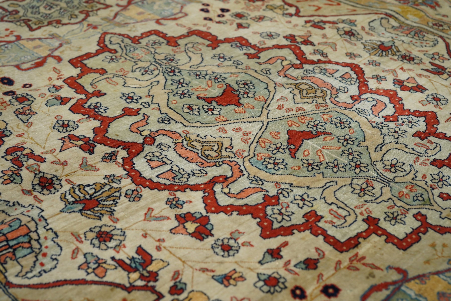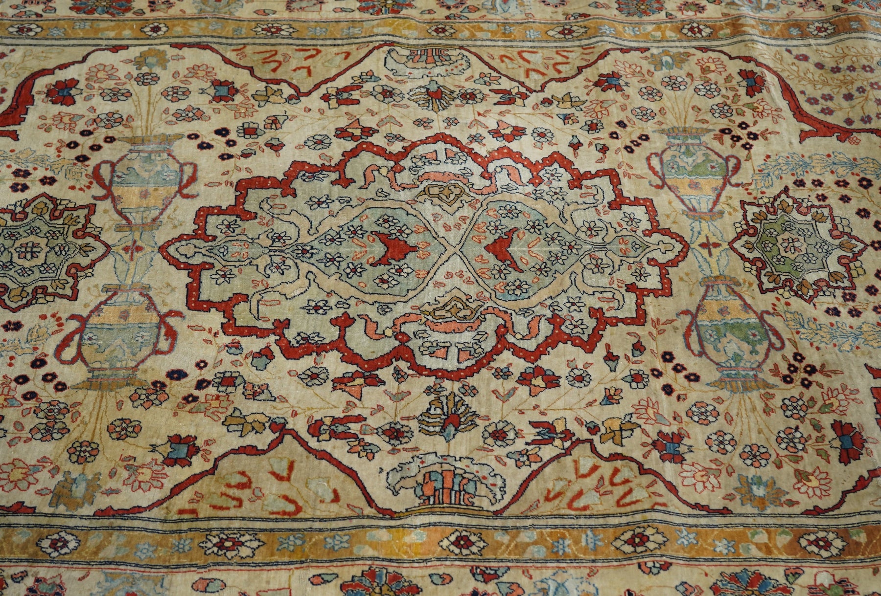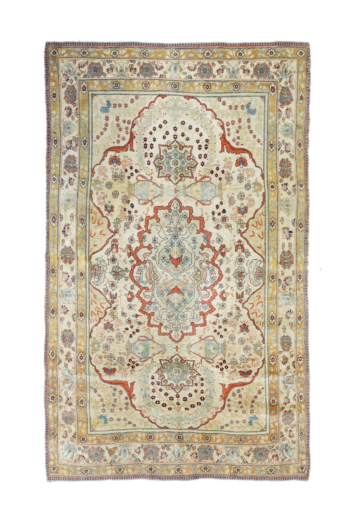 Central Persian city known for finely woven. room size and scatter rugs, with dominant reds and navy, and medallion patterns and swirling palmettes. Active since the 16th century, but with breaks, Revival began with Mohtasham (see below) in the 1880’s. Generally medium-high prices.