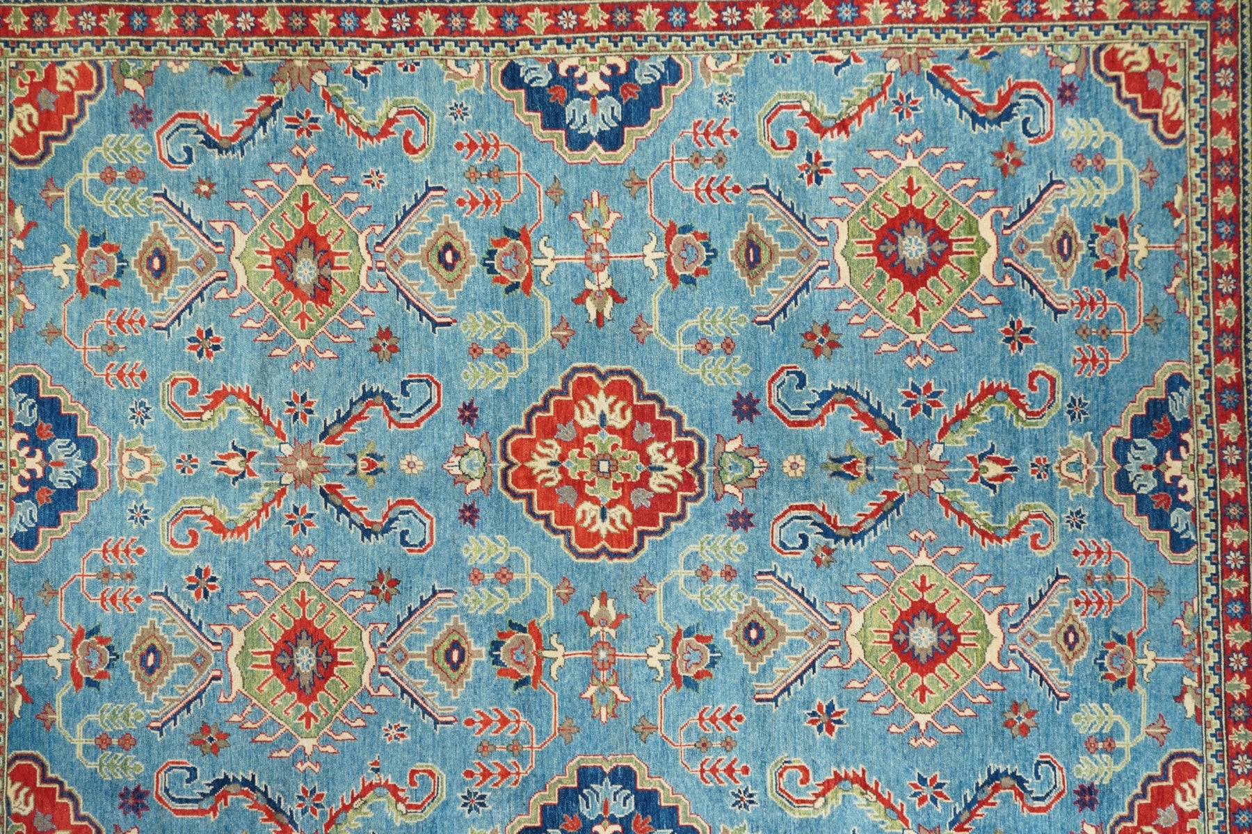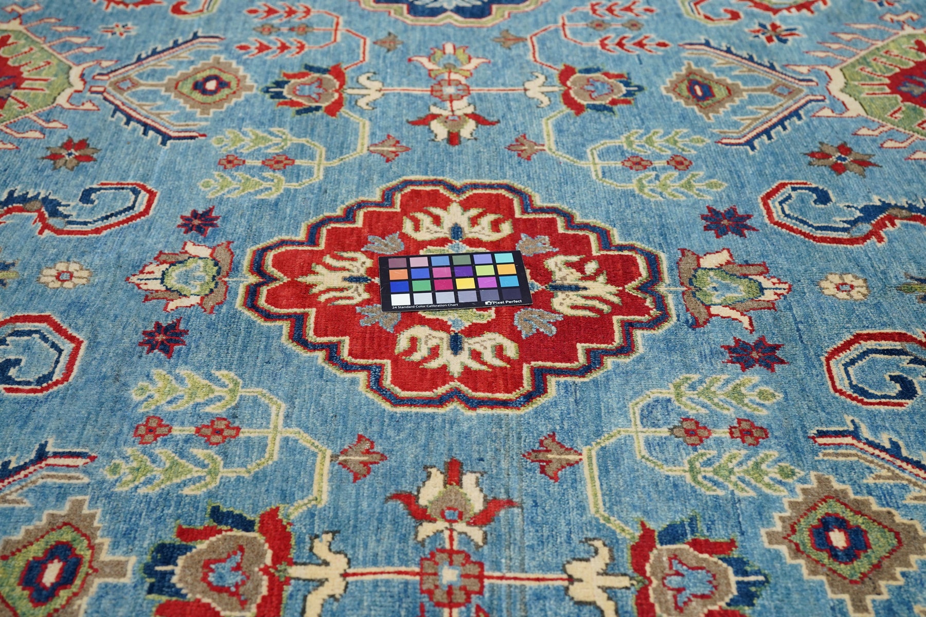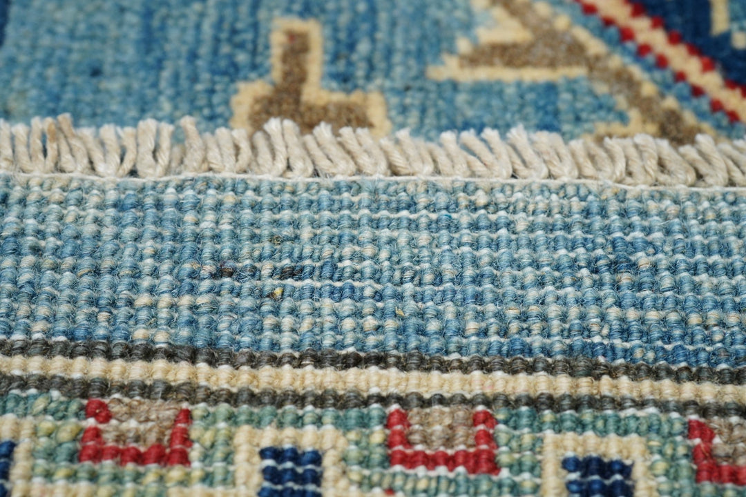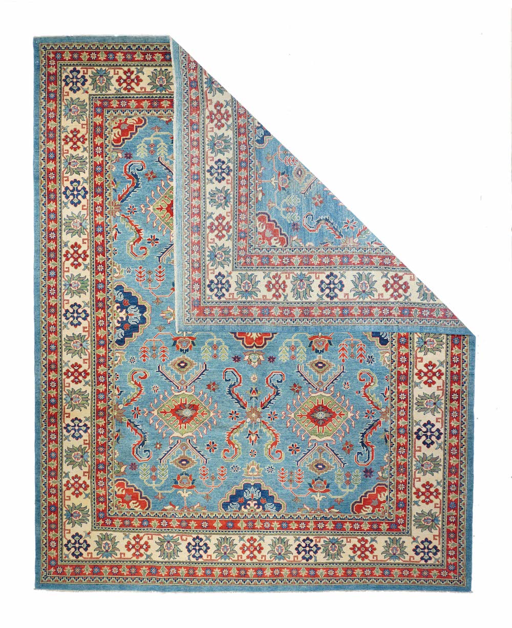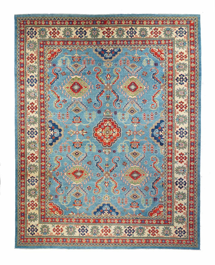 The gently abrashed sky blue field of this modern Caucasian-style carpet is centred by a lobe-stepped red medallion and four matching royal blue motives along the side and ends. Hooked lozenges, volute ended leaves and small petal palmettes are among the field elements. Straw-ecru main border with an alternation of petal palmettes and equal arm crosses. Plain sky blue outer surround. New condition. Medium weave.