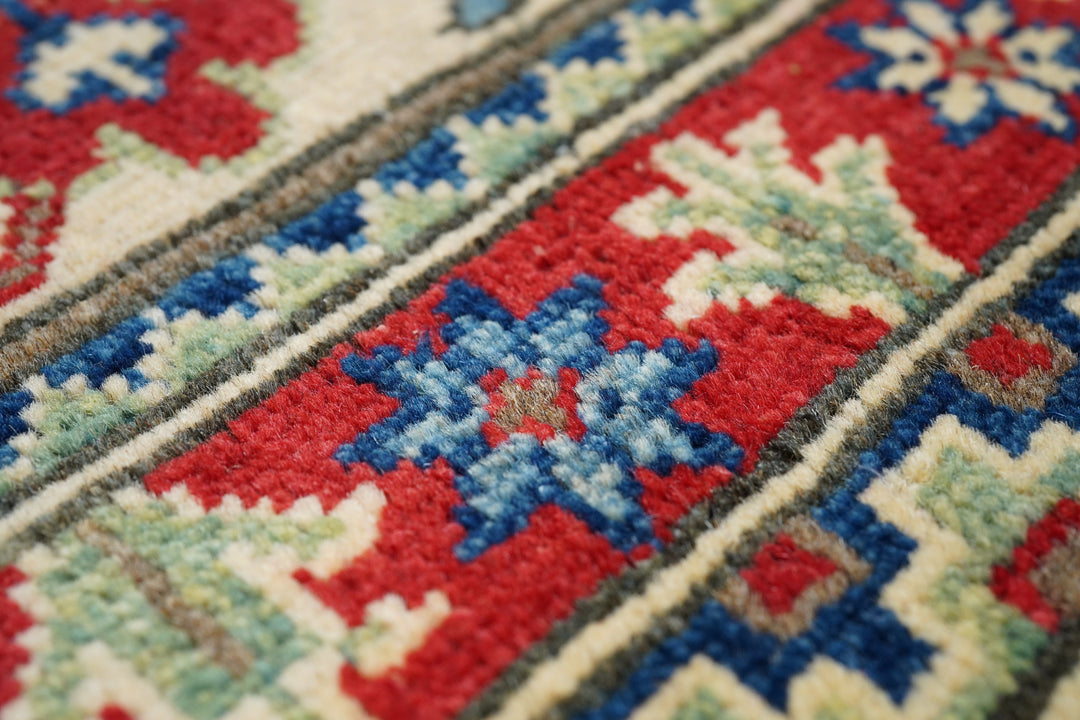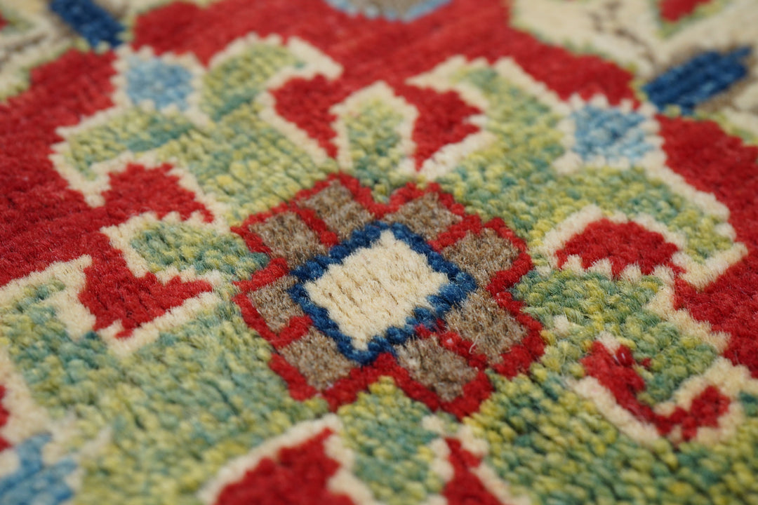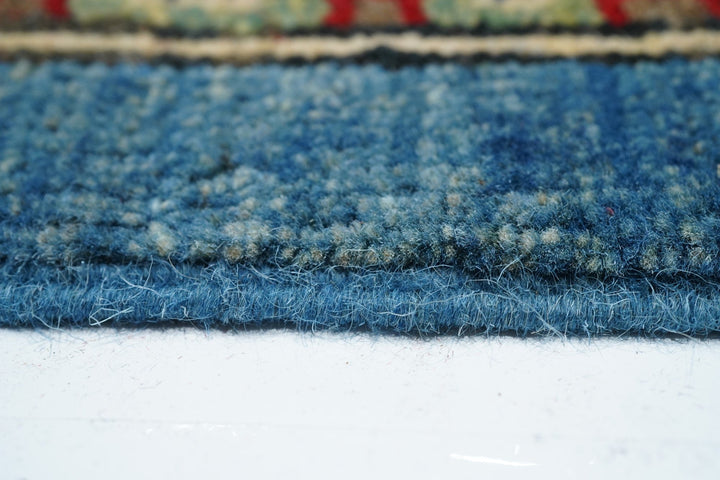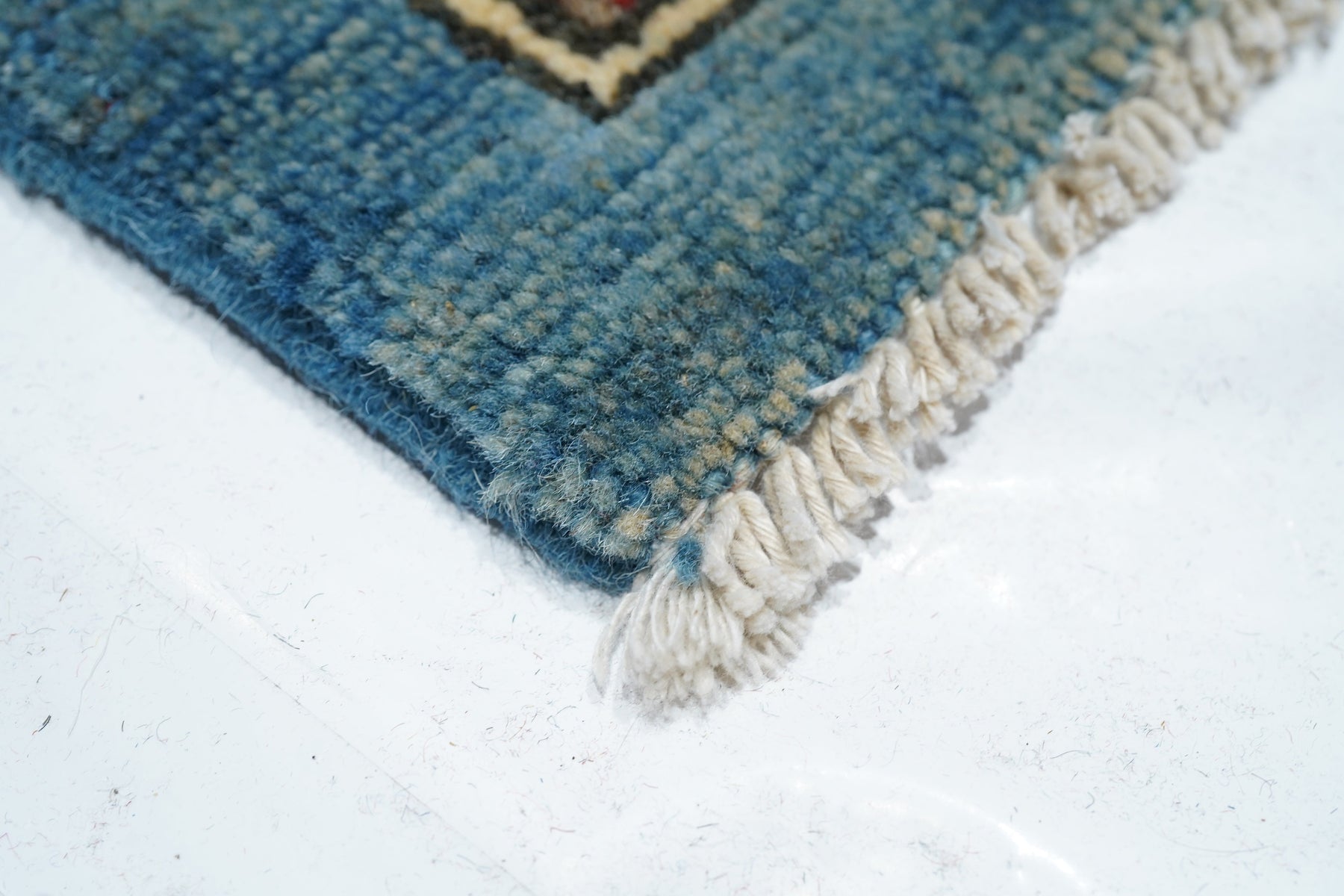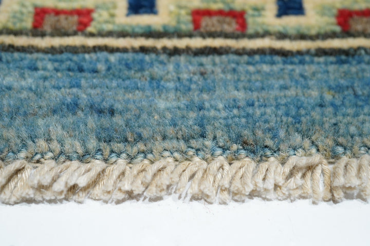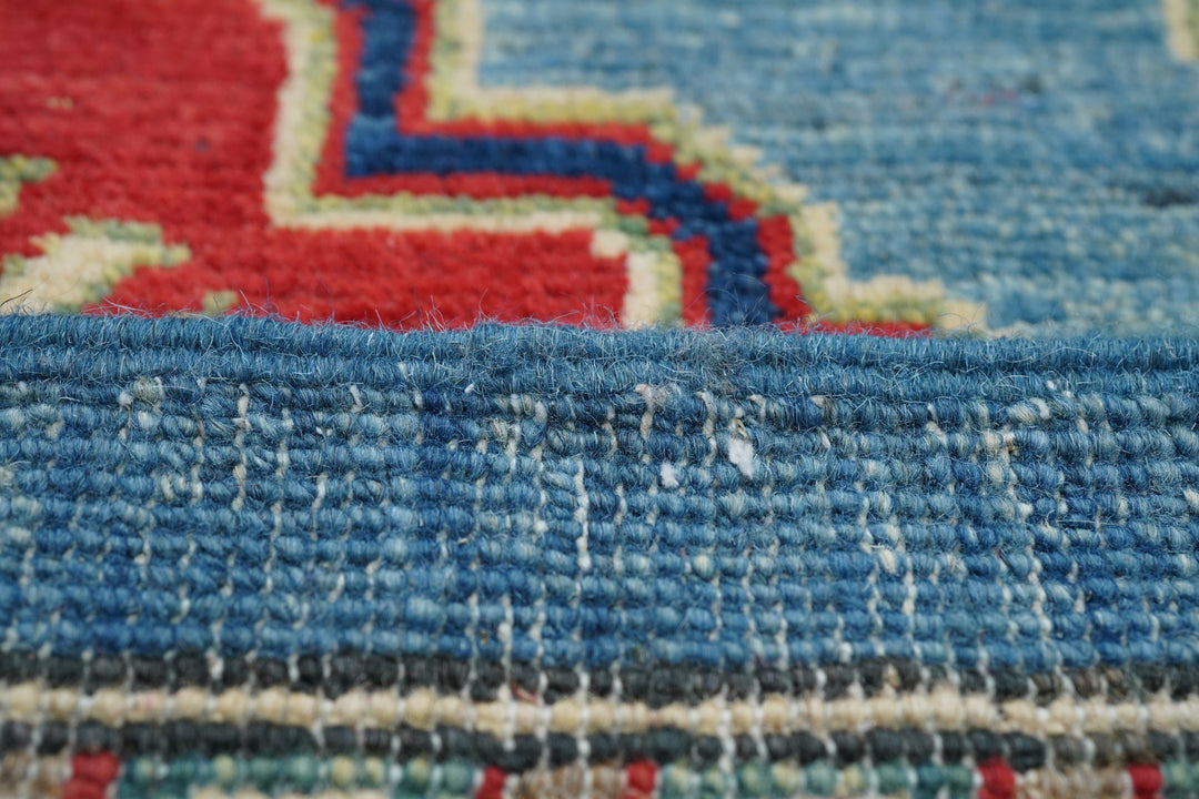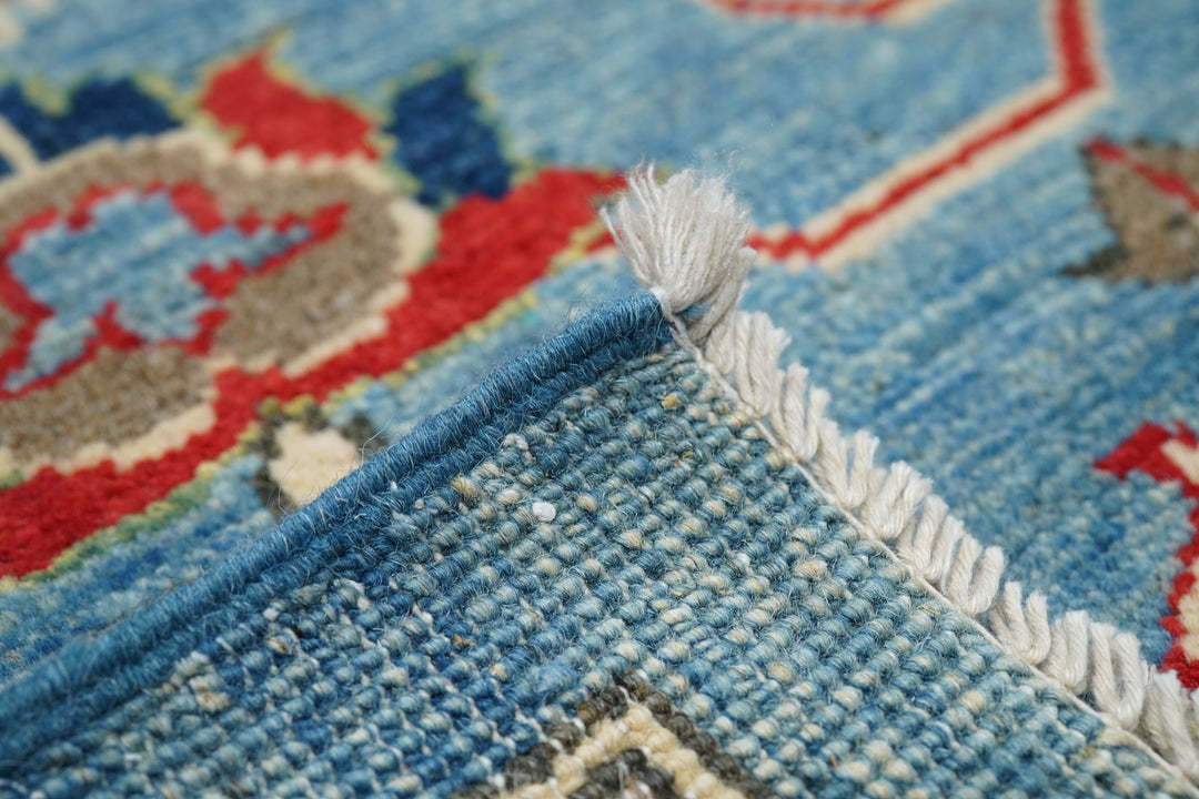 The gently abrashed sky blue field of this modern Caucasian-style carpet is centred by a lobe-stepped red medallion and four matching royal blue motives along the side and ends. Hooked lozenges, volute ended leaves and small petal palmettes are among the field elements. Straw-ecru main border with an alternation of petal palmettes and equal arm crosses. Plain sky blue outer surround. New condition. Medium weave.