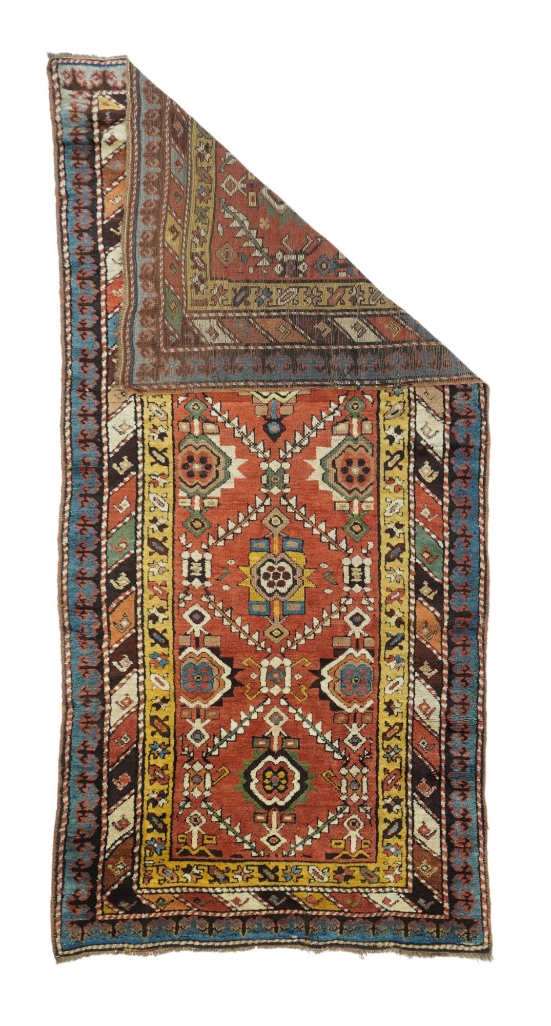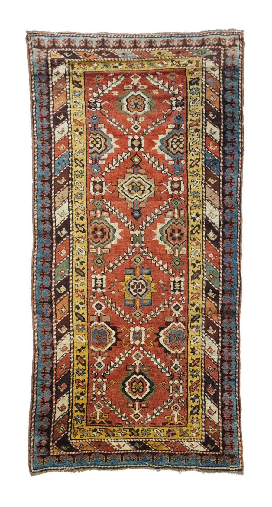 With a warm madder red field divided evenly by a doubly stepped lattice into reserves centred by pinched octagonal elements. An allover textile pattern. Color diagonal stripe middle border and bitonal keyhole reciprocal outer in the Sarab manner. Wool foundation, moderate rustic weave. Good condition.