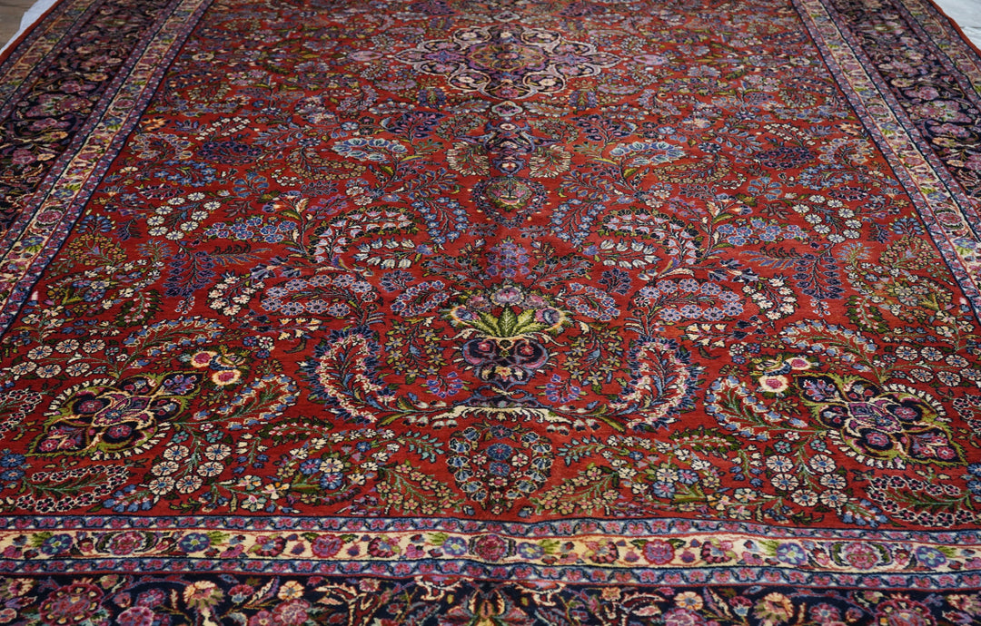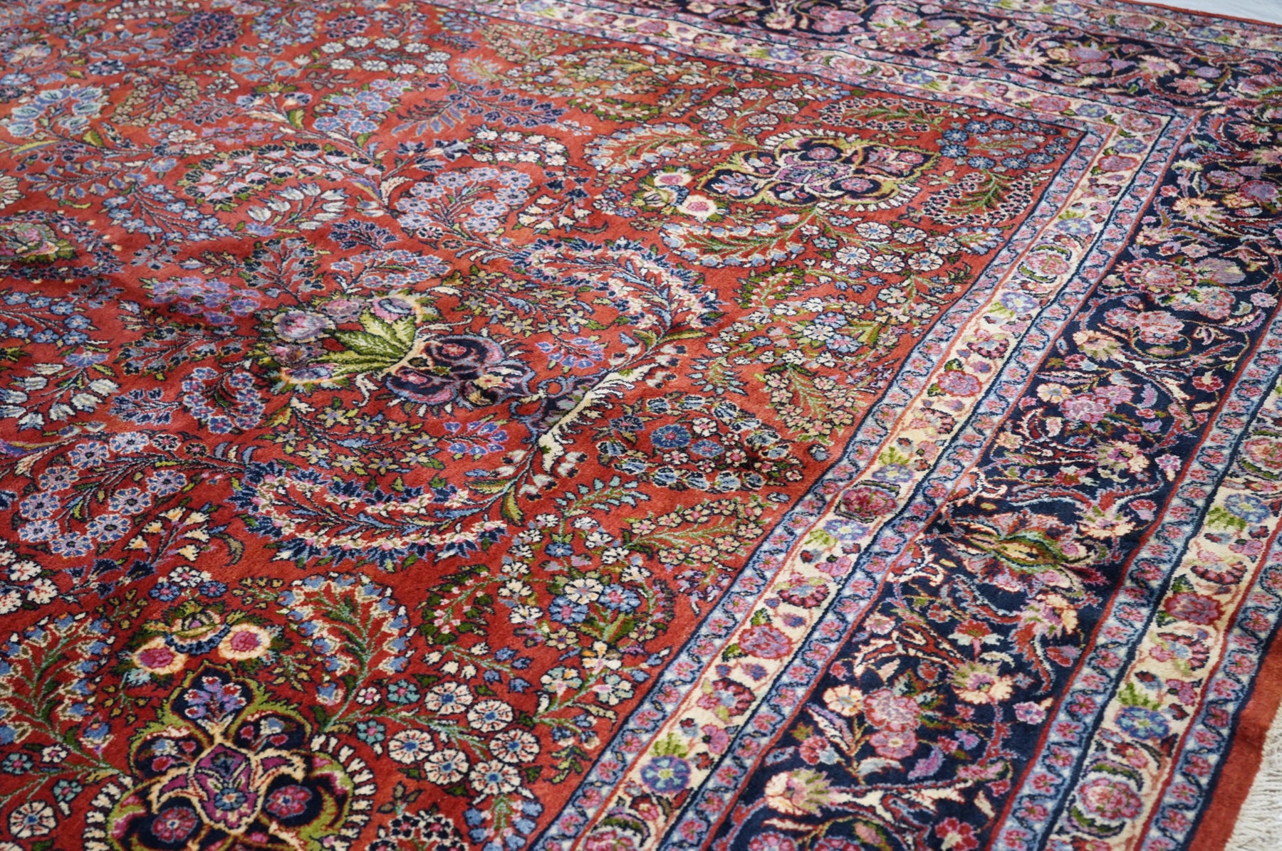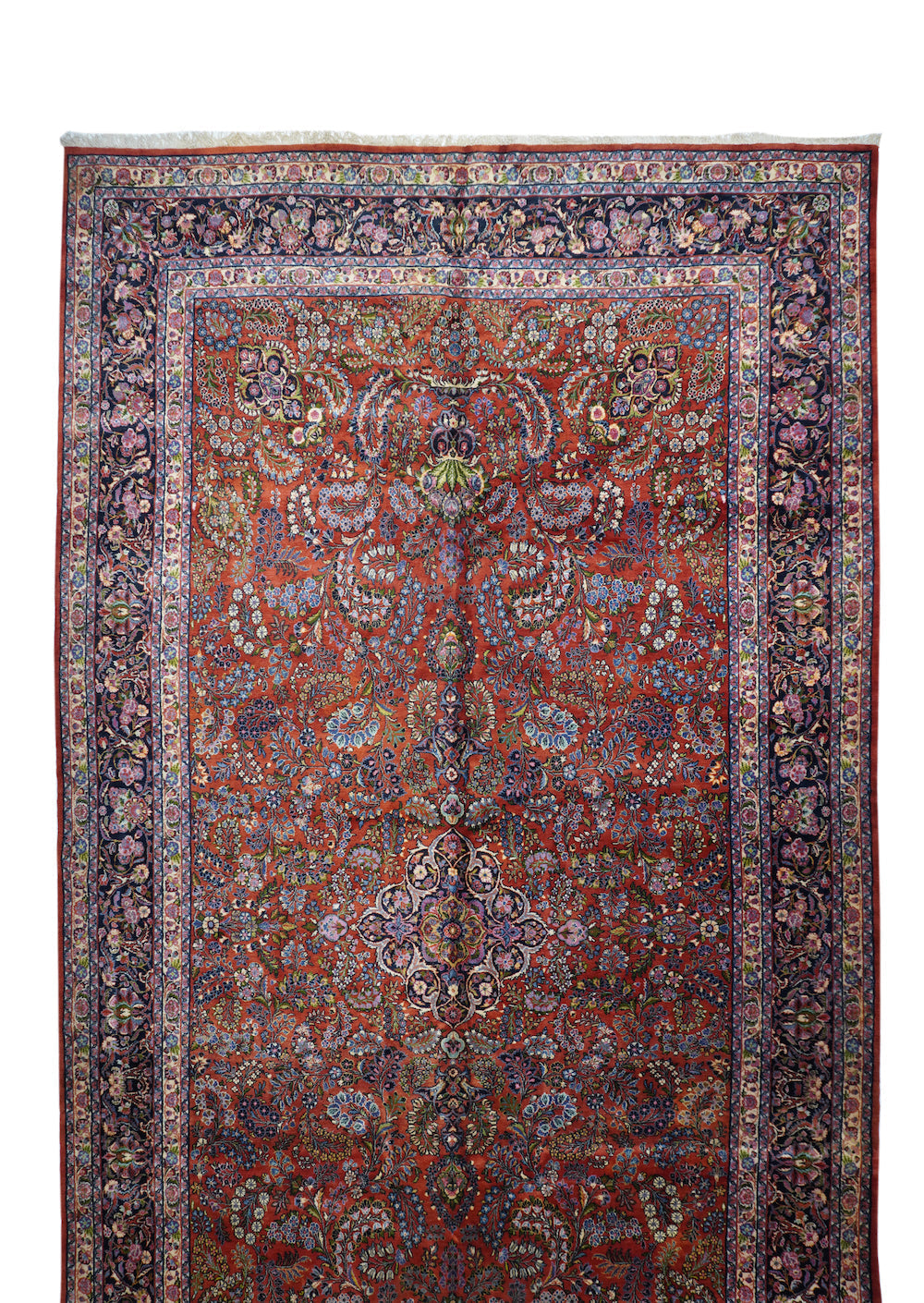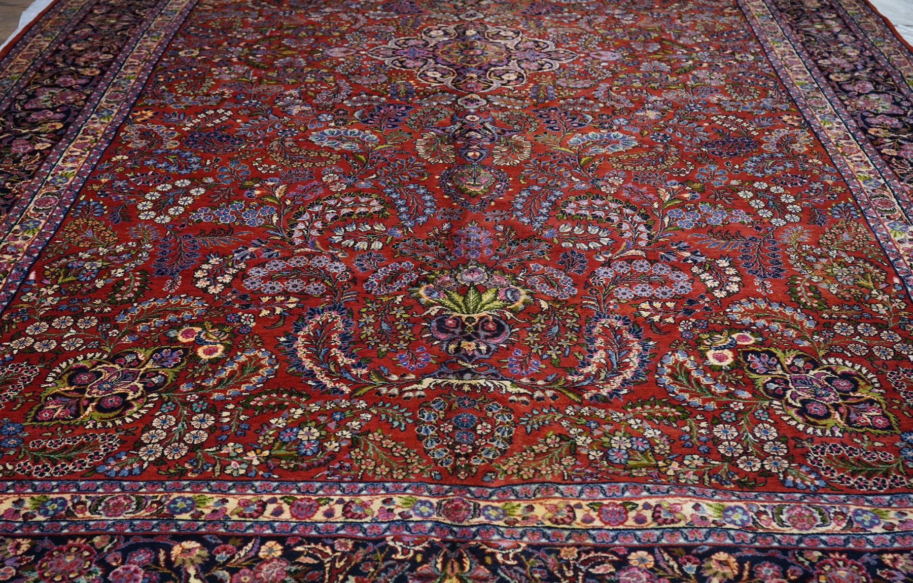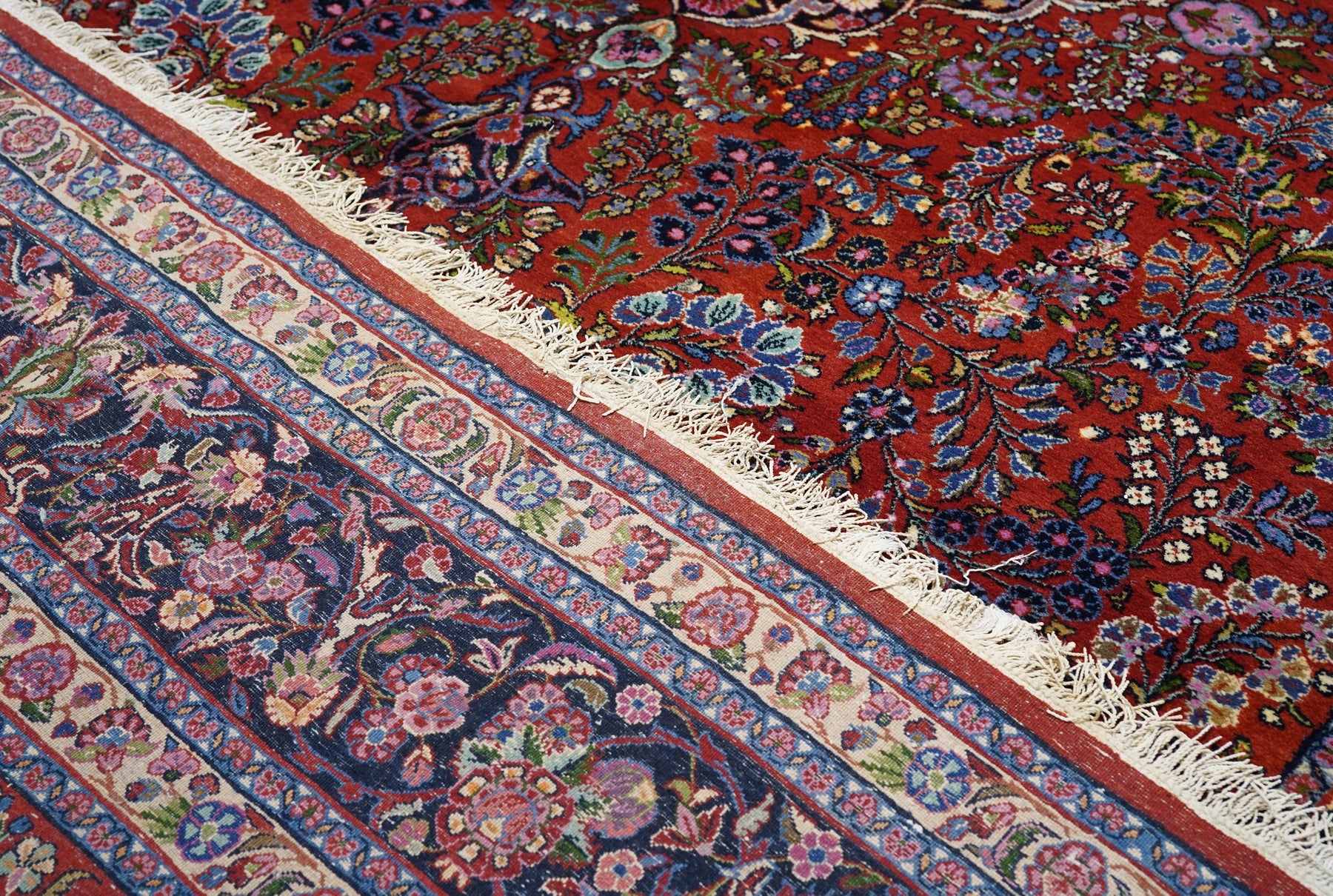 This god condition, red ground, western Persian town carpet shows an "American Sarouk" design of swimming, detached floral sprays in shades of blue, straw and cream, all set around an arabesque-defined navy four pendant medallion. Navy border with palmettes and floral sprays. Solid, heavy handle. Medium weave. This carpet is slightly longer than the standard 12' by 18' size. Rich palette. Good condition. A city Hamadan carpet.