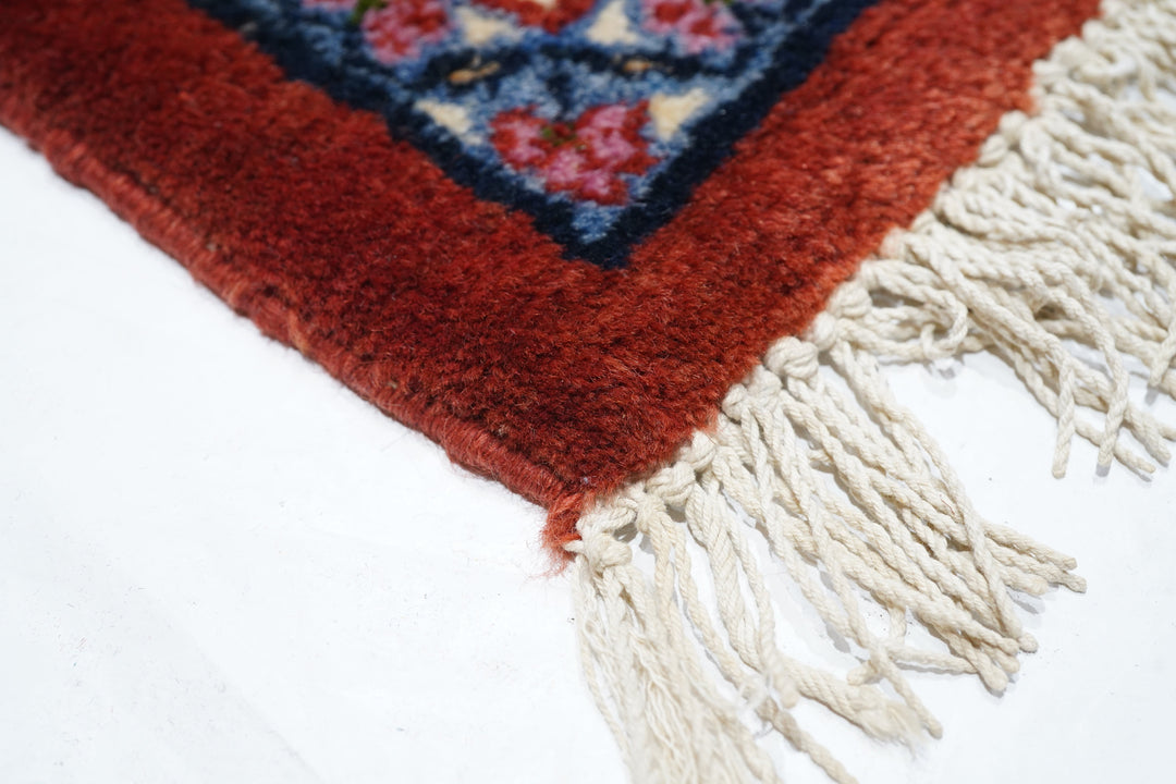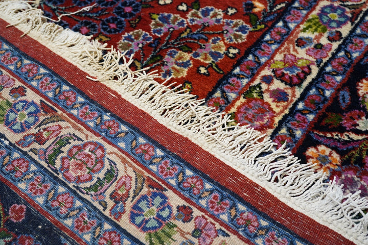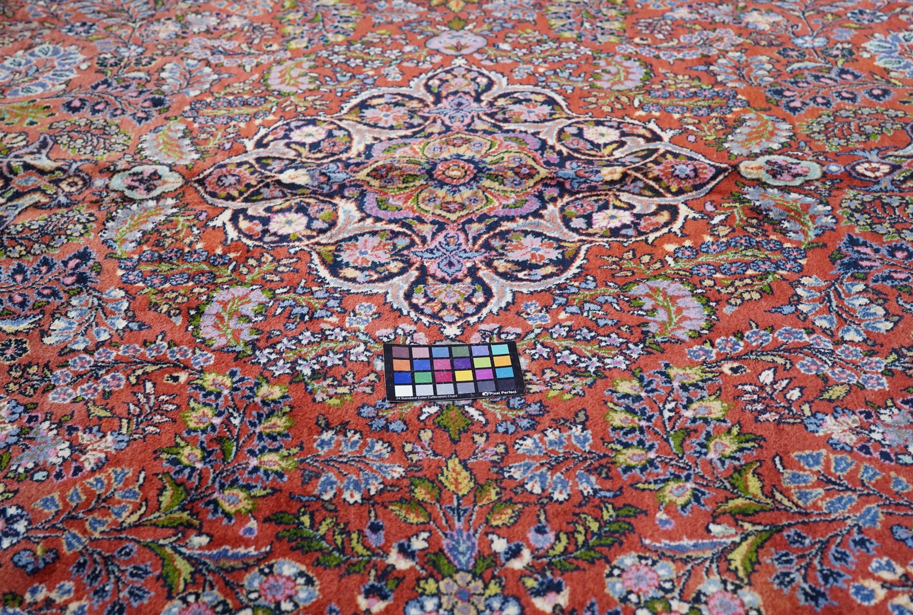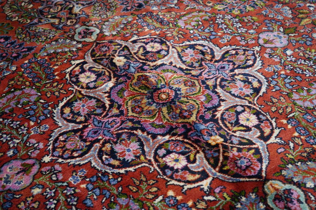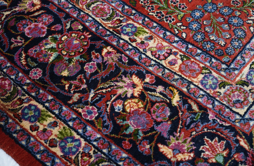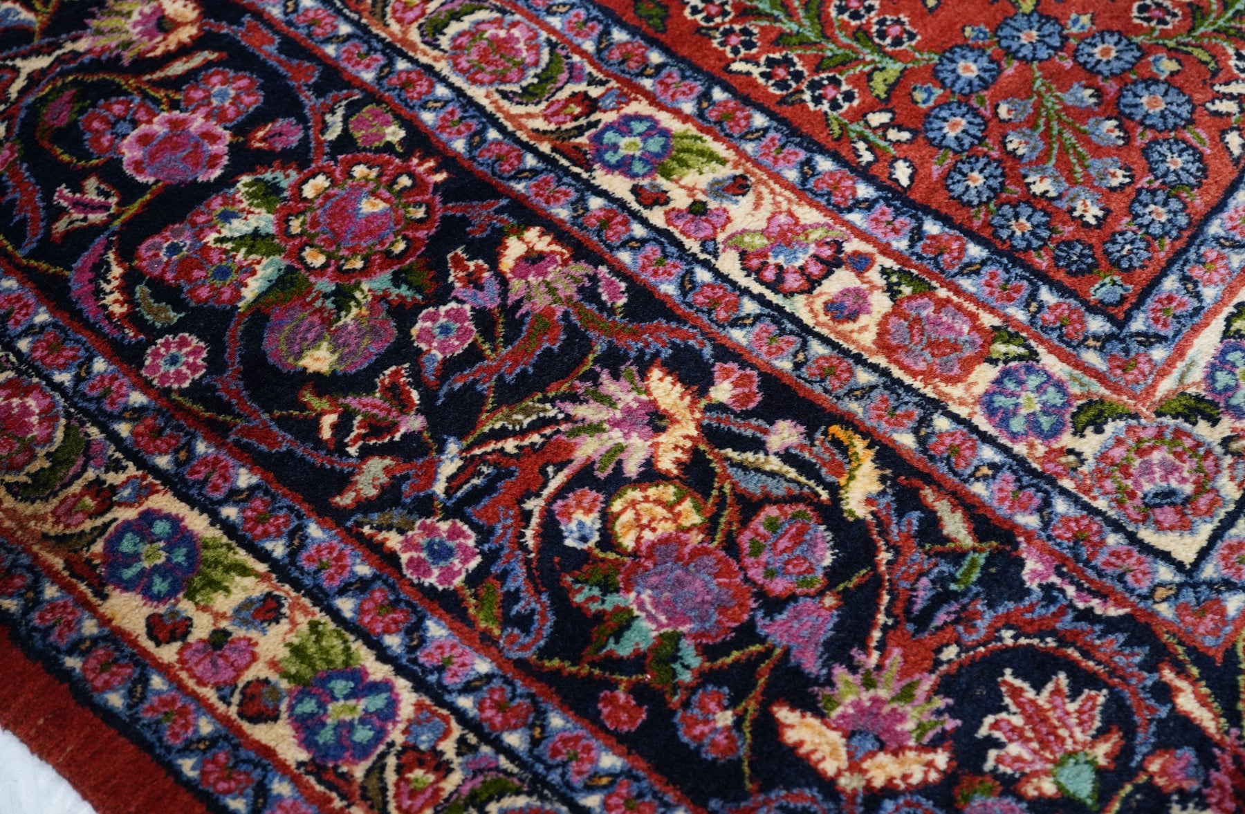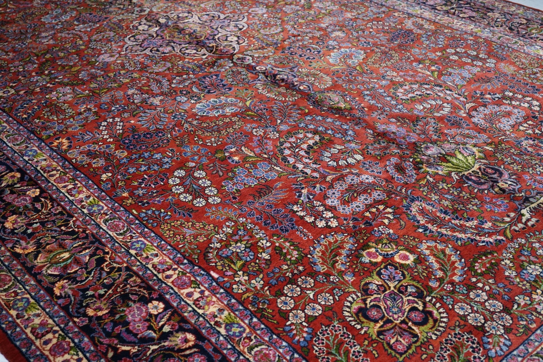 This god condition, red ground, western Persian town carpet shows an "American Sarouk" design of swimming, detached floral sprays in shades of blue, straw and cream, all set around an arabesque-defined navy four pendant medallion. Navy border with palmettes and floral sprays. Solid, heavy handle. Medium weave. This carpet is slightly longer than the standard 12' by 18' size. Rich palette. Good condition. A city Hamadan carpet.