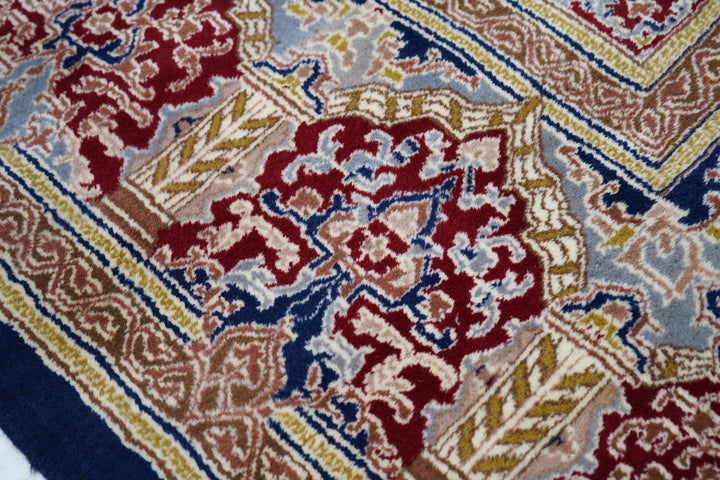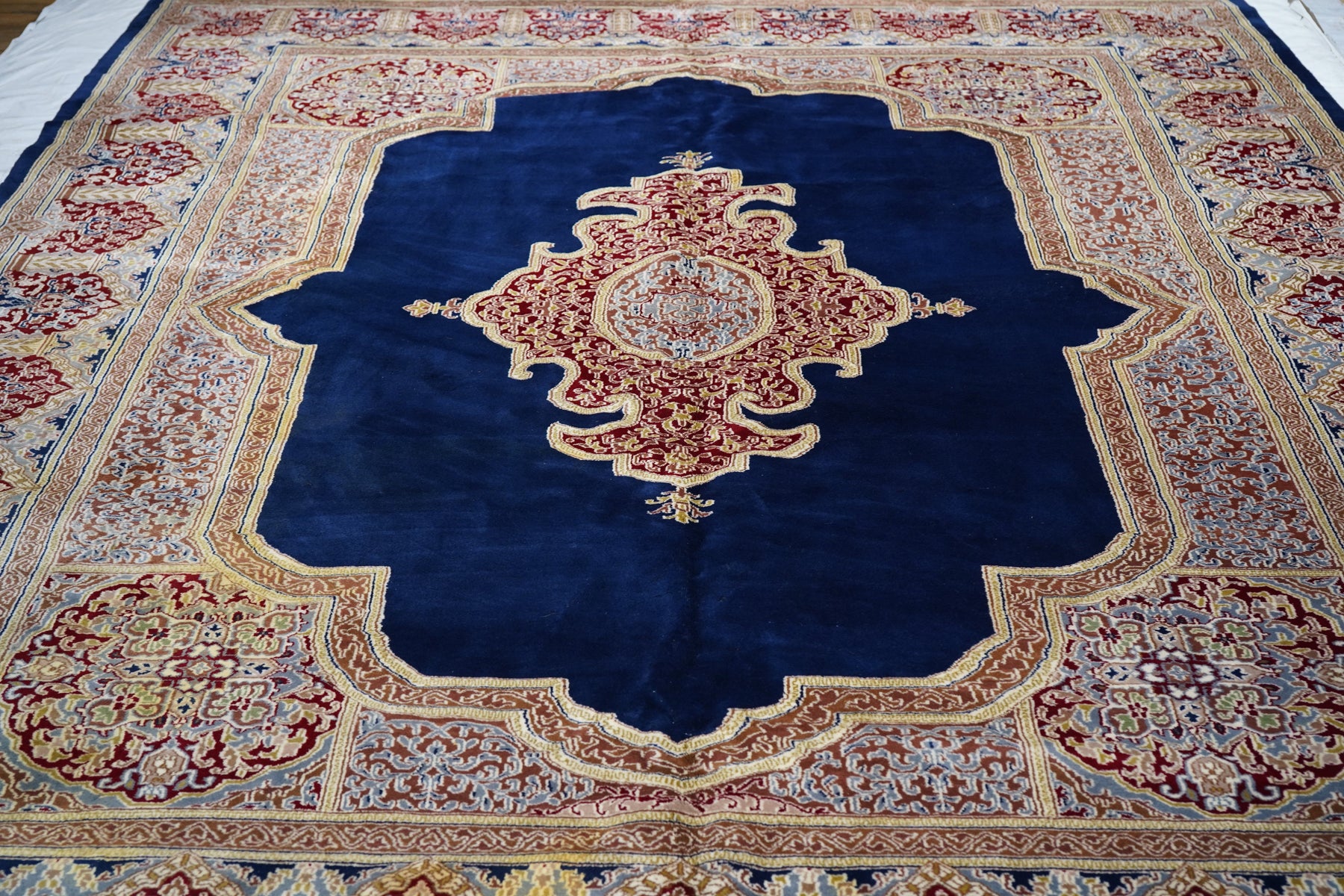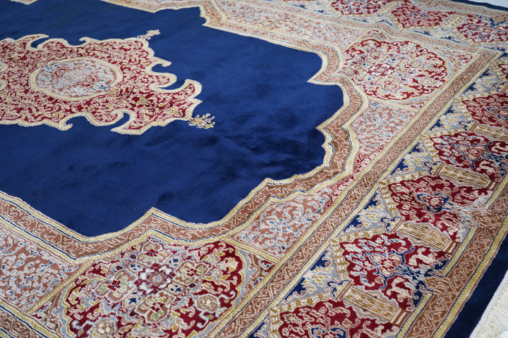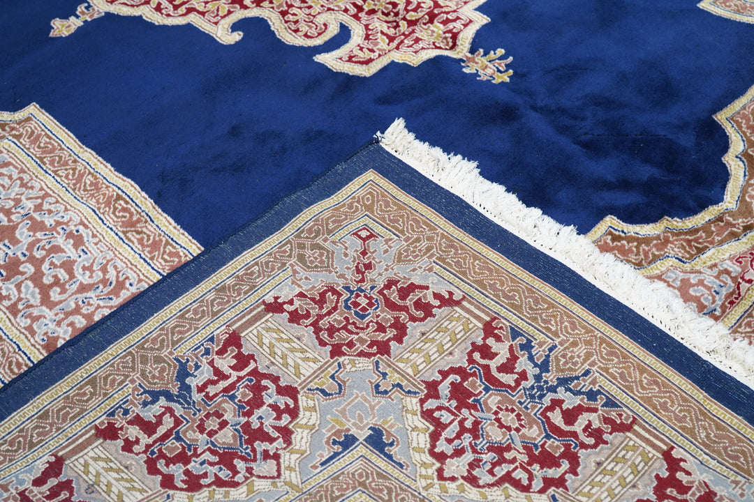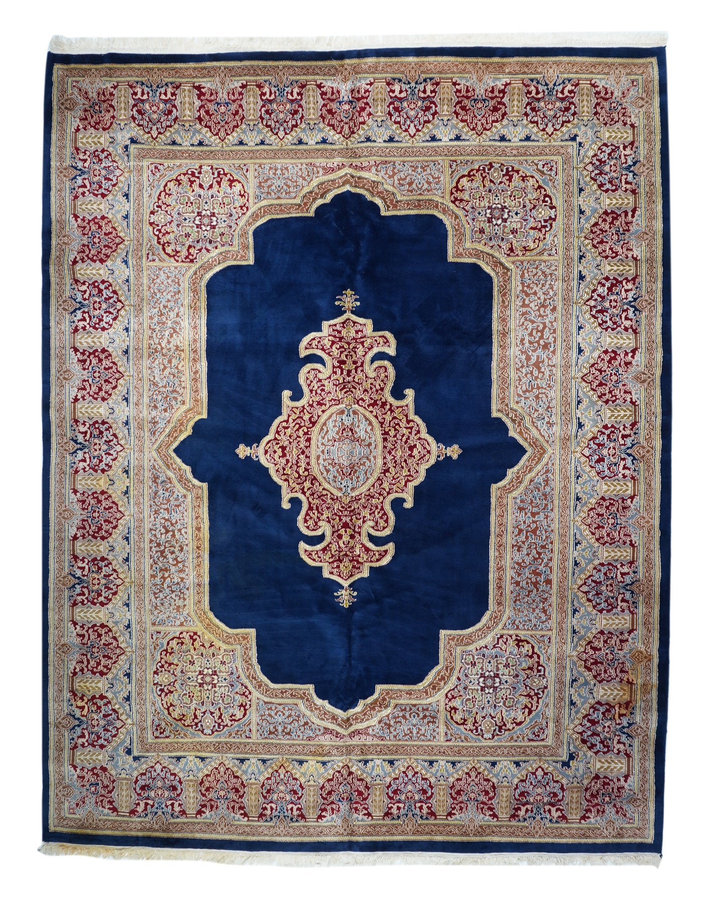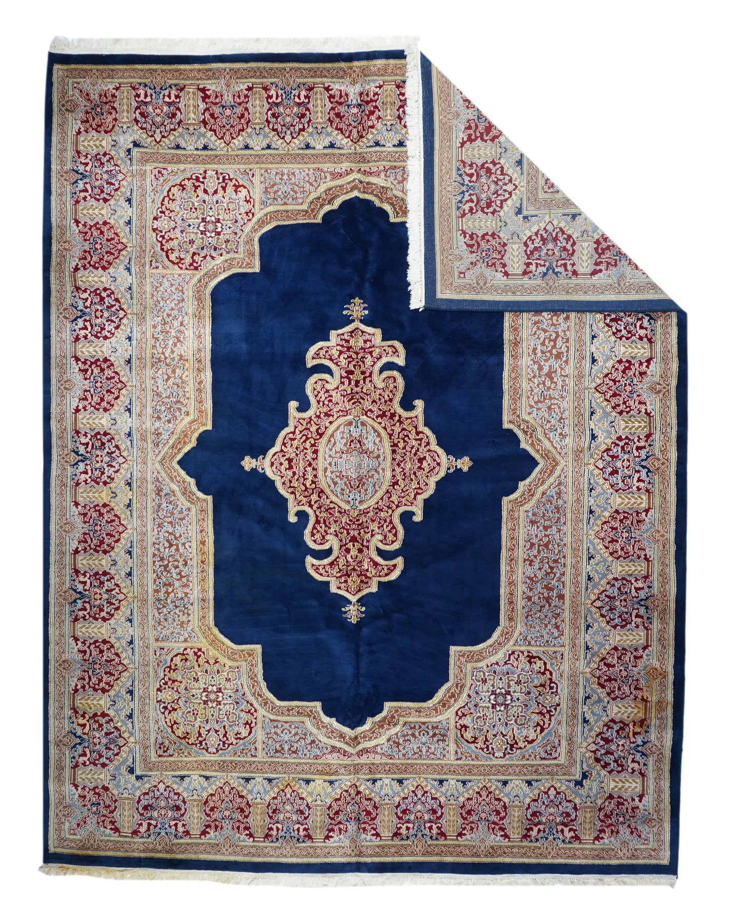 The deep royal blue open subfield of this "book-cover" layout piece shows the complex strap work outline medallion with its elliptical rust-red sub-medallion. Conforming red field forms conjoint corners. Nar black border with pointed arcade pattern. Formal, but not formal like a Kashan or Tabriz or Isfahan. Thick pile. Fine weave.