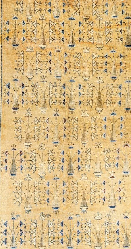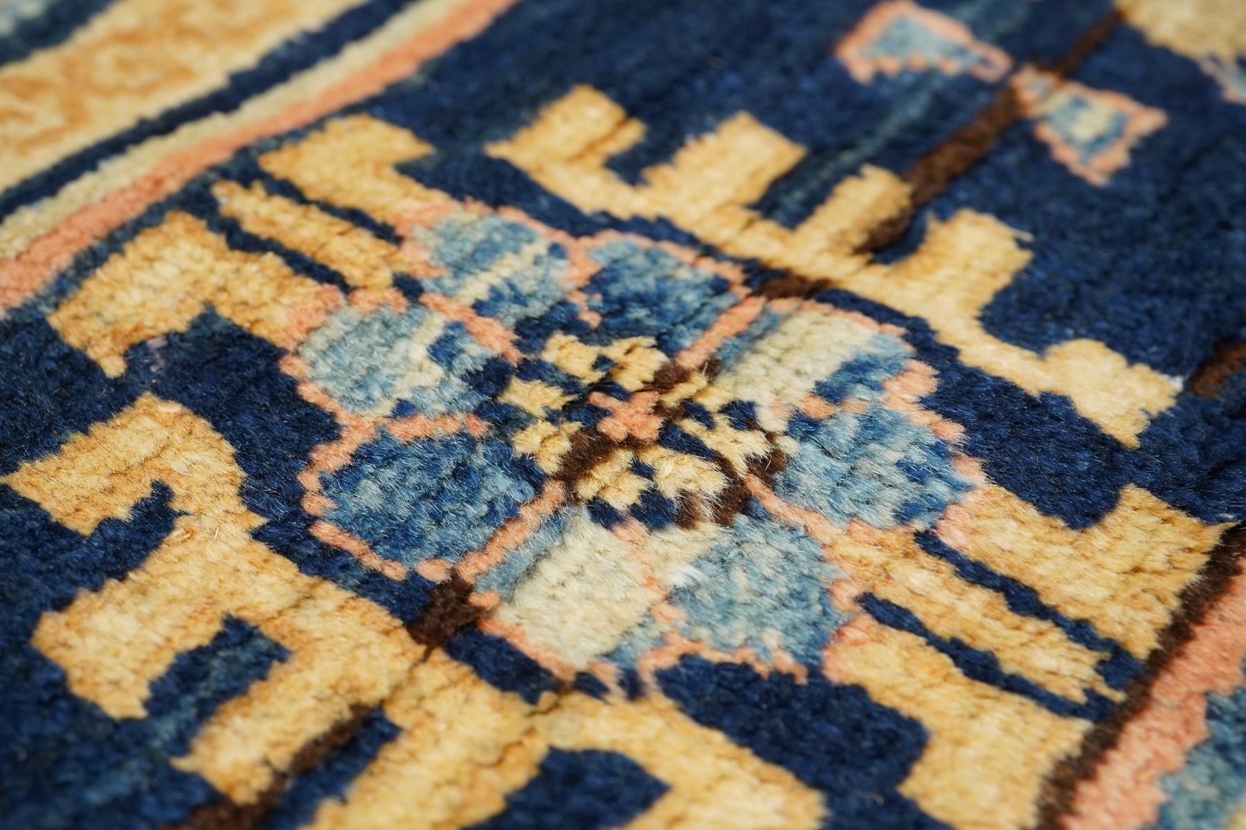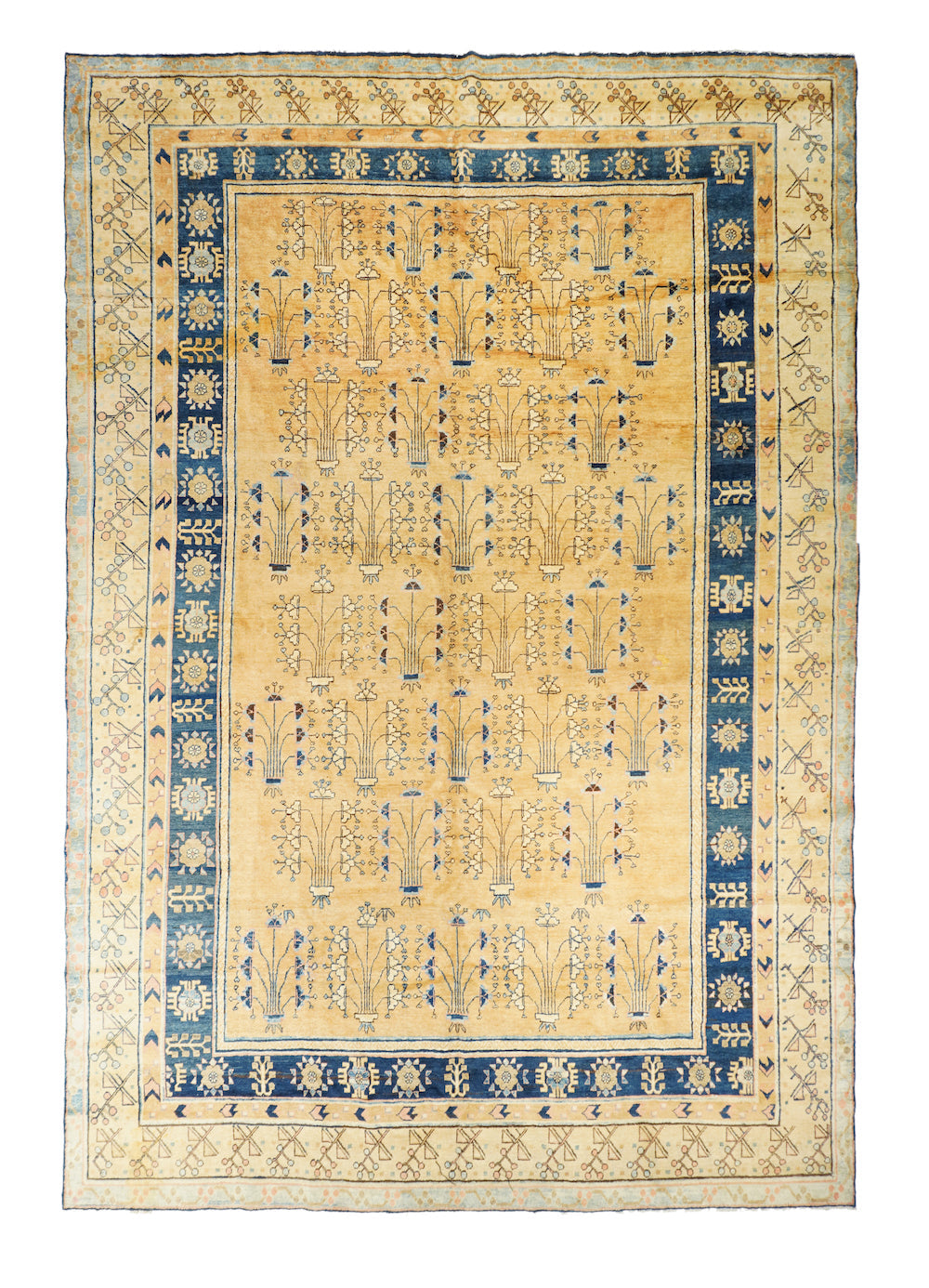 City in western China (Xinjiang Province), active since the 18th century. Moderate weave on cotton. Long rugs (k’ang formats) and more recently room sizes, in semi-geometric patterns featuring pomegranates, vases, medallions, palmettes. Somewhat subdued palettes. A few still-life pictorials. Moderate to medium prices.