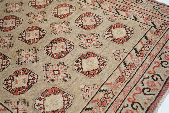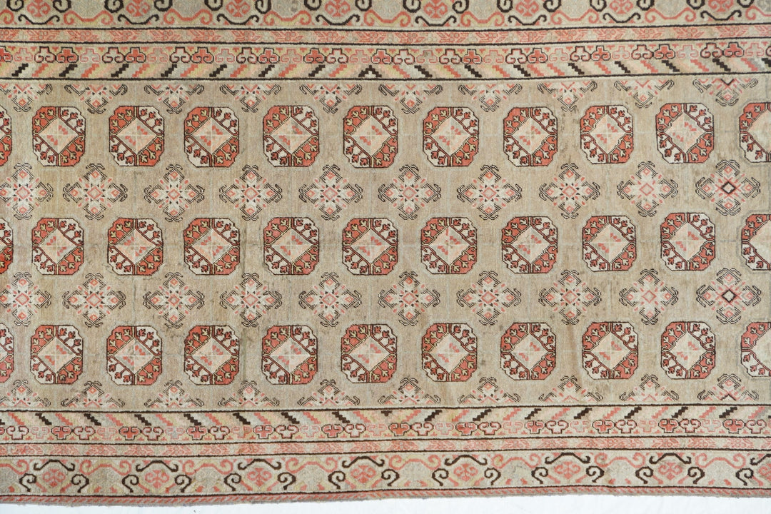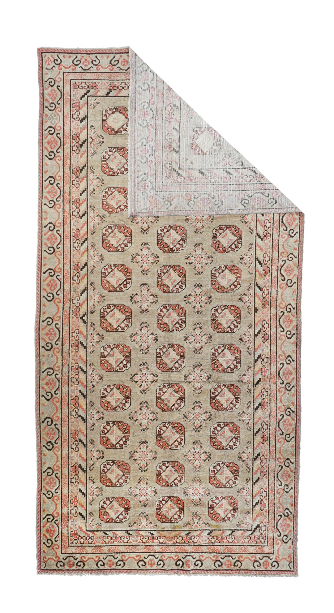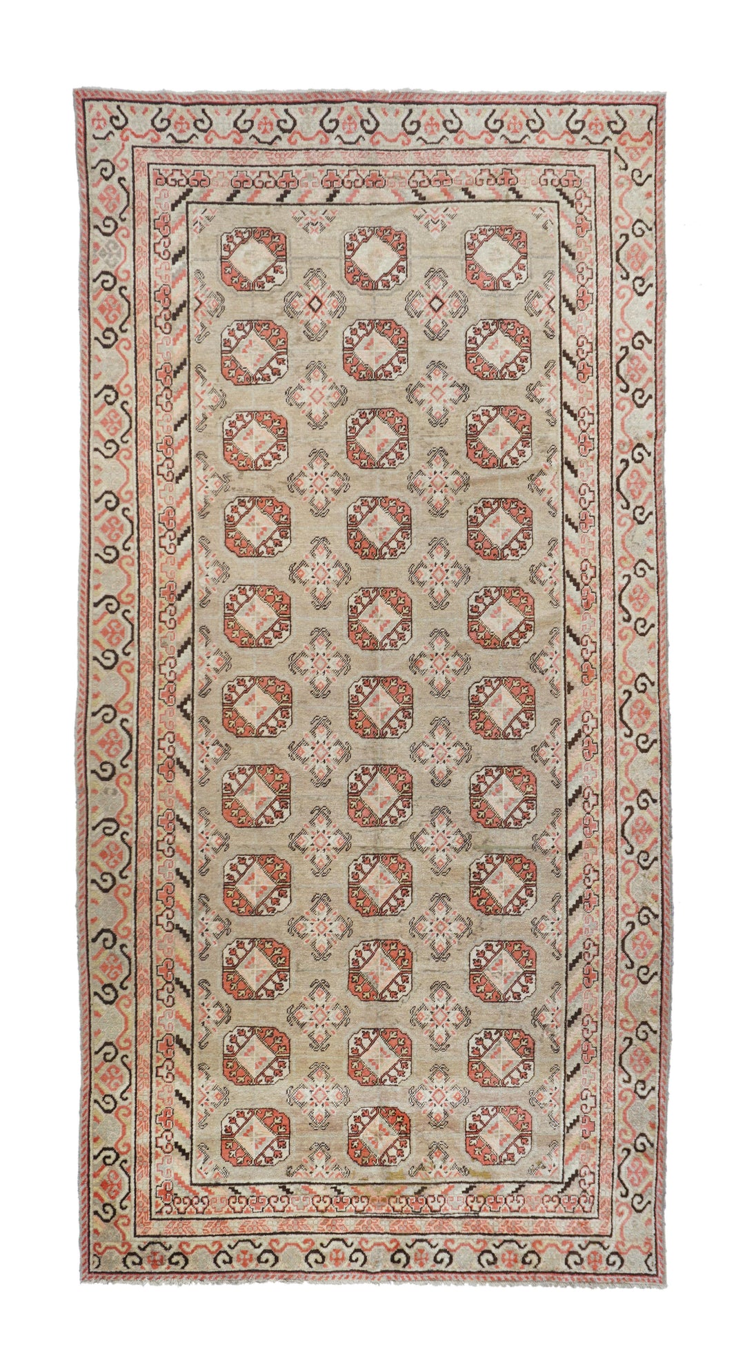 City in western China (Xinjiang Province), active since the 18th century. Moderate weave on cotton. Long rugs (k’ang formats) and more recently room sizes, in semi-geometric patterns featuring pomegranates, vases, medallions, palmettes. Somewhat subdued palettes. A few still-life pictorials. Moderate to medium prices.