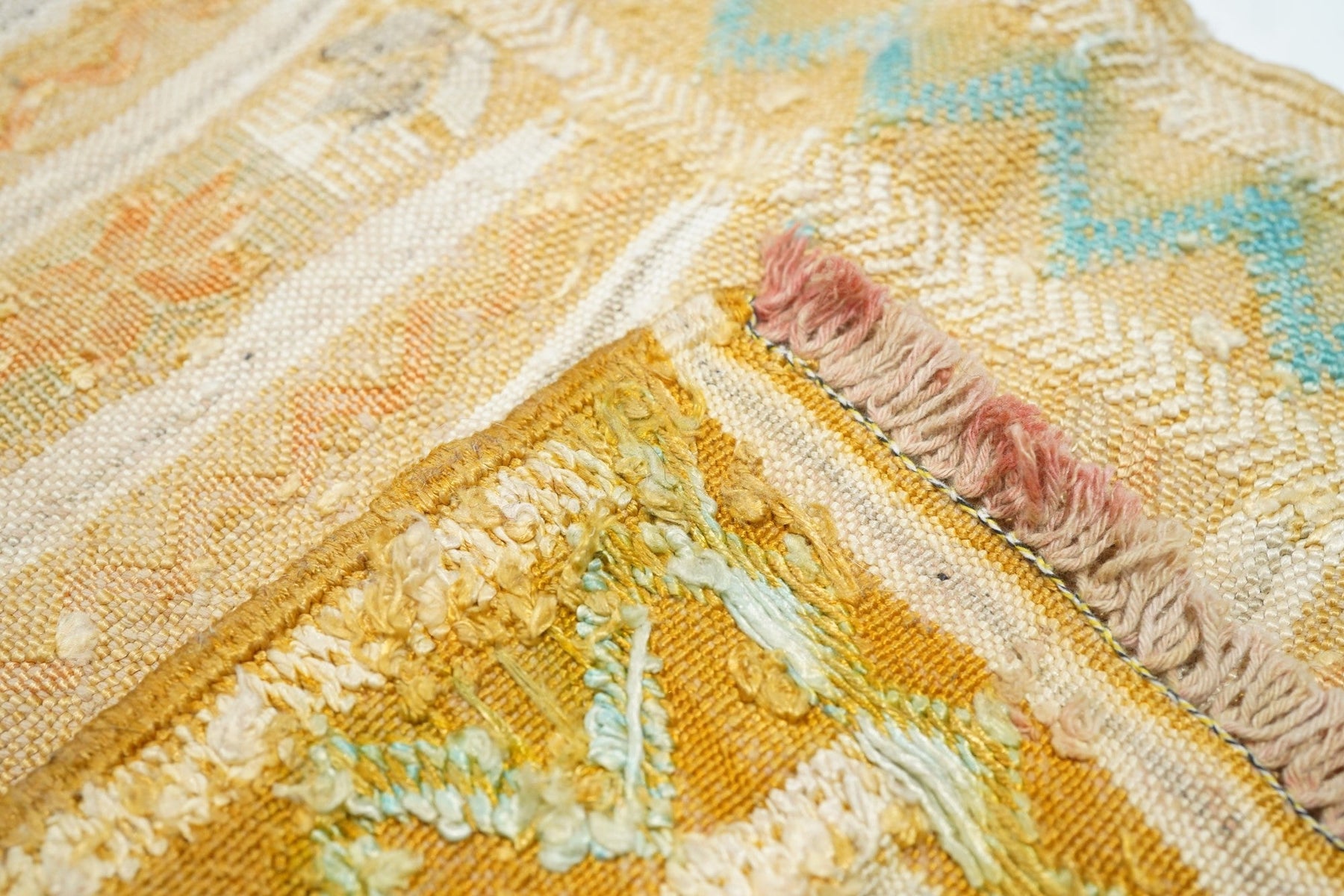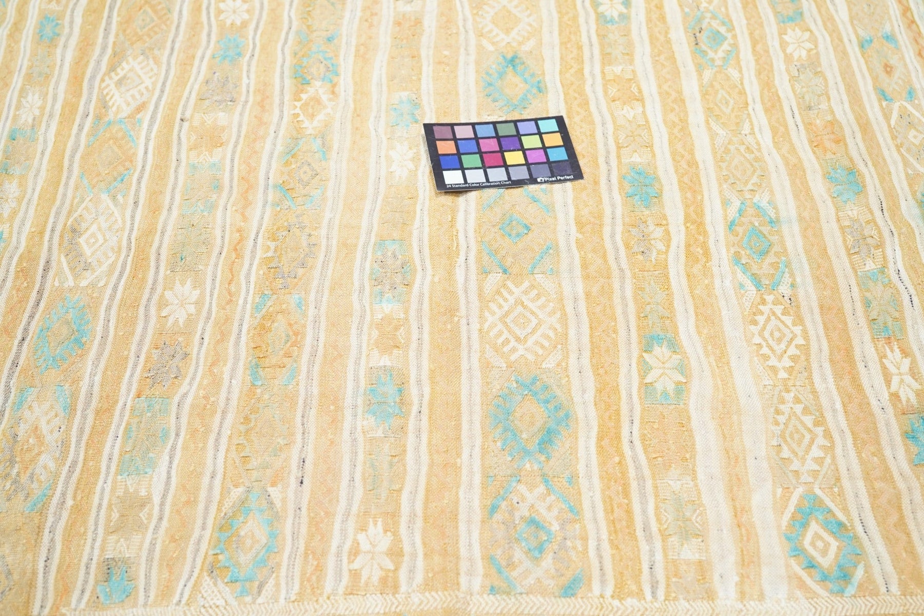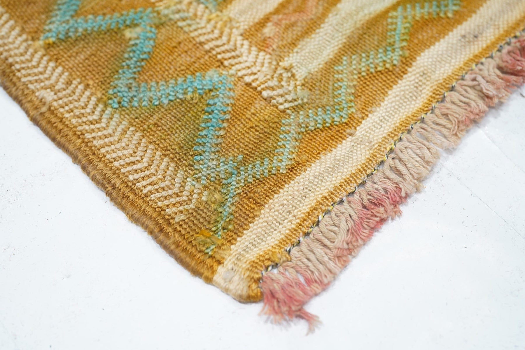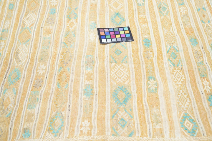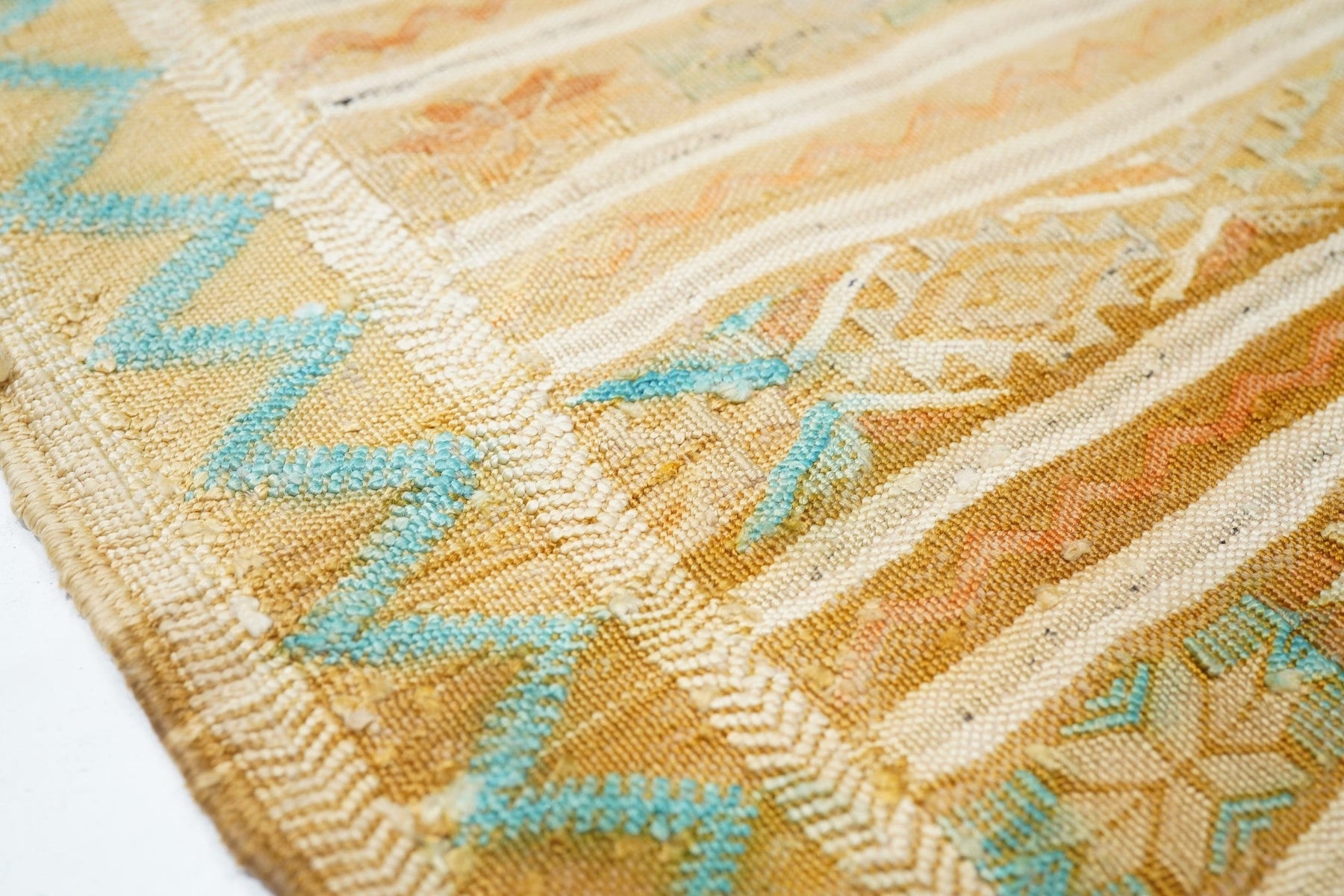 This rustic textile shows irregular horizontal abrashed rust, cream and light blue bands, enriched by extra-weft herringbone patterning in cream and light blue. Cotton warp, wool wefts. As new condition.