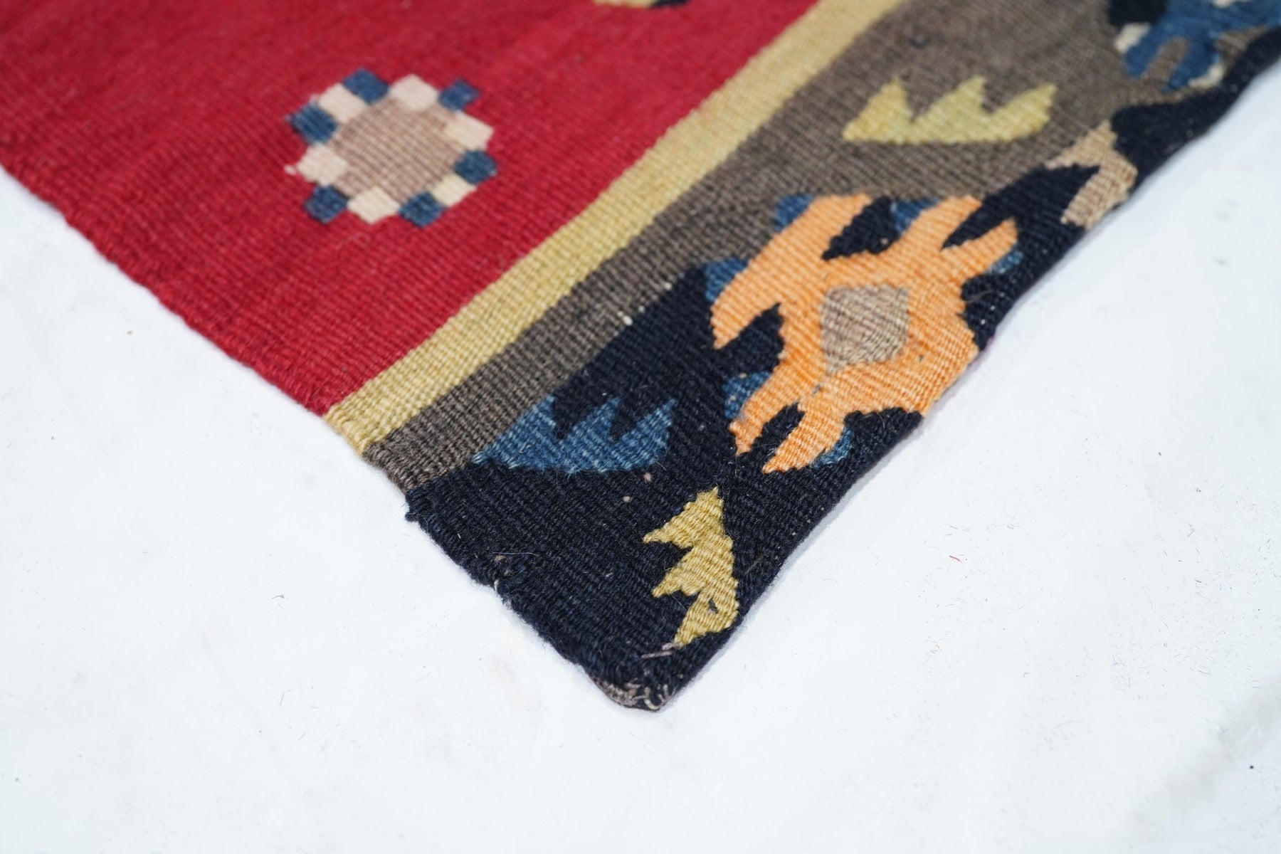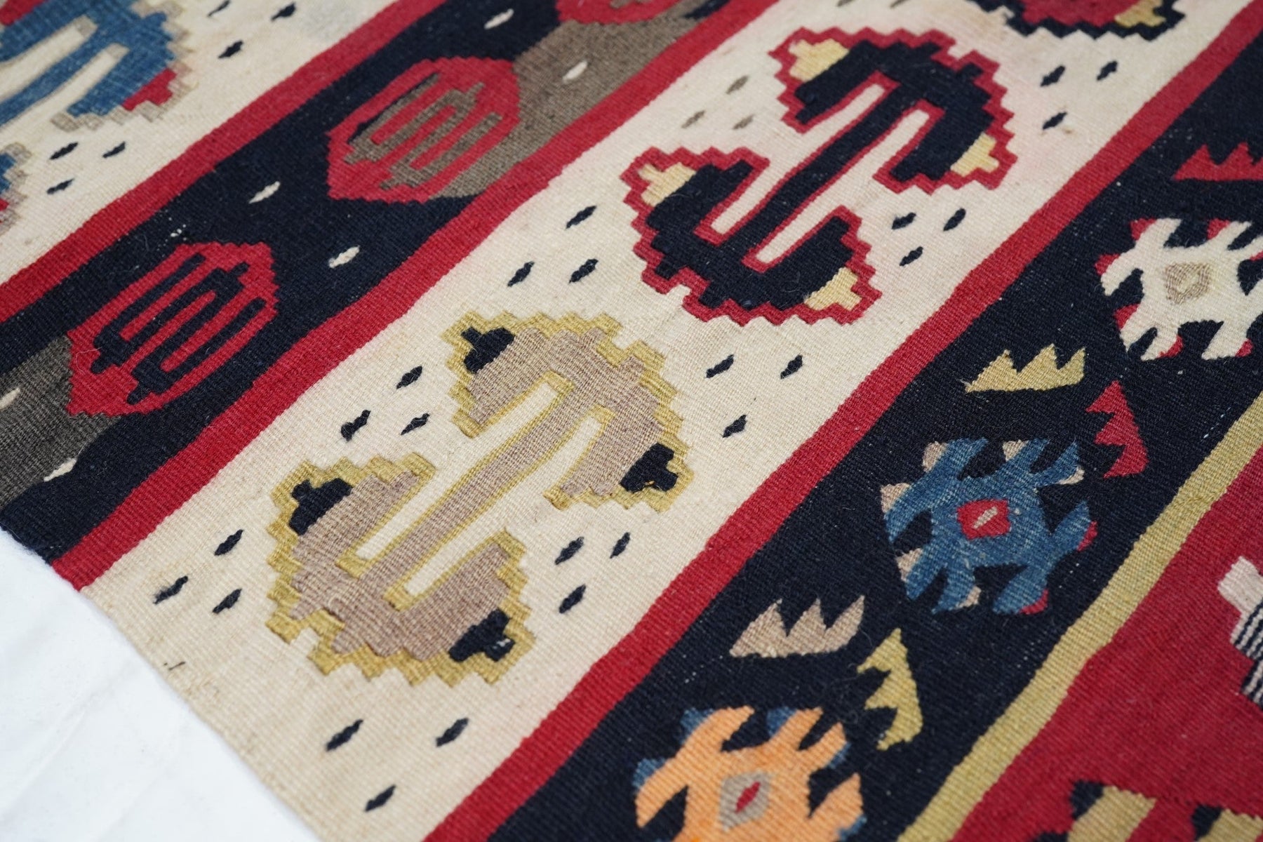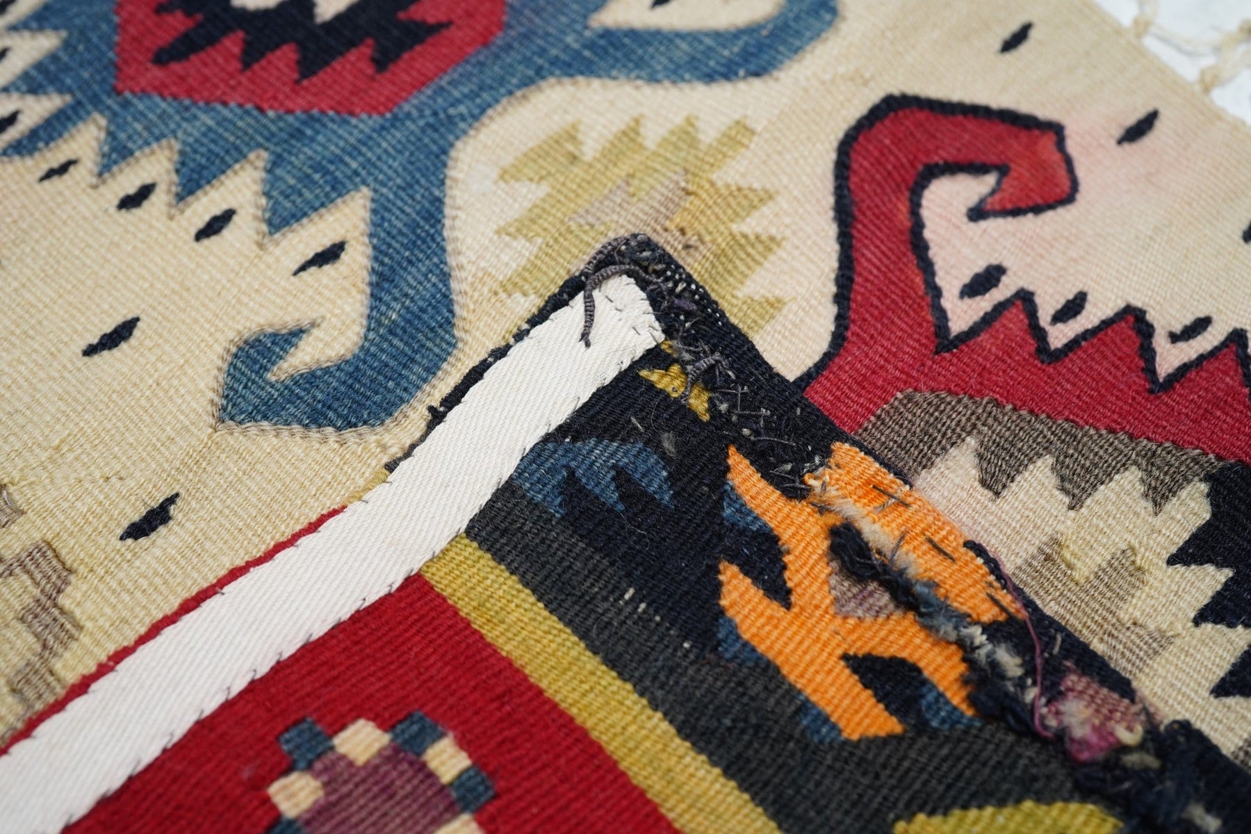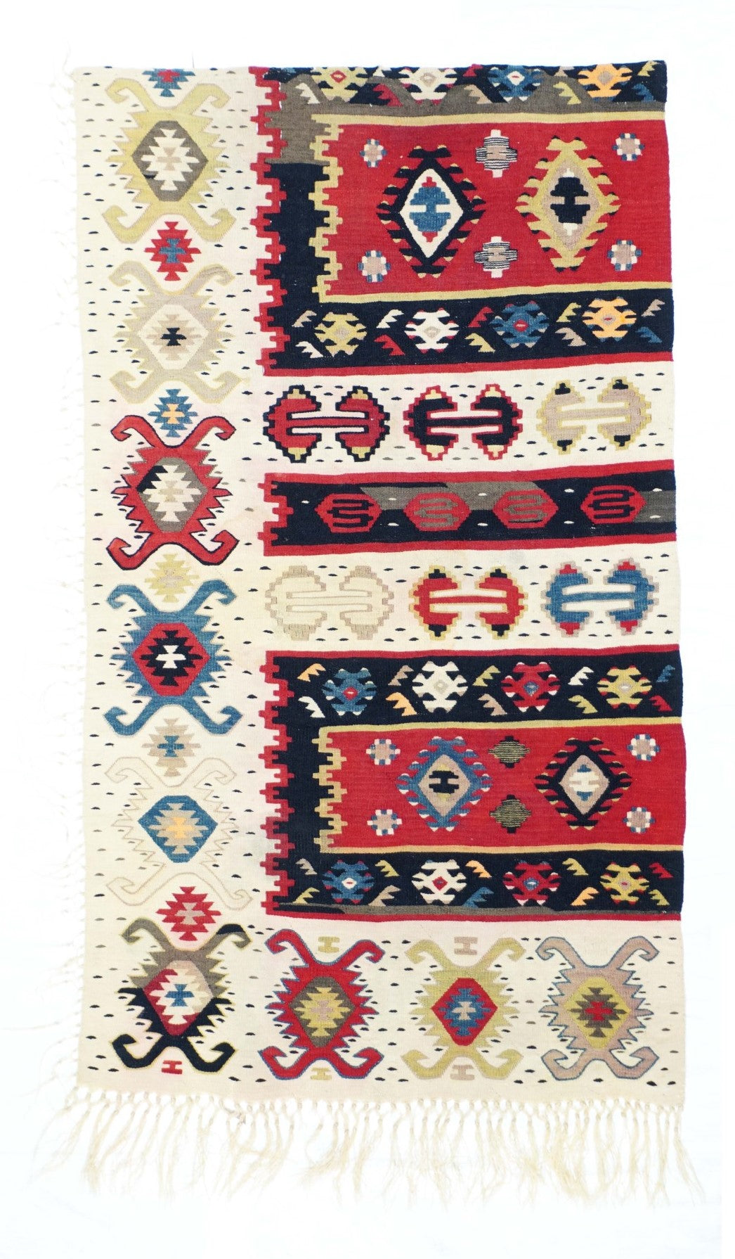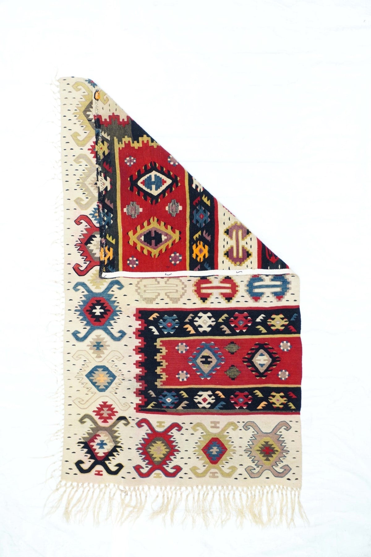 Similar to our 1928 and 1944, this attractive fragment shows two partial red panels with ashiks, within black borders, and set on an overall cream ground with a double hook ashik border. Would make a great cushion. Red, green, black, apricot, straw palette. Wool wefts, slit tapestry weave. Good condition.