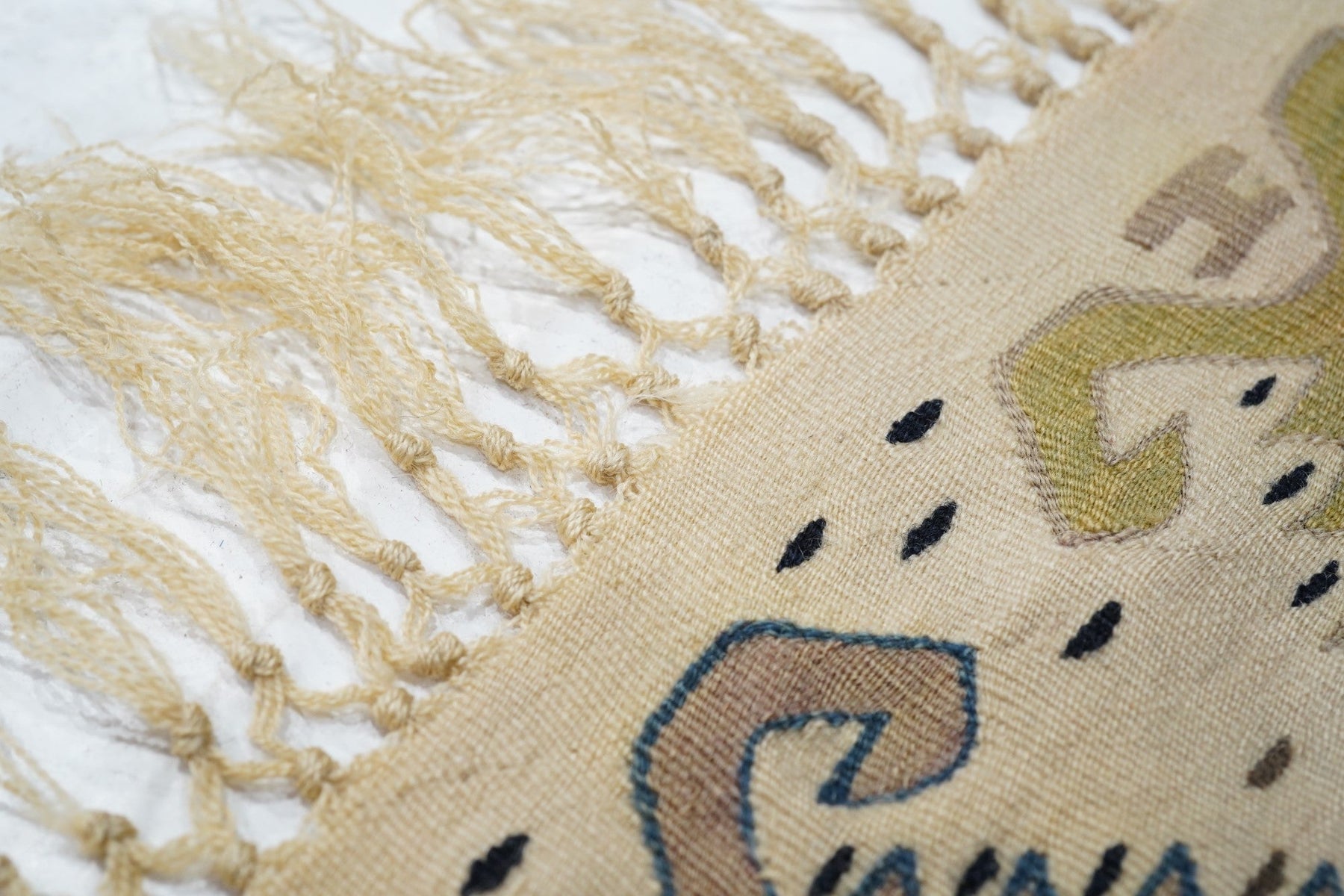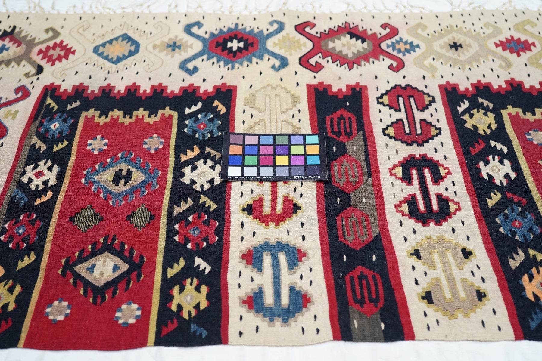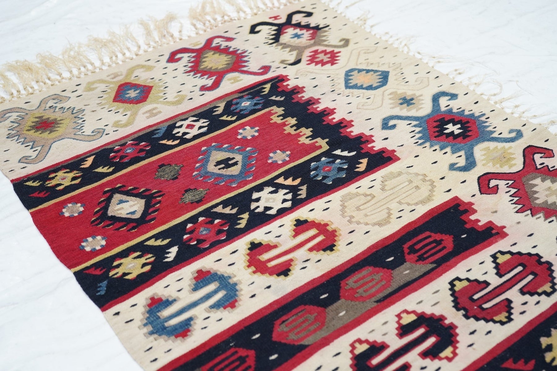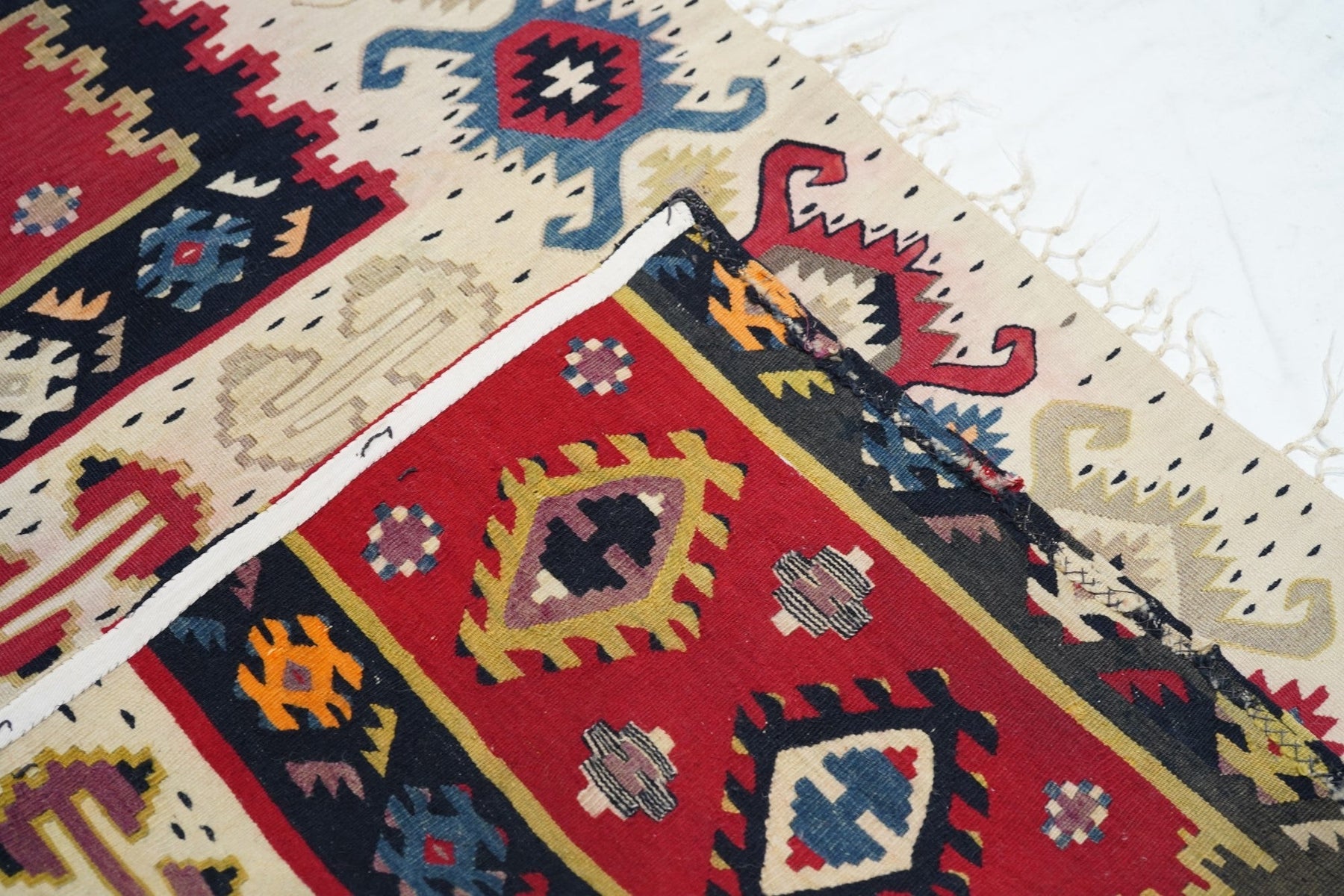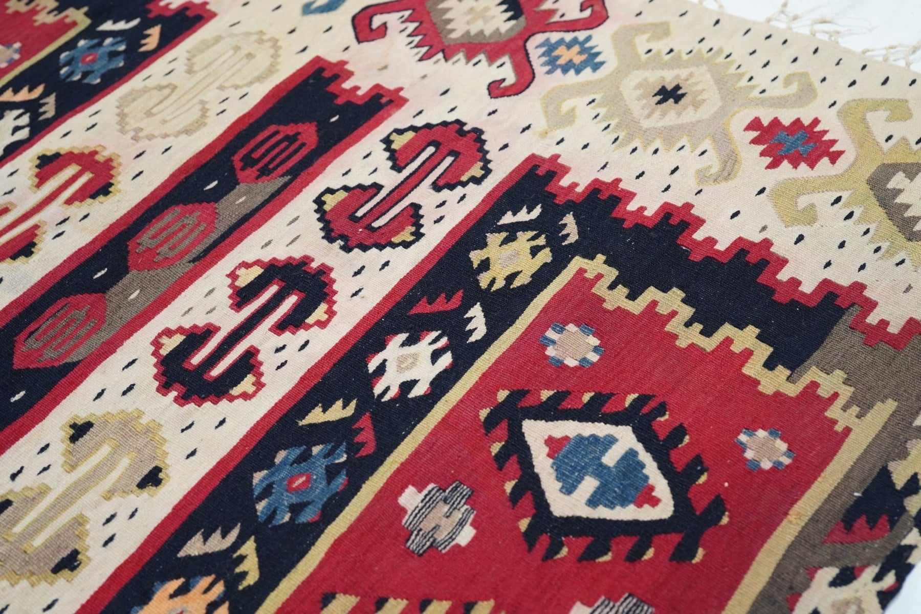 Similar to our 1928 and 1944, this attractive fragment shows two partial red panels with ashiks, within black borders, and set on an overall cream ground with a double hook ashik border. Would make a great cushion. Red, green, black, apricot, straw palette. Wool wefts, slit tapestry weave. Good condition.