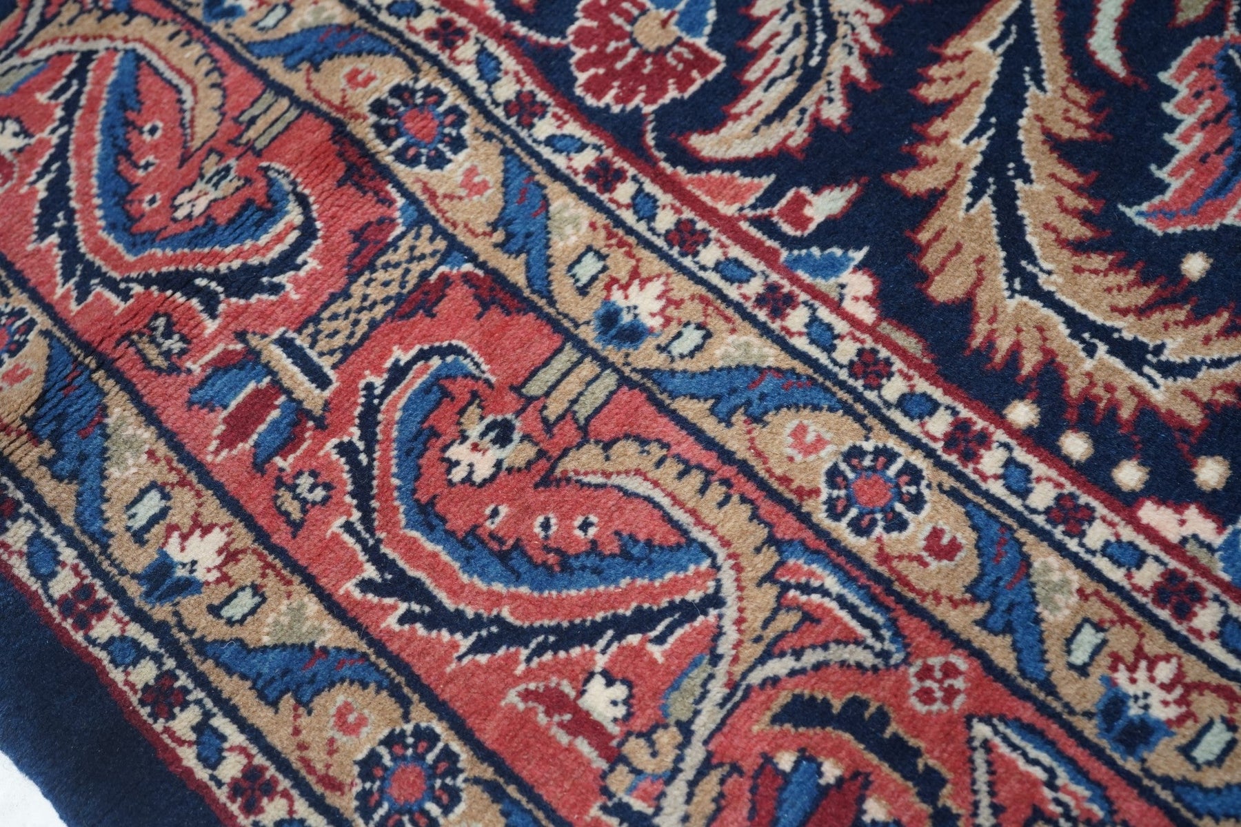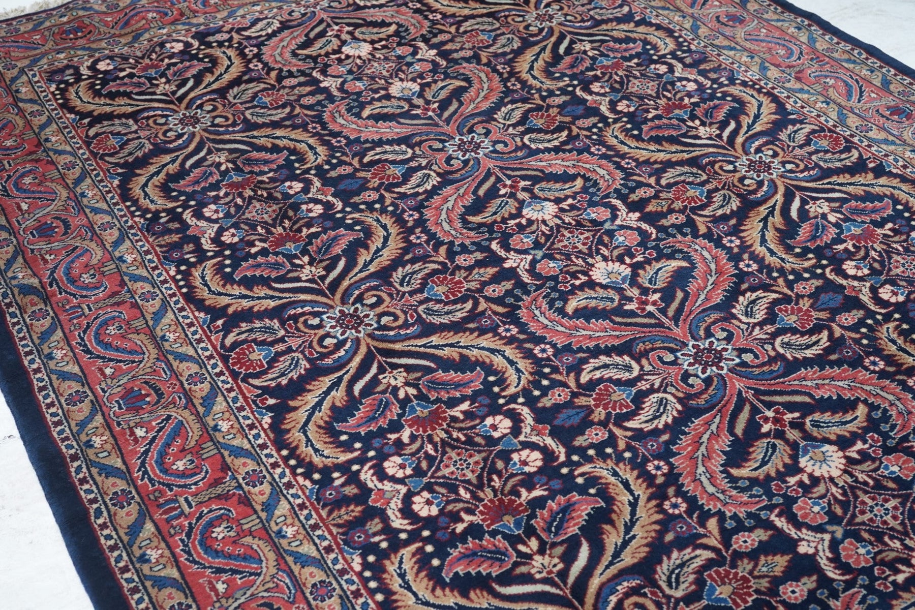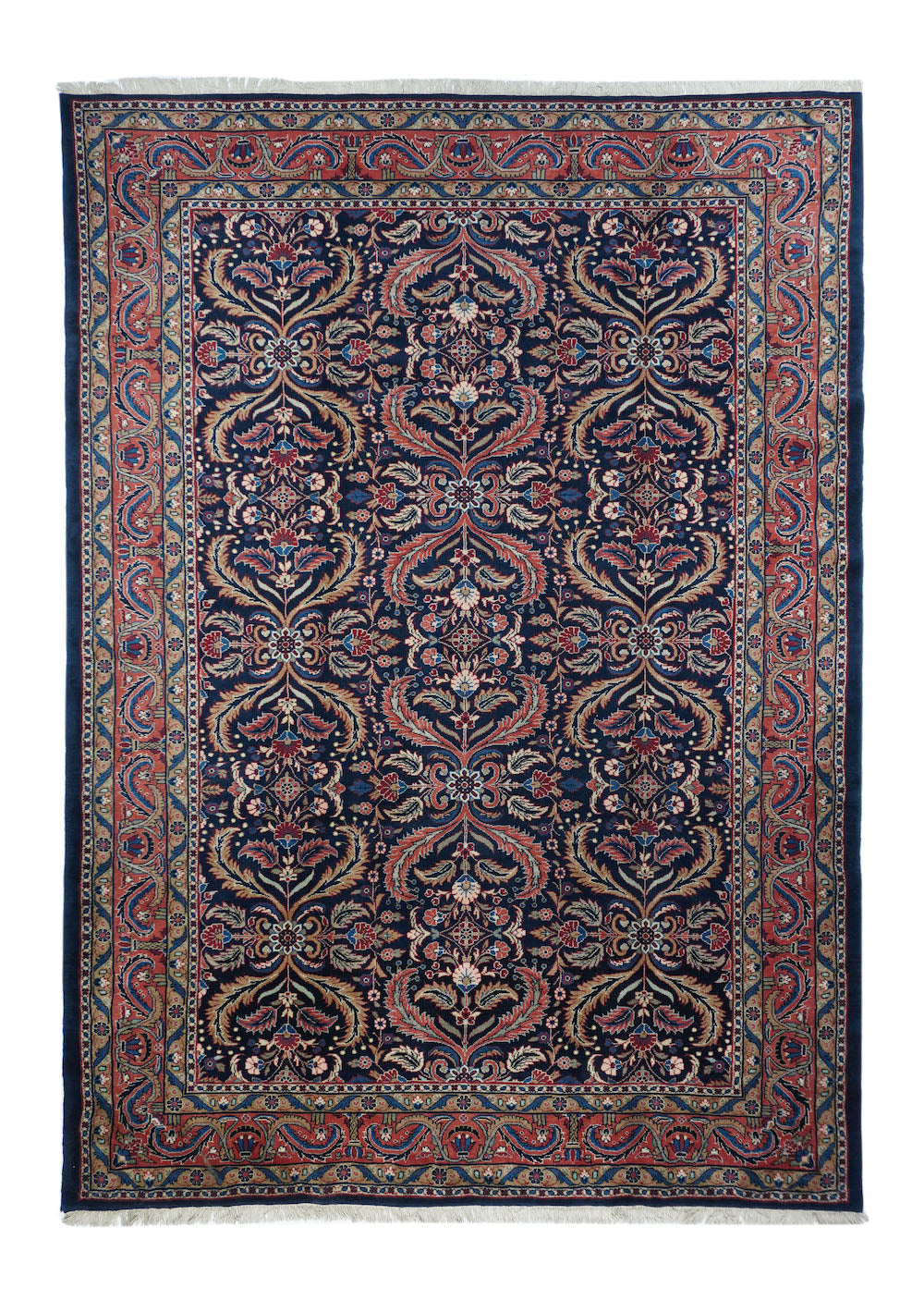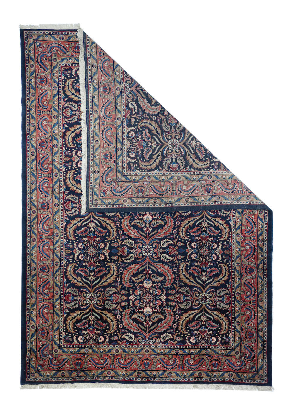 This visually striking, and probably unique design wise, SE Persian city carpet of medium-fine weave, shows a navy indigo field precisely, but not stiffly, covered by a three column allover pattern of pairs of curved, barbed leaves, with lesser leaves and rosettes in the defined reserves. Rose border of two types of barbed and curved leaves crisscrossing to form a double meander. Wide palette including straw, sand, pistachio, greens and blues. Cotton foundation. Good condition.