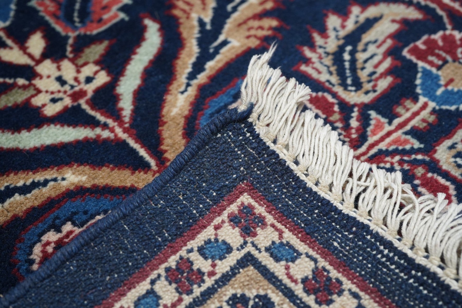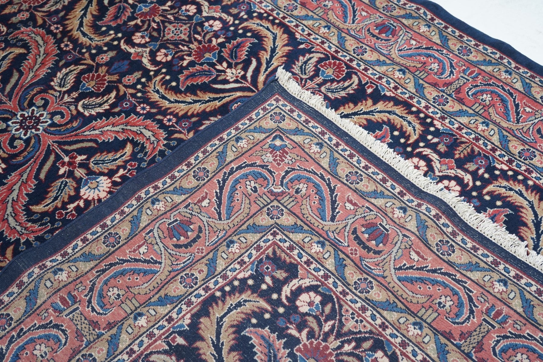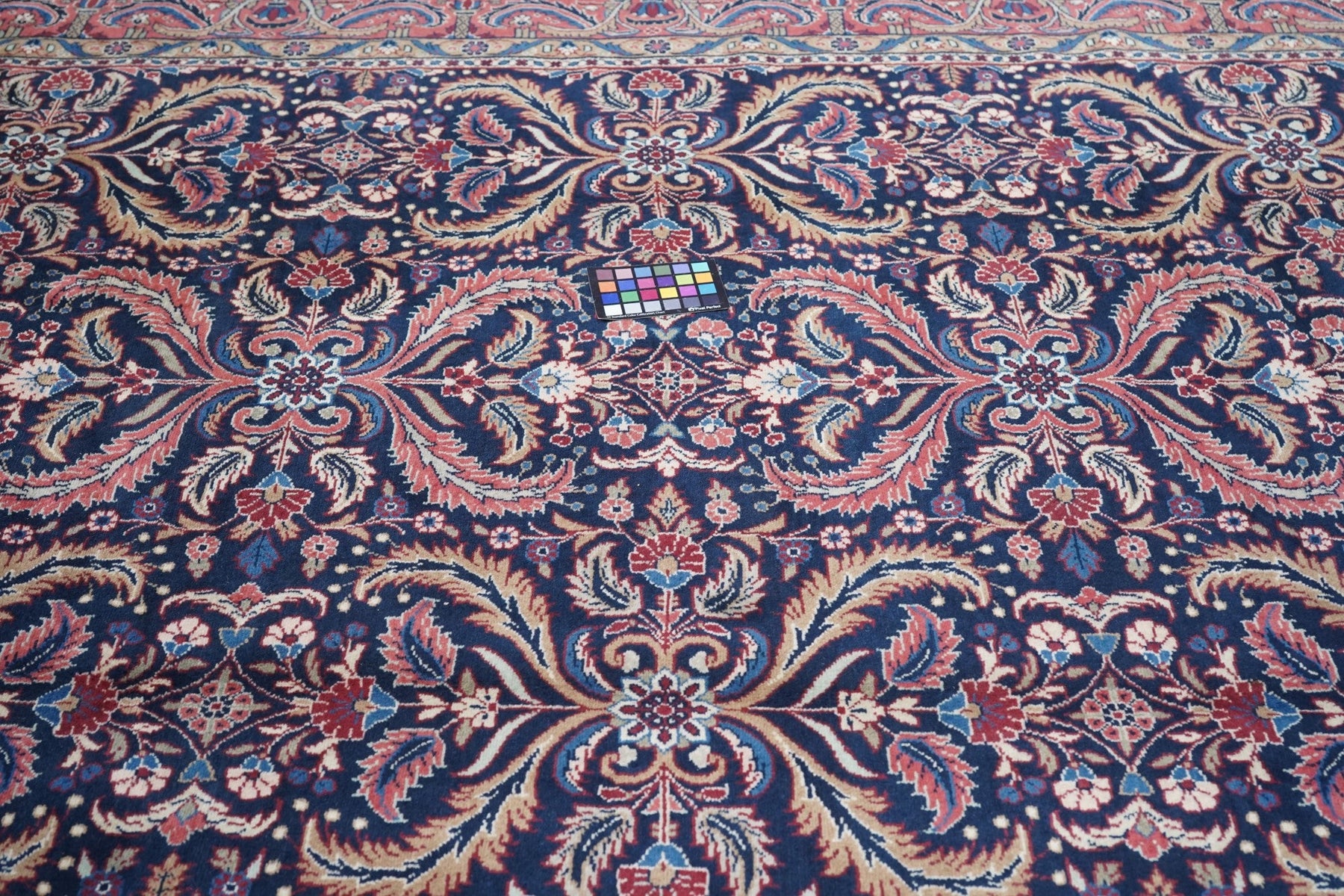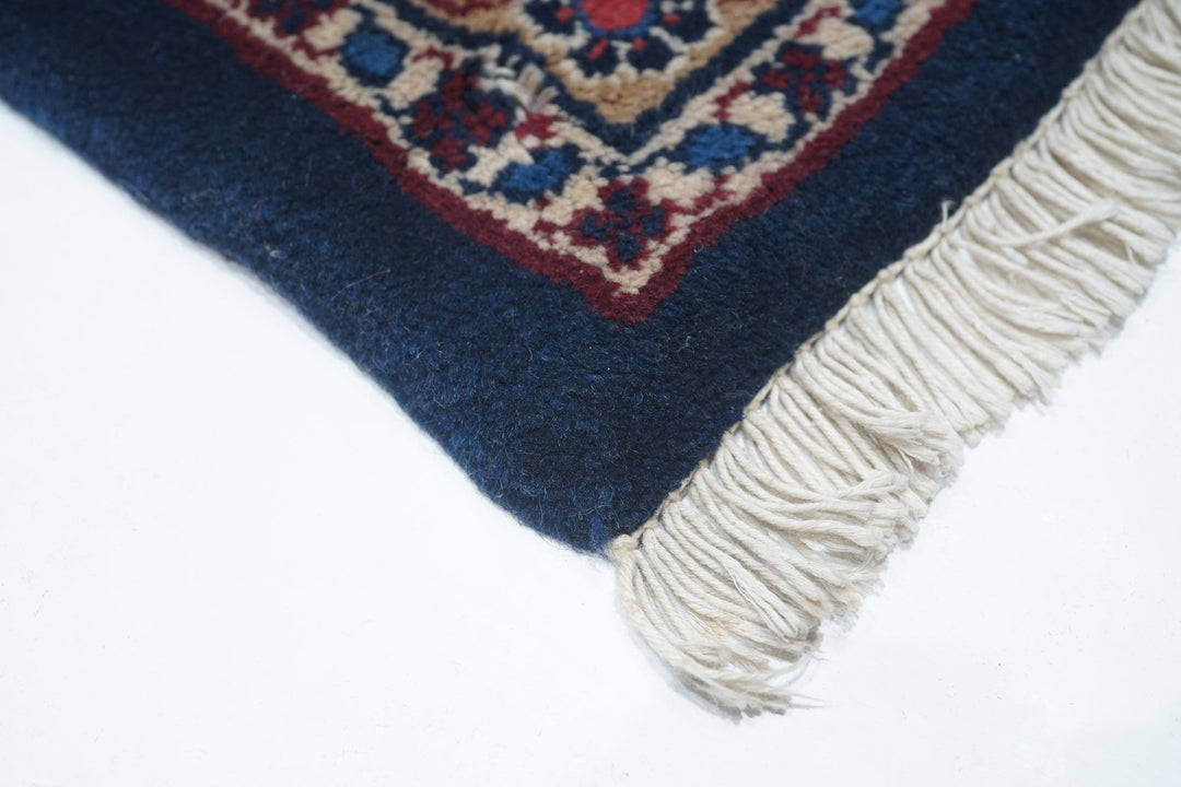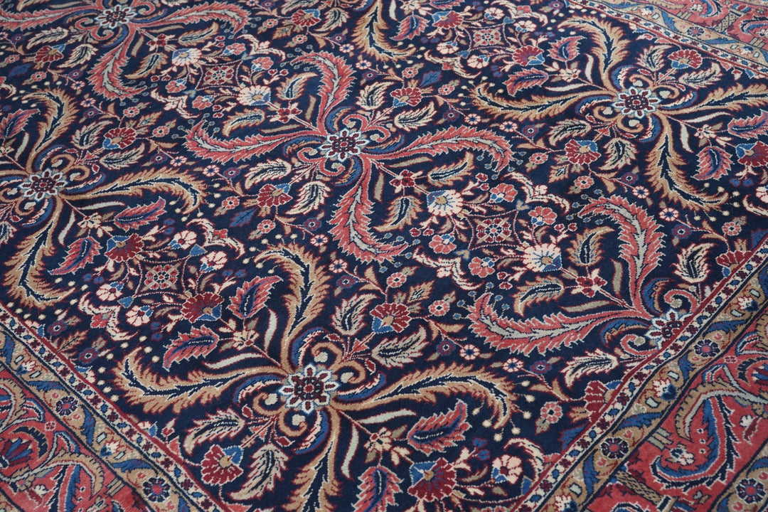 This visually striking, and probably unique design wise, SE Persian city carpet of medium-fine weave, shows a navy indigo field precisely, but not stiffly, covered by a three column allover pattern of pairs of curved, barbed leaves, with lesser leaves and rosettes in the defined reserves. Rose border of two types of barbed and curved leaves crisscrossing to form a double meander. Wide palette including straw, sand, pistachio, greens and blues. Cotton foundation. Good condition.