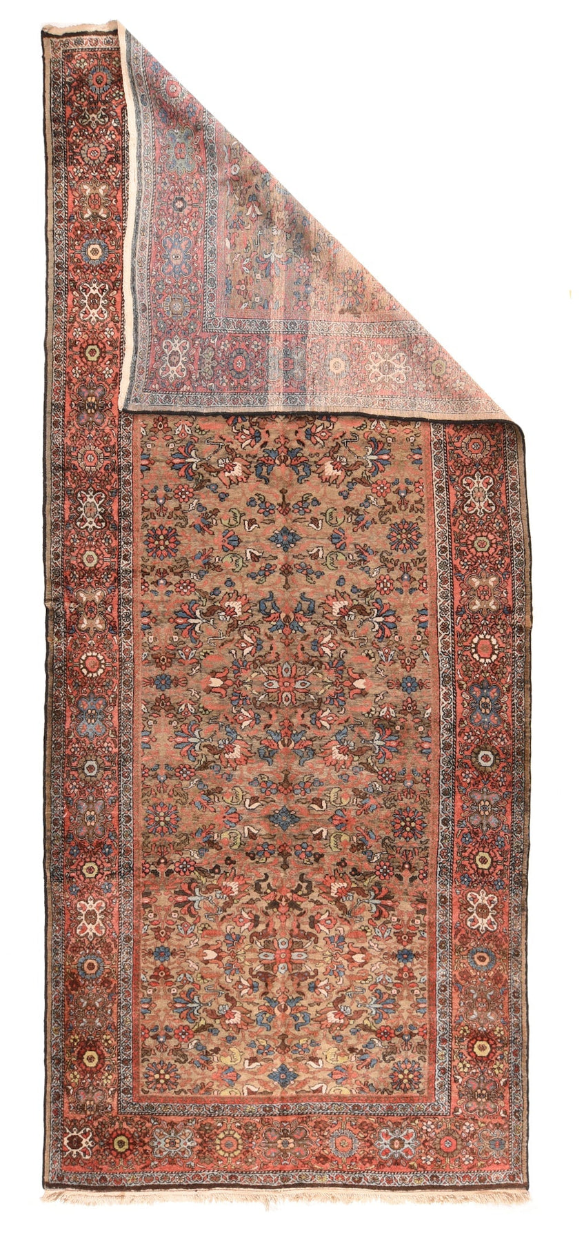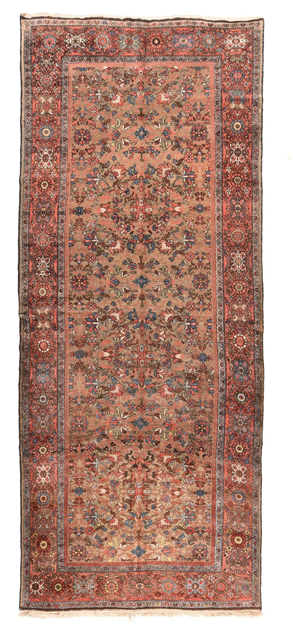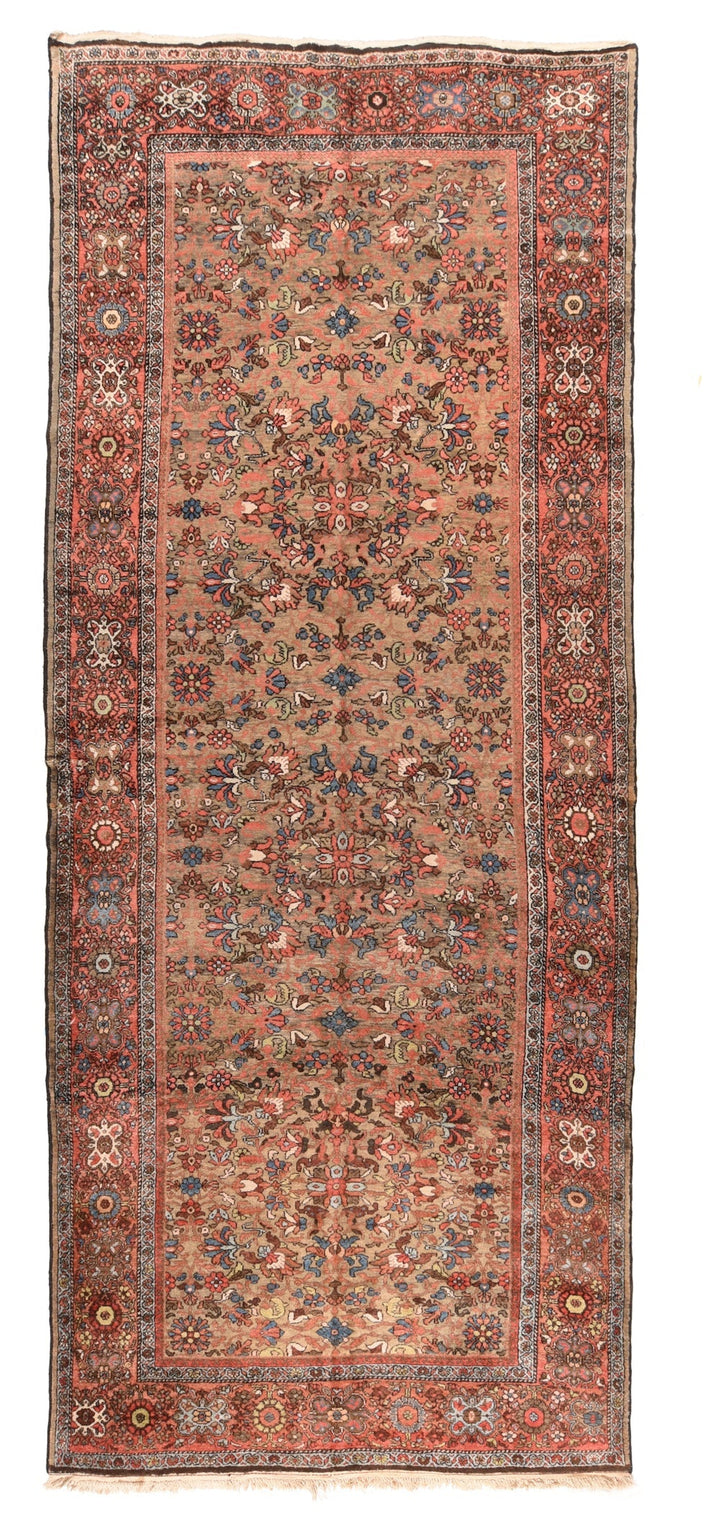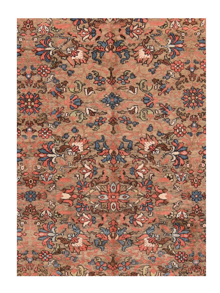 The noticeably abrashed salmon-camel field shows a fairly close pattern of palmettes, rosettes, pointed small crosses and short stems, all in shades of light blue, straw yellow, cream, rust, powder blue and salmon. Salmon-rust border with characteristic Arak alternation of rosettes and octofoil cartouches, with yellow, red, light blue and ecru details prominent. Medium-coarse weave on cotton foundation. Good condition.