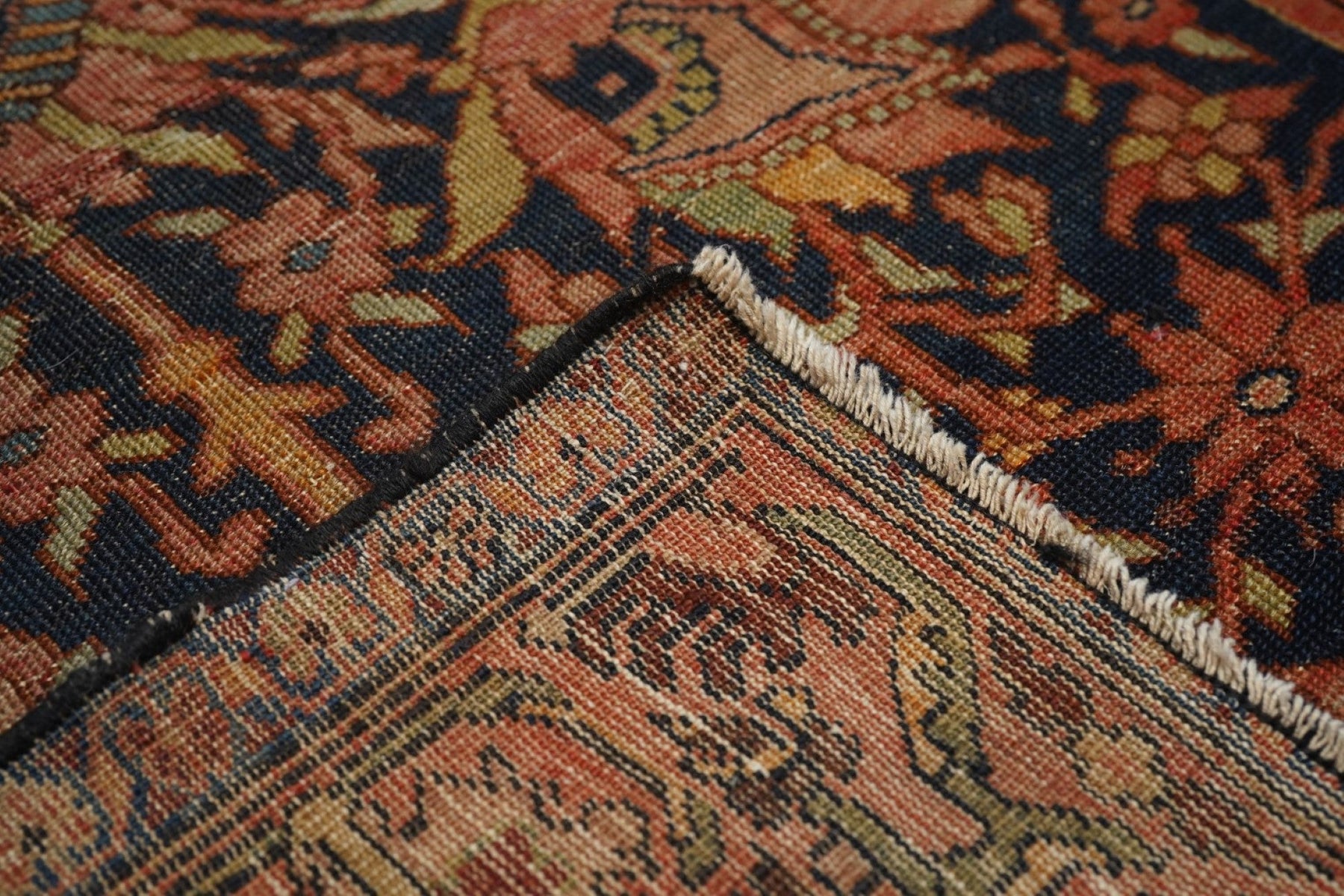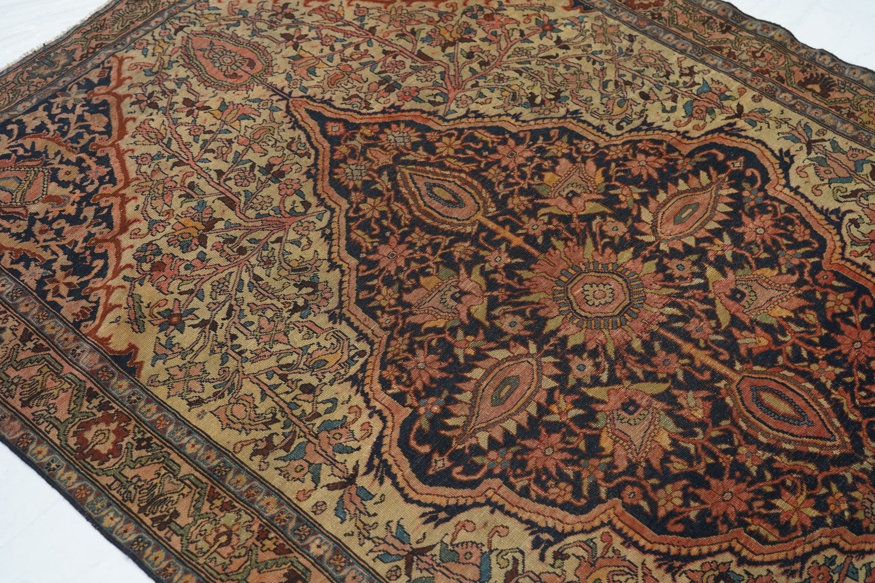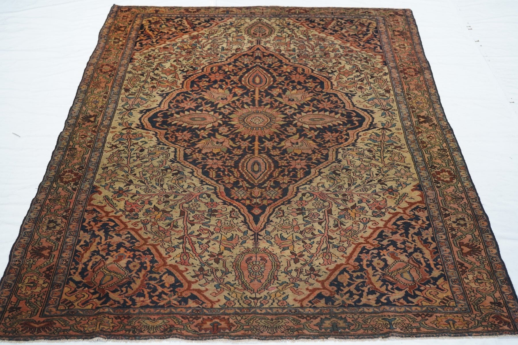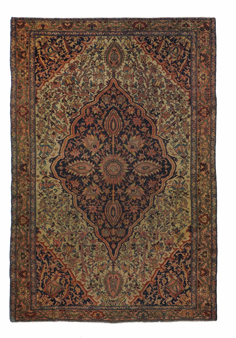 This is a “Mishan”, i.e. urban style, west Persian Malayer, with a palmette pendanted navy medallion with a scalloped edge, and a dominant sunburst rosette and radiating palmette cruciform centre. Ecru-straw field filled with flowers and curvy stems, and navy corners with arabesques. Light rose-tan border with triangular palmettes developing from a meander. Fine weave on cotton, thin and flexible.